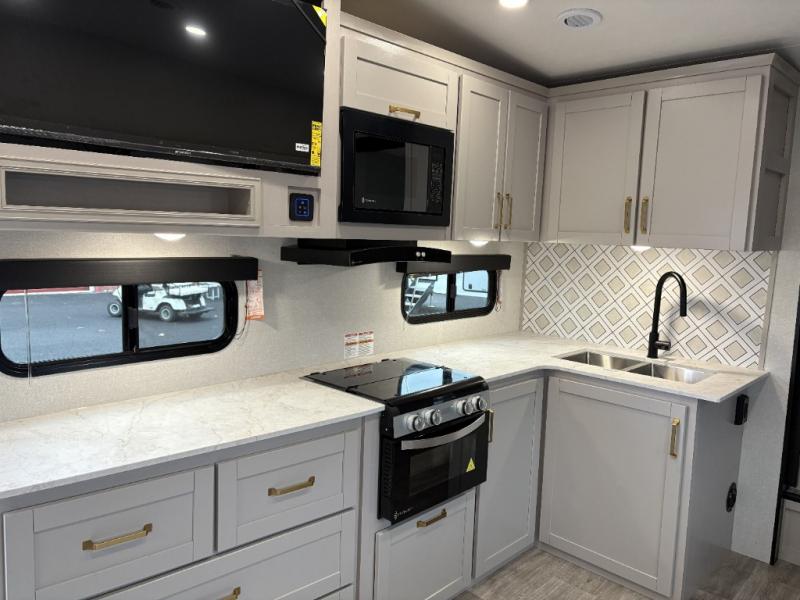 This fifth wheel's spacious interior boasts double-sized bunk beds designed for kids or guests, providing a comfortable sleeping space. A U-shaped dinette that offers ample seating and dining space for meals or even more sleeping space, as well as the 60” tri-fold sofa, which provides additional seating and can be converted into a comfortable sleeping area. In the kitchen area, you will find many amenities to cook delicious meals, such as a microwave, refrigerator, and overhead cabinets that will allow you to keep everything organized. The front bed is spacious, featuring a queen bed ideal for sleeping tight, and the full bath will complete the at-home experience since you will be able to take a refreshing shower on hot days!