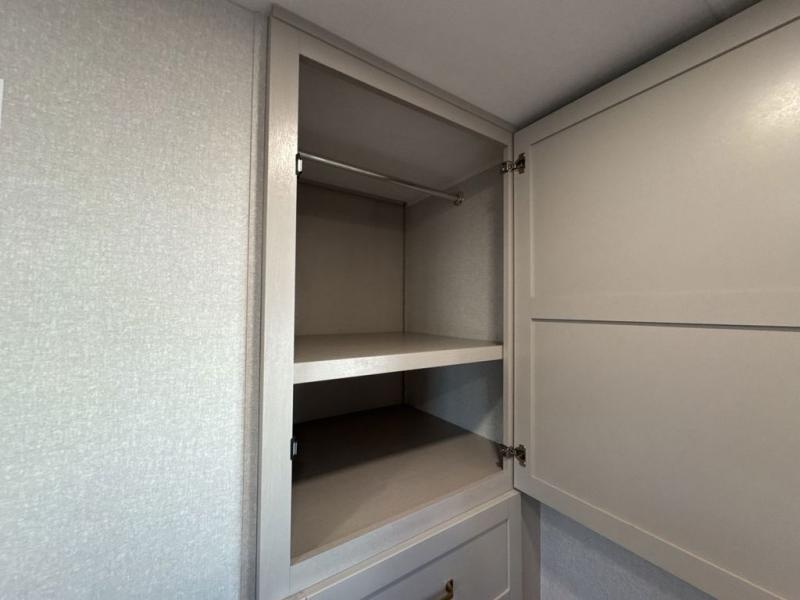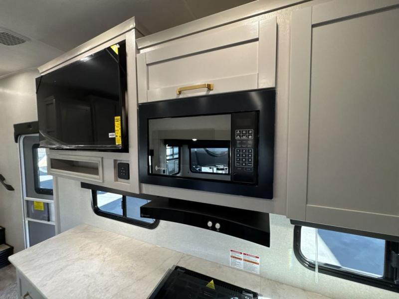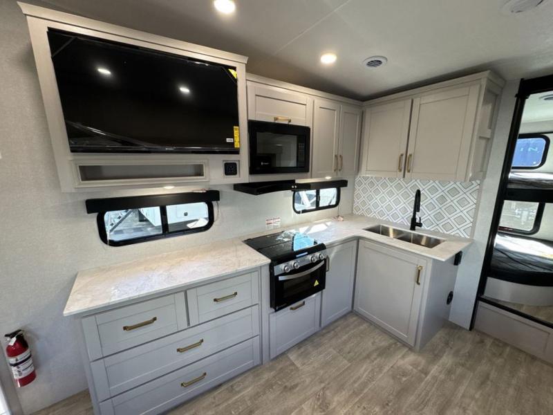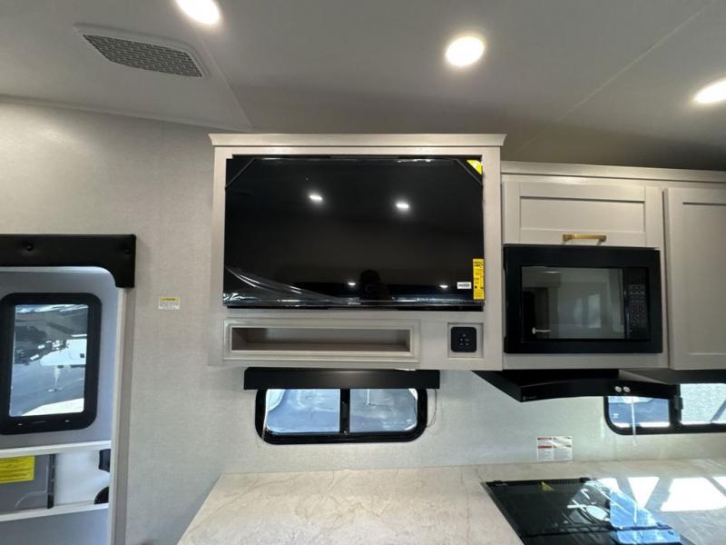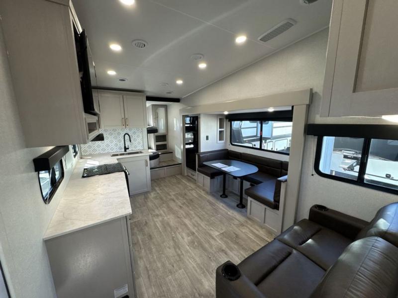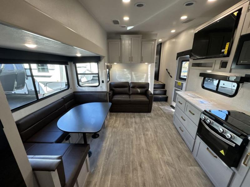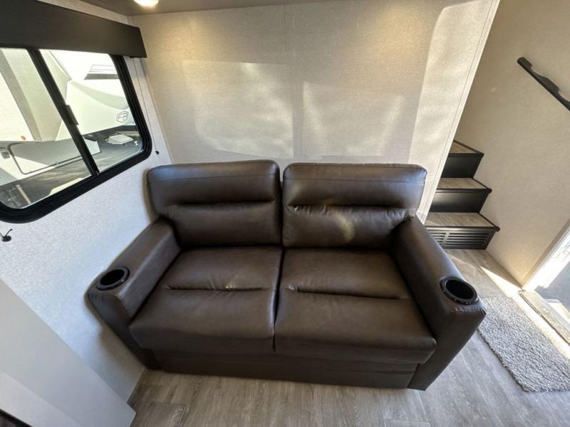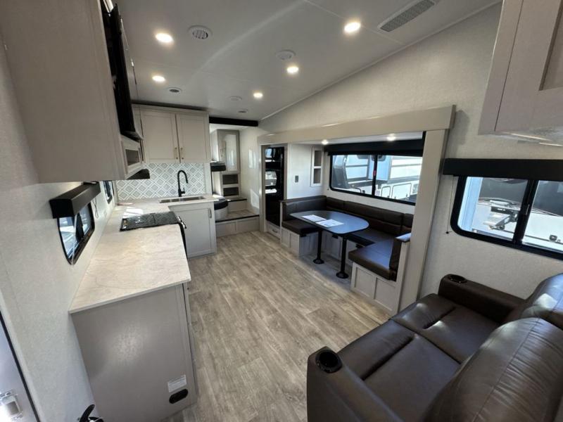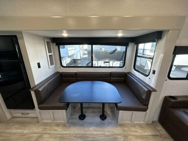 This fifth wheel's spacious interior boasts double-sized bunk beds designed for kids or guests, providing a comfortable sleeping space. A U-shaped dinette that offers ample seating and dining space for meals or even more sleeping space, as well as the 60” tri-fold sofa, which provides additional seating and can be converted into a comfortable sleeping area. In the kitchen area, you will find many amenities to cook delicious meals, such as a microwave, refrigerator, and overhead cabinets that will allow you to keep everything organized. The front bed is spacious, featuring a queen bed ideal for sleeping tight, and the full bath will complete the at-home experience since you will be able to take a refreshing shower on hot days!