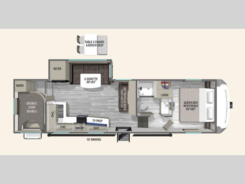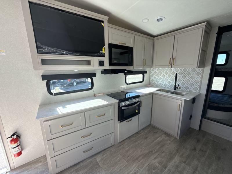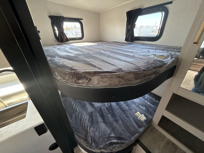 This fifth wheel's spacious interior boasts double-sized bunk beds designed for kids or guests, providing a comfortable sleeping space. A U-shaped dinette that offers ample seating and dining space for meals or even more sleeping space, as well as the 60” tri-fold sofa, which provides additional seating and can be converted into a comfortable sleeping area. In the kitchen area, you will find many amenities to cook delicious meals, such as a microwave, refrigerator, and overhead cabinets that will allow you to keep everything organized. The front bed is spacious, featuring a queen bed ideal for sleeping tight, and the full bath will complete the at-home experience since you will be able to take a refreshing shower on hot days!