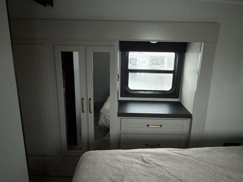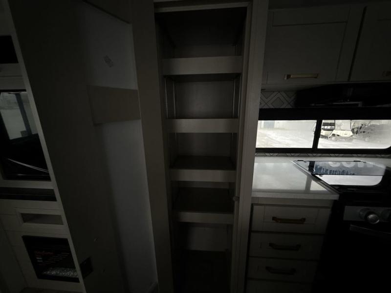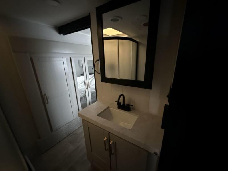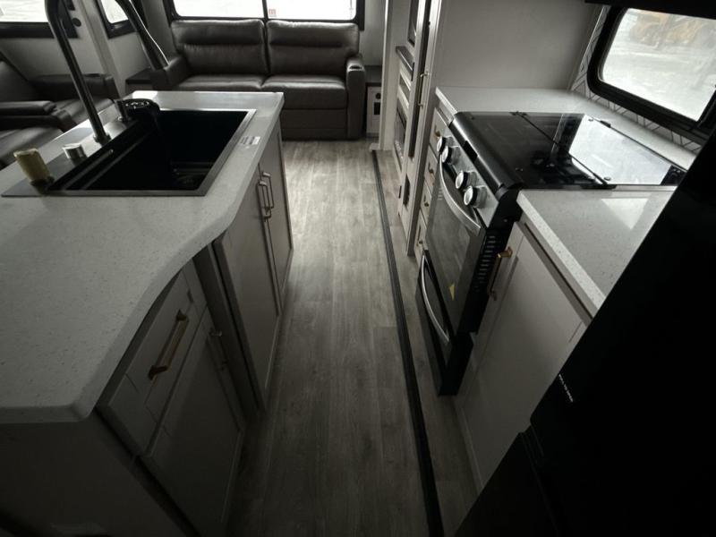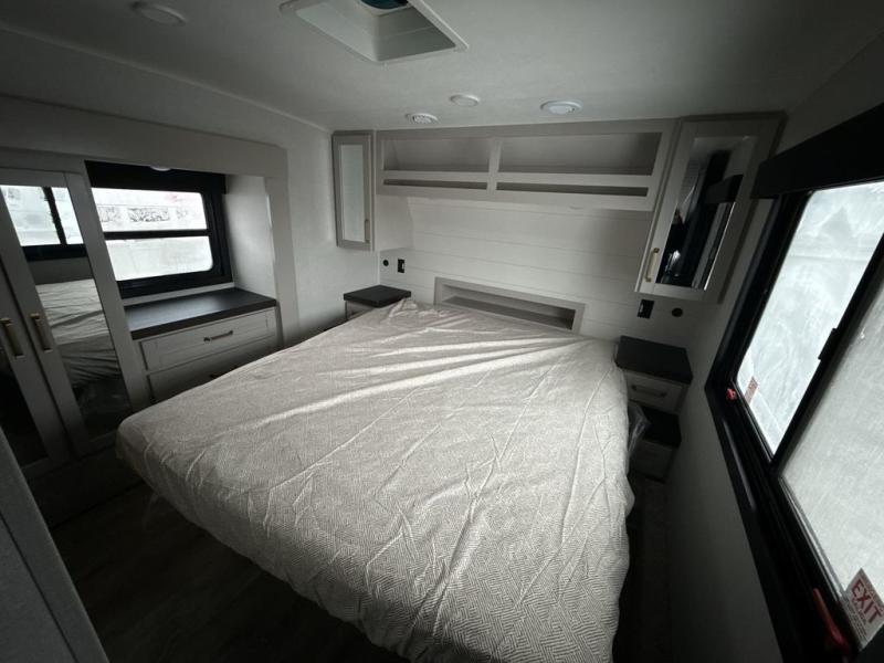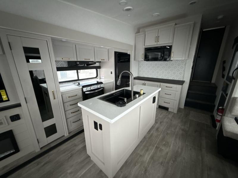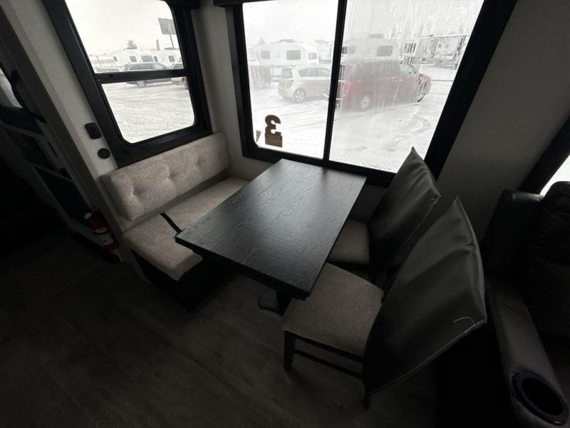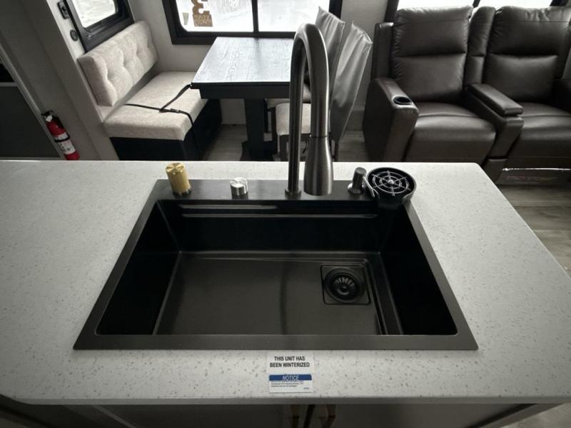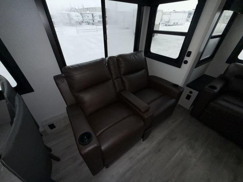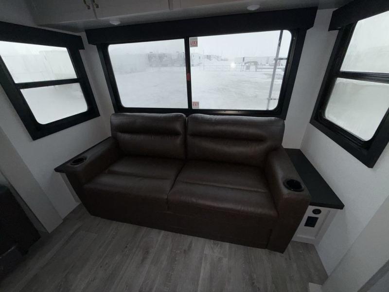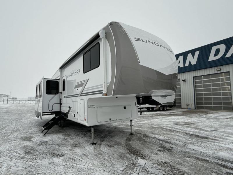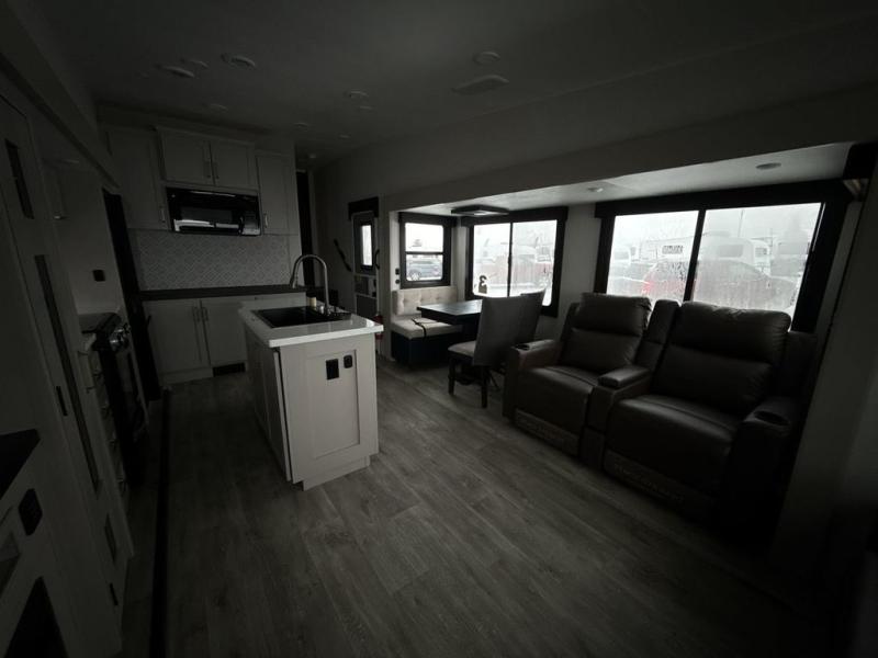 This Sundance Fifth Wheel offers a luxurious living experience on the road! The rear living area is the heart of the RV, featuring a tri-fold sofa that's perfect for relaxation and entertainment. The theater seating provides ample seating for family and friends, while the entertainment center offers endless entertainment options. The kitchen is equipped with a pantry, a kitchen island that offers additional counter space and storage, a refrigerator, a sink that's conveniently located for food preparation and cleanup, and a microwave. Plus, a table with chairs and a bench seat offers a comfortable dining space. The full bathroom is designed for comfort and convenience, providing a private space for personal care. The serene front bedroom features an Olympic bed that provides a comfortable sleeping space