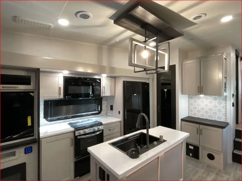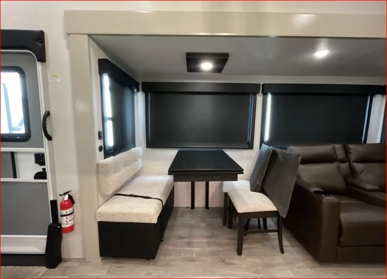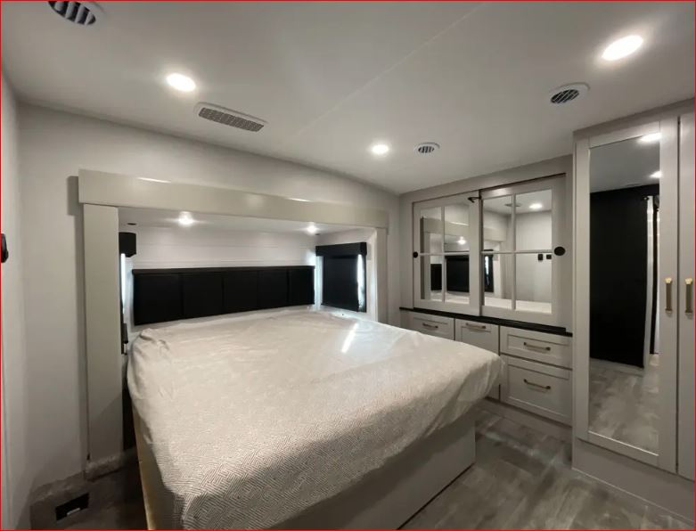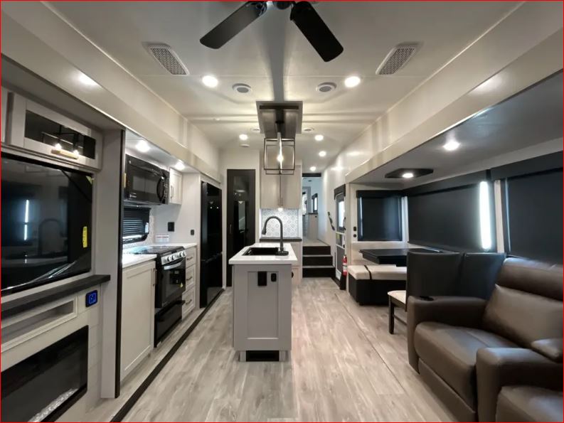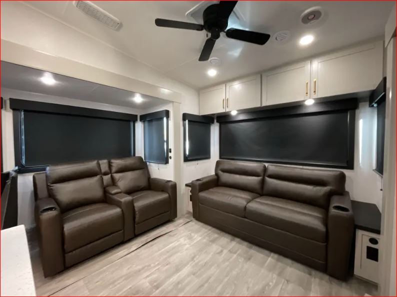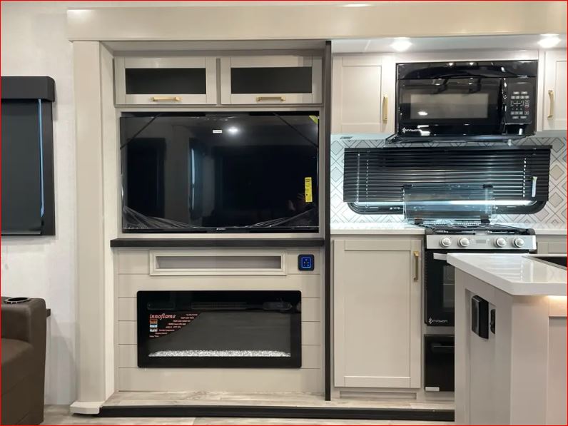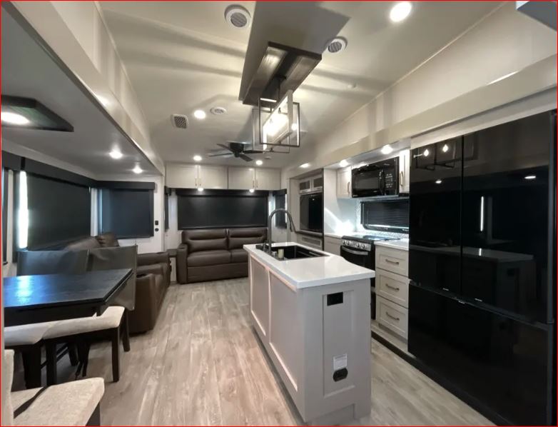This RV offers a luxurious living experience on the road. The rear living area boasts a tri-fold sofa, a theater sofa that provides ample seating for relaxation and entertainment, and the entertainment center with a fireplace is the perfect spot to unwind on chilly evenings, while the ceiling fan keeps the air circulating on warm days. The kitchen is equipped with a kitchen island that provides additional counter space and storage, a microwave, a 12V refrigerator, a table with chairs and a bench seat that offers a comfortable dining space. Plus, the hutch and pantry provide ample storage for dishes, cookware, and food. The full bathroom is designed for comfort and convenience. The front bedroom is a serene retreat, featuring a king bed and a dresser that provide a comfortable sleeping space for sleeping tight all night long.