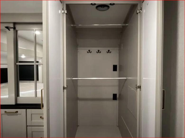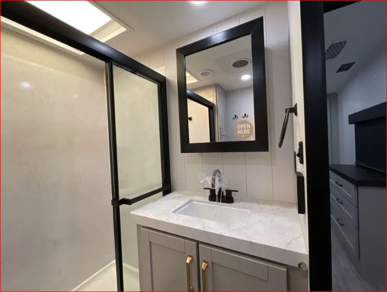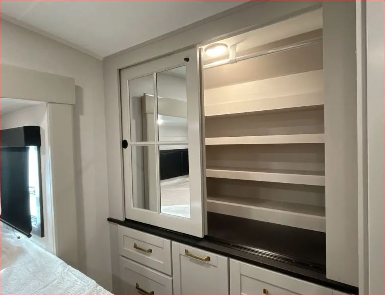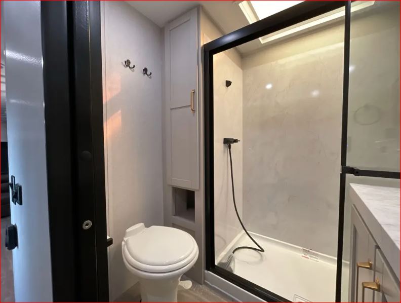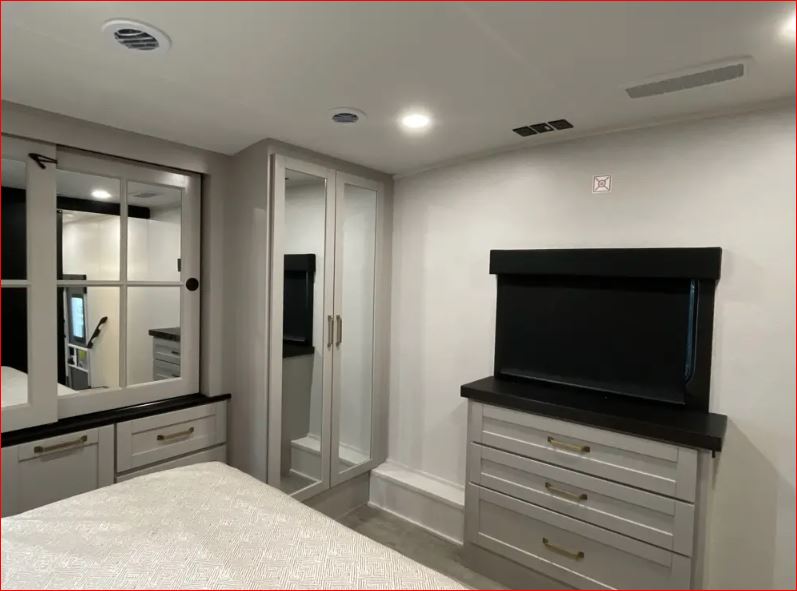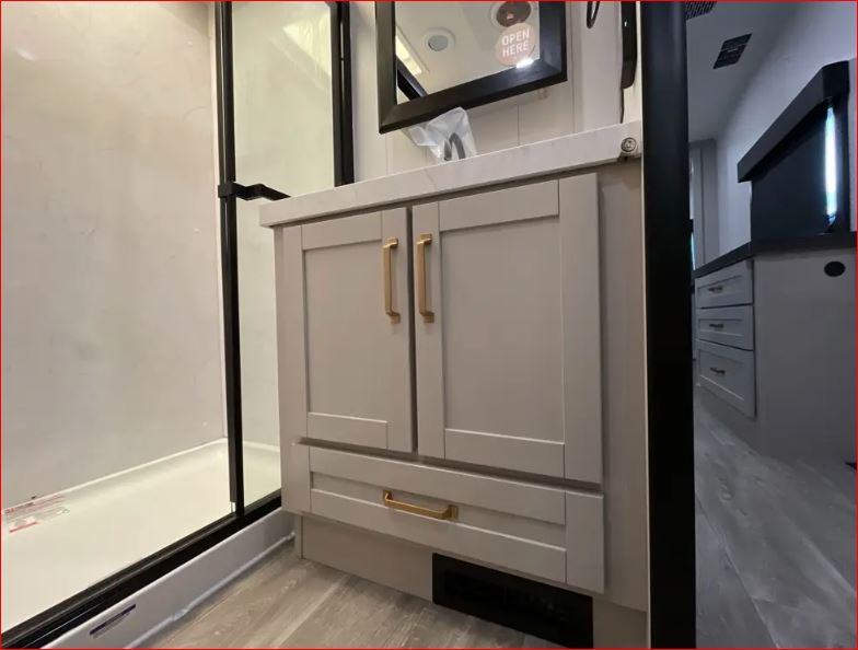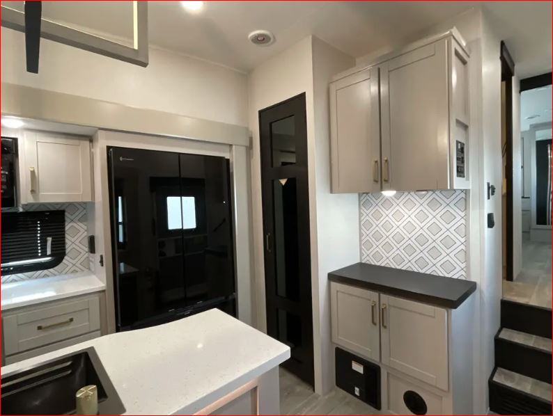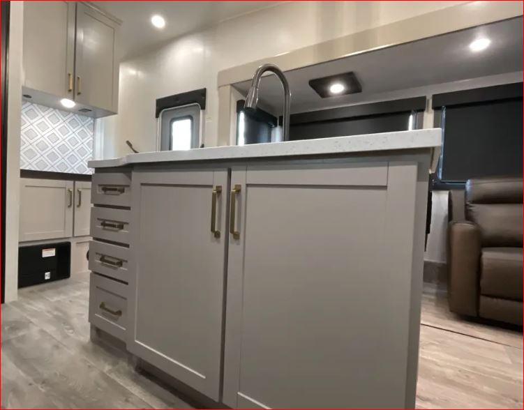 This RV offers a luxurious living experience on the road. The rear living area boasts a tri-fold sofa, a theater sofa that provides ample seating for relaxation and entertainment, and the entertainment center with a fireplace is the perfect spot to unwind on chilly evenings, while the ceiling fan keeps the air circulating on warm days. The kitchen is equipped with a kitchen island that provides additional counter space and storage, a microwave, a 12V refrigerator, a table with chairs and a bench seat that offers a comfortable dining space. Plus, the hutch and pantry provide ample storage for dishes, cookware, and food. The full bathroom is designed for comfort and convenience. The front bedroom is a serene retreat, featuring a king bed and a dresser that provide a comfortable sleeping space for sleeping tight all night long.