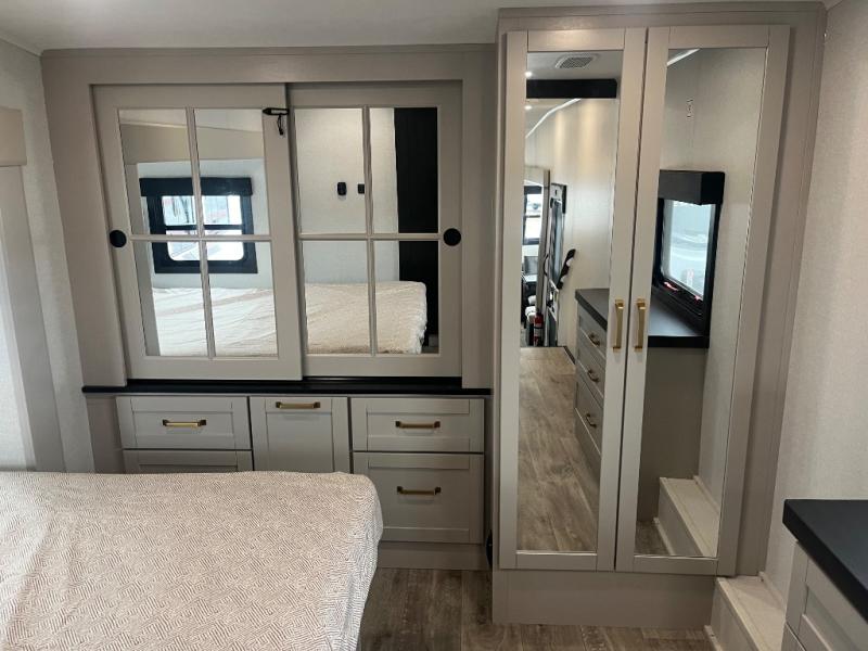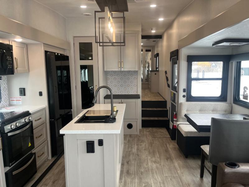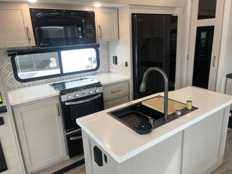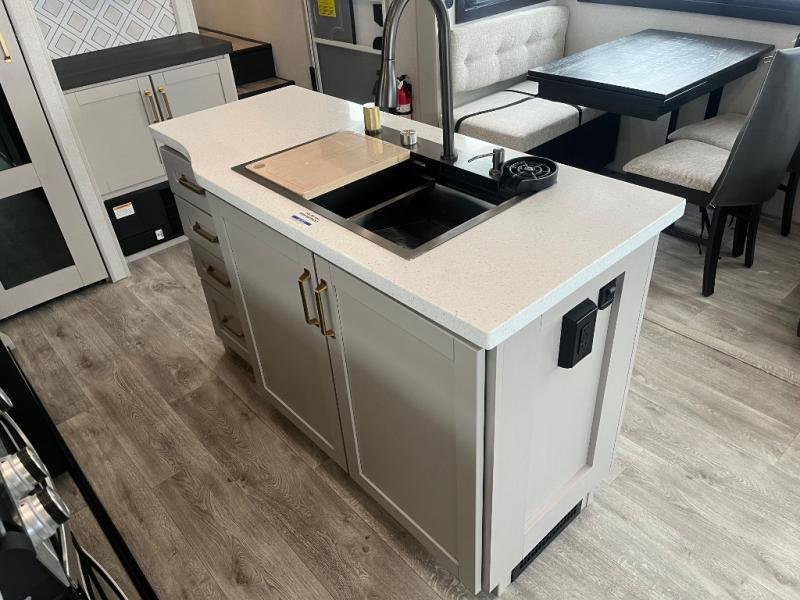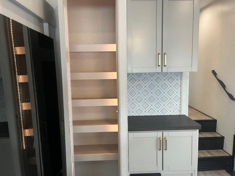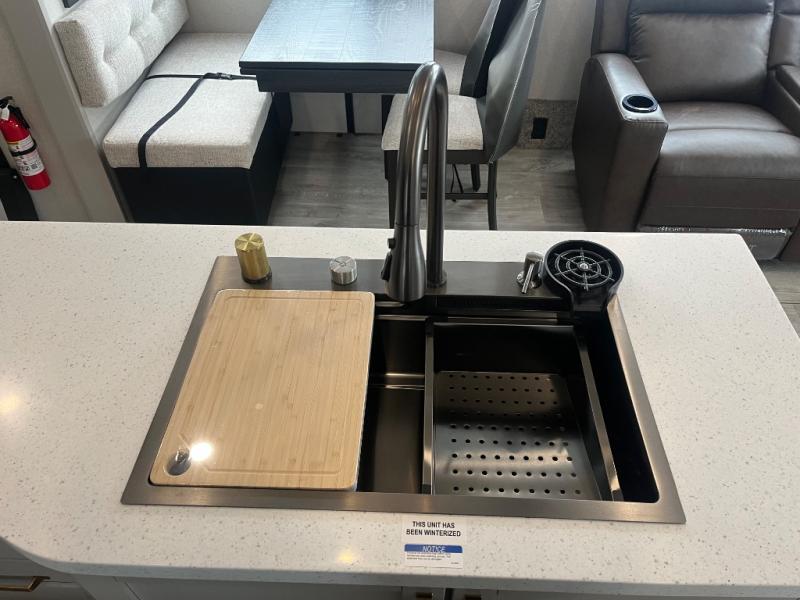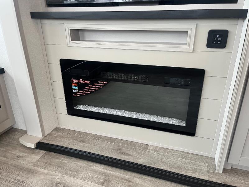 This RV offers a luxurious living experience on the road. The rear living area boasts a tri-fold sofa, a theater sofa that provides ample seating for relaxation and entertainment, and the entertainment center with a fireplace is the perfect spot to unwind on chilly evenings, while the ceiling fan keeps the air circulating on warm days. The kitchen is equipped with a kitchen island that provides additional counter space and storage, a microwave, a 12V refrigerator, a table with chairs and a bench seat that offers a comfortable dining space. Plus, the hutch and pantry provide ample storage for dishes, cookware, and food. The full bathroom is designed for comfort and convenience. The front bedroom is a serene retreat, featuring a king bed and a dresser that provide a comfortable sleeping space for sleeping tight all night long.