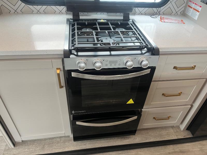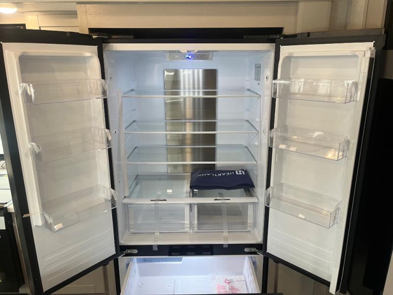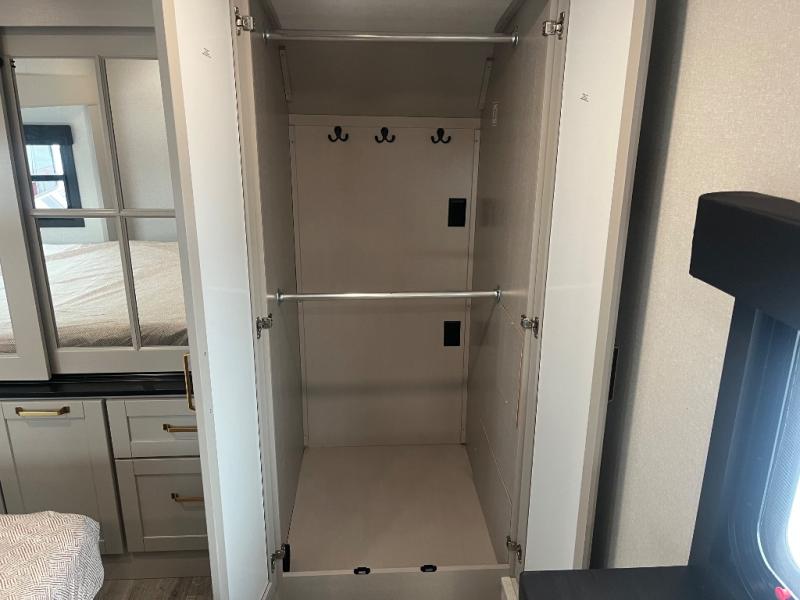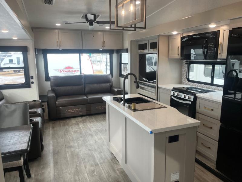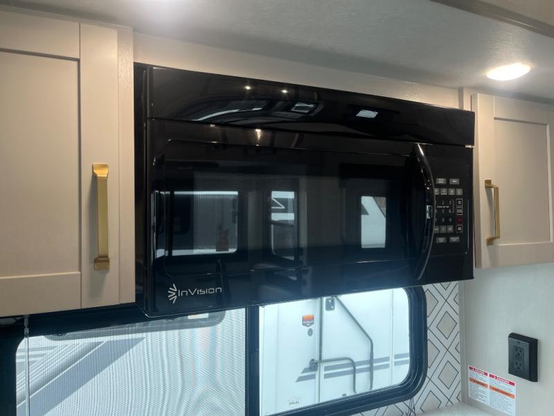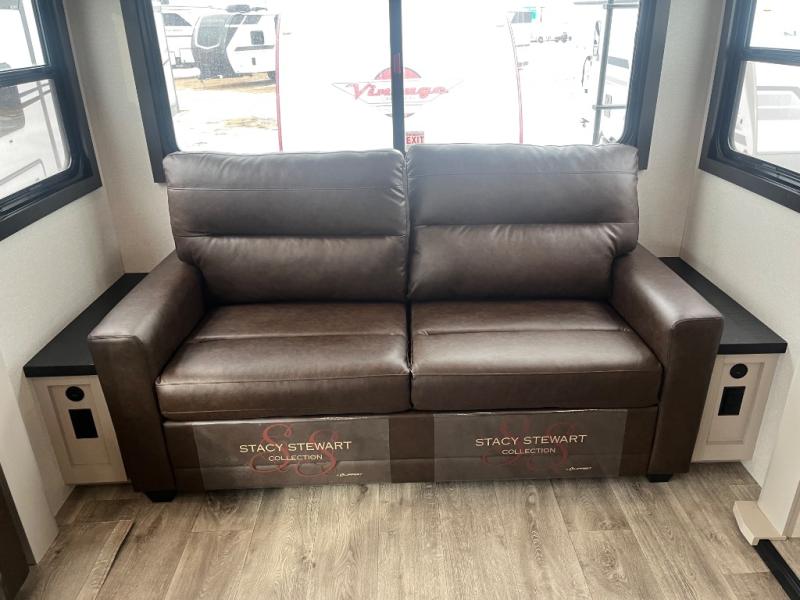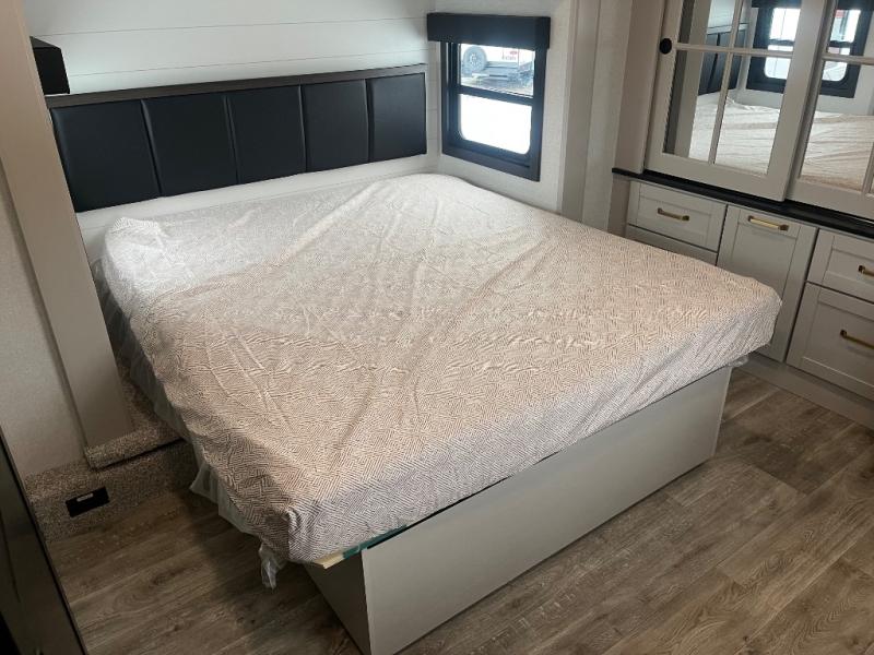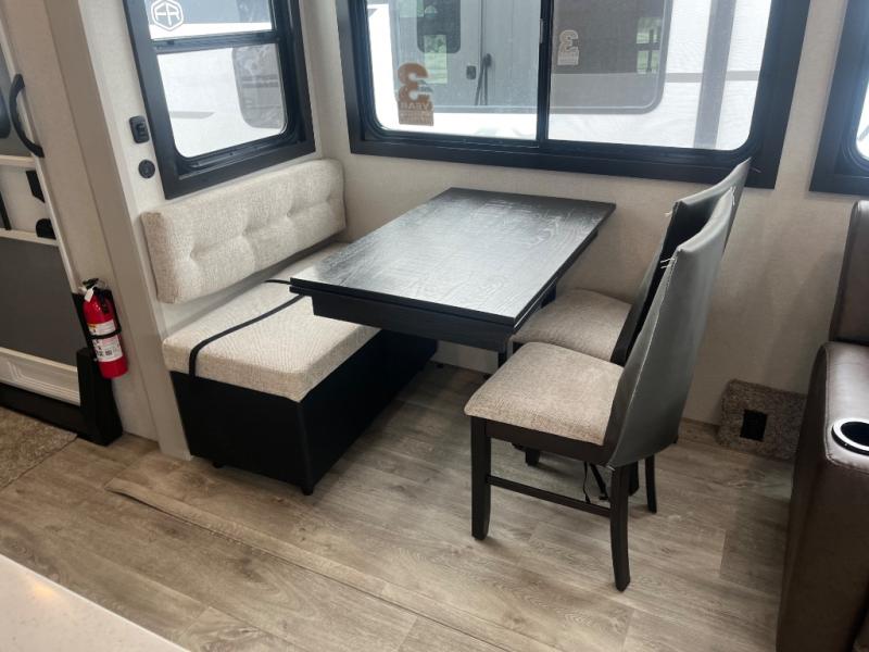 This RV offers a luxurious living experience on the road. The rear living area boasts a tri-fold sofa, a theater sofa that provides ample seating for relaxation and entertainment, and the entertainment center with a fireplace is the perfect spot to unwind on chilly evenings, while the ceiling fan keeps the air circulating on warm days. The kitchen is equipped with a kitchen island that provides additional counter space and storage, a microwave, a 12V refrigerator, a table with chairs and a bench seat that offers a comfortable dining space. Plus, the hutch and pantry provide ample storage for dishes, cookware, and food. The full bathroom is designed for comfort and convenience. The front bedroom is a serene retreat, featuring a king bed and a dresser that provide a comfortable sleeping space for sleeping tight all night long.