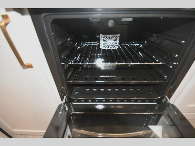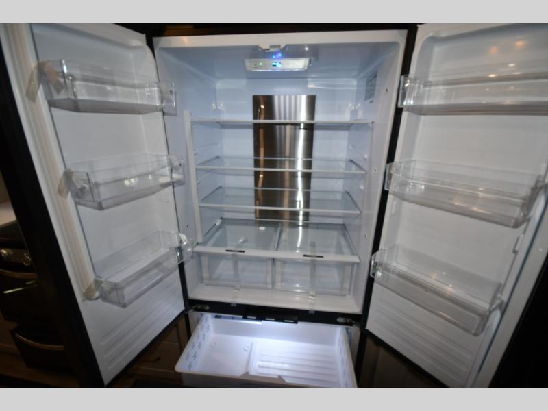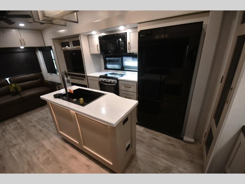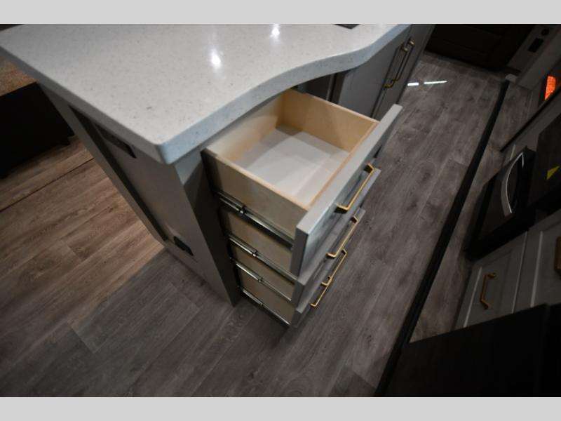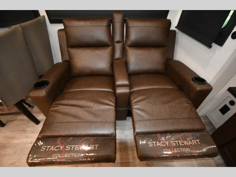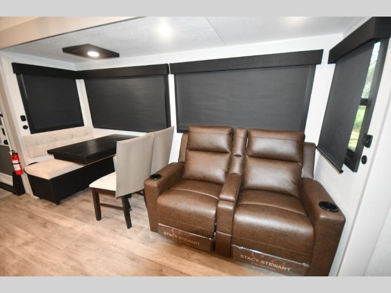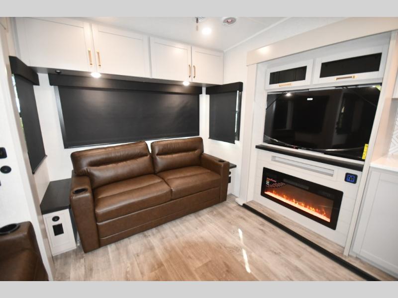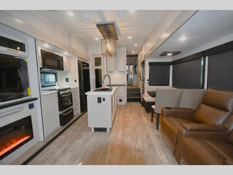 This RV offers a luxurious living experience on the road. The rear living area boasts a tri-fold sofa, a theater sofa that provides ample seating for relaxation and entertainment, and the entertainment center with a fireplace is the perfect spot to unwind on chilly evenings, while the ceiling fan keeps the air circulating on warm days. The kitchen is equipped with a kitchen island that provides additional counter space and storage, a microwave, a 12V refrigerator, a table with chairs and a bench seat that offers a comfortable dining space. Plus, the hutch and pantry provide ample storage for dishes, cookware, and food. The full bathroom is designed for comfort and convenience. The front bedroom is a serene retreat, featuring a king bed and a dresser that provide a comfortable sleeping space for sleeping tight all night long.