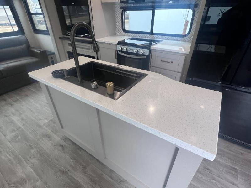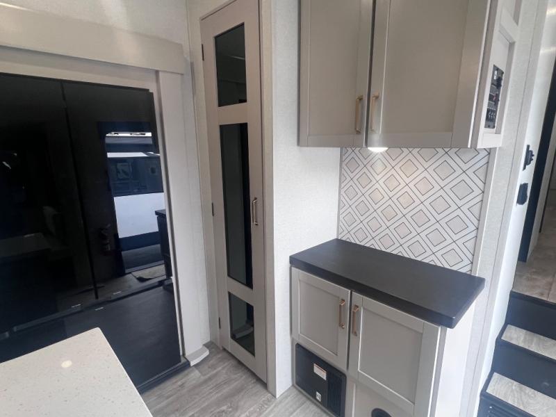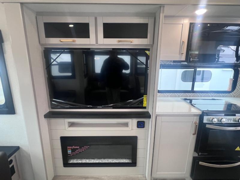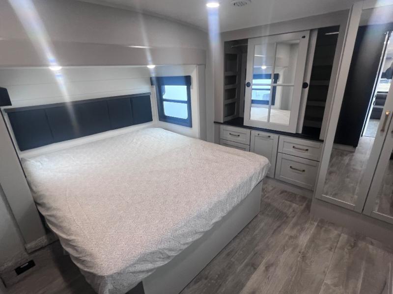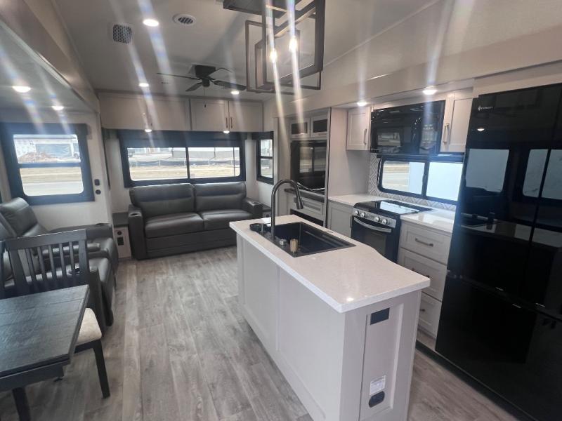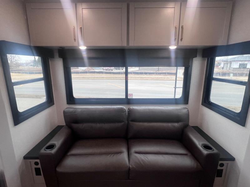 This RV offers a luxurious living experience on the road. The rear living area boasts a tri-fold sofa, a theater sofa that provides ample seating for relaxation and entertainment, and the entertainment center with a fireplace is the perfect spot to unwind on chilly evenings, while the ceiling fan keeps the air circulating on warm days. The kitchen is equipped with a kitchen island that provides additional counter space and storage, a microwave, a 12V refrigerator, a table with chairs and a bench seat that offers a comfortable dining space. Plus, the hutch and pantry provide ample storage for dishes, cookware, and food. The full bathroom is designed for comfort and convenience. The front bedroom is a serene retreat, featuring a king bed and a dresser that provide a comfortable sleeping space for sleeping tight all night long.