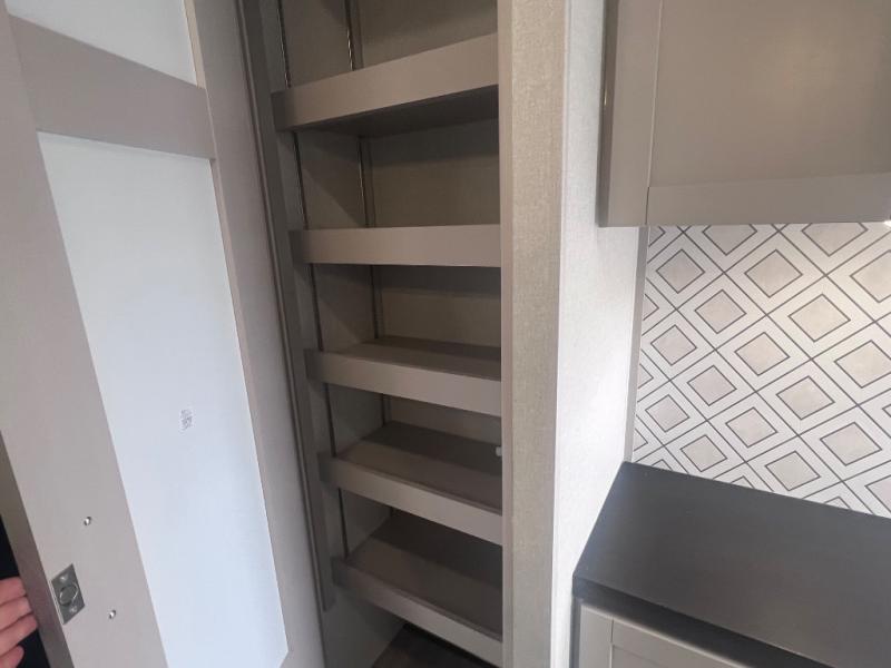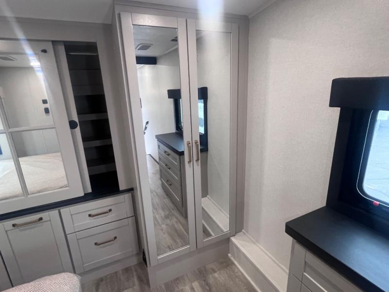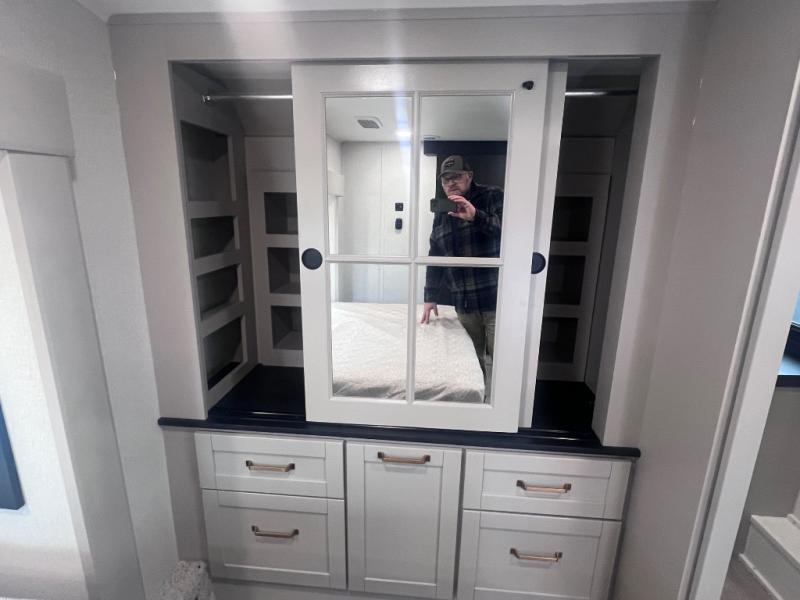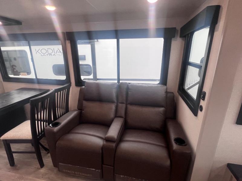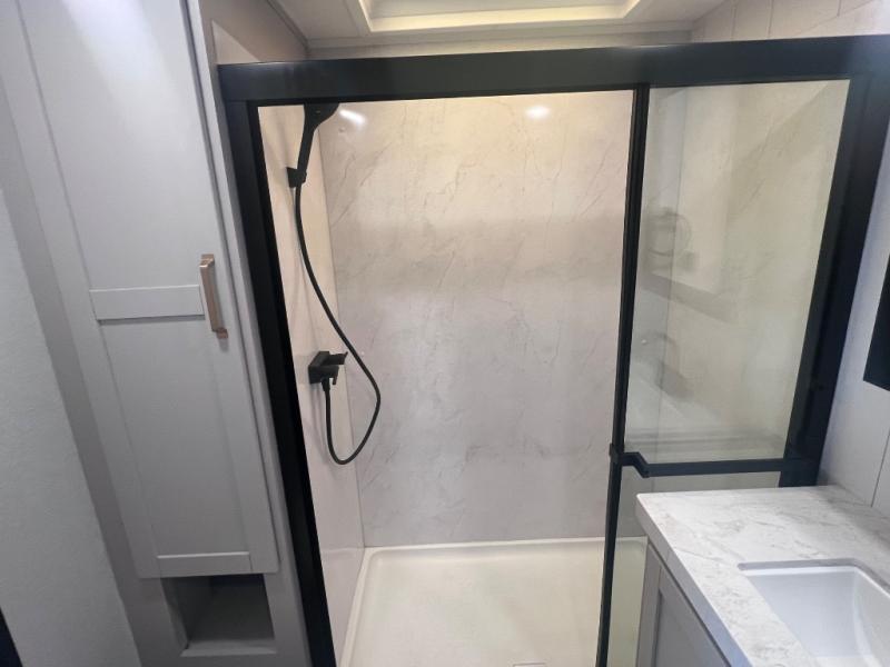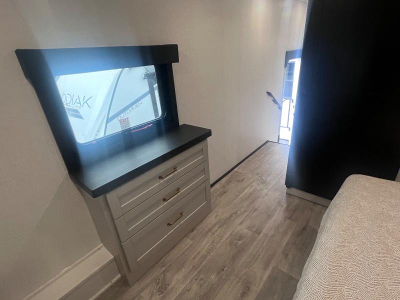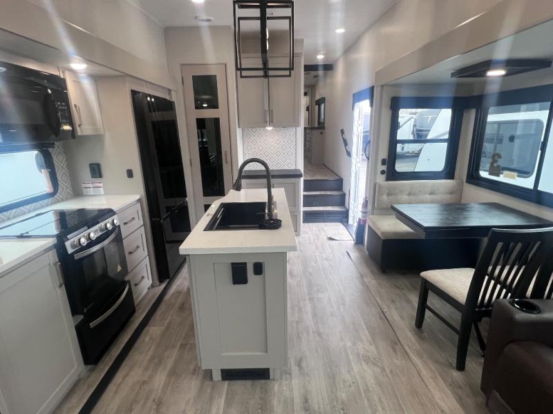 This RV offers a luxurious living experience on the road. The rear living area boasts a tri-fold sofa, a theater sofa that provides ample seating for relaxation and entertainment, and the entertainment center with a fireplace is the perfect spot to unwind on chilly evenings, while the ceiling fan keeps the air circulating on warm days. The kitchen is equipped with a kitchen island that provides additional counter space and storage, a microwave, a 12V refrigerator, a table with chairs and a bench seat that offers a comfortable dining space. Plus, the hutch and pantry provide ample storage for dishes, cookware, and food. The full bathroom is designed for comfort and convenience. The front bedroom is a serene retreat, featuring a king bed and a dresser that provide a comfortable sleeping space for sleeping tight all night long.