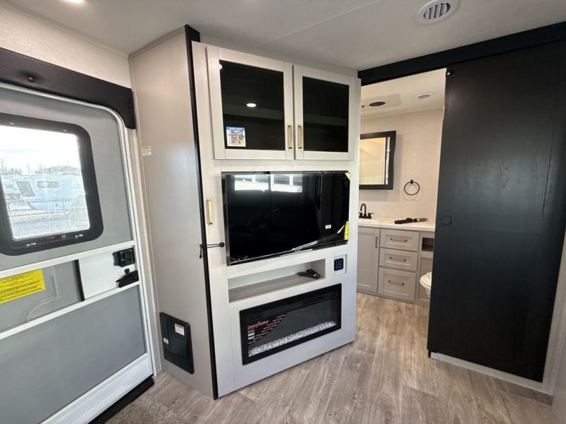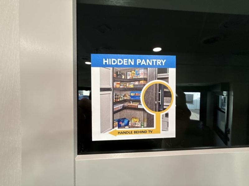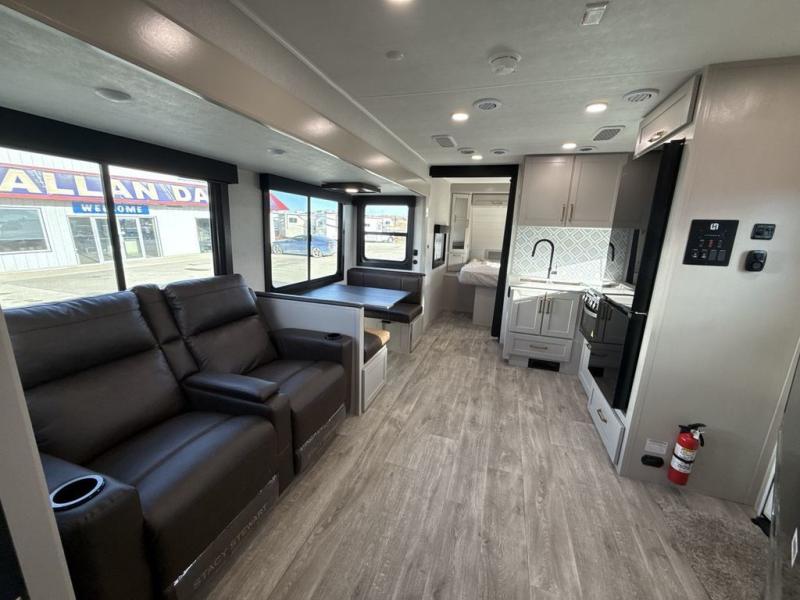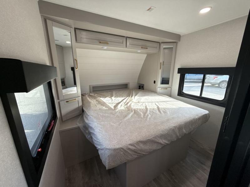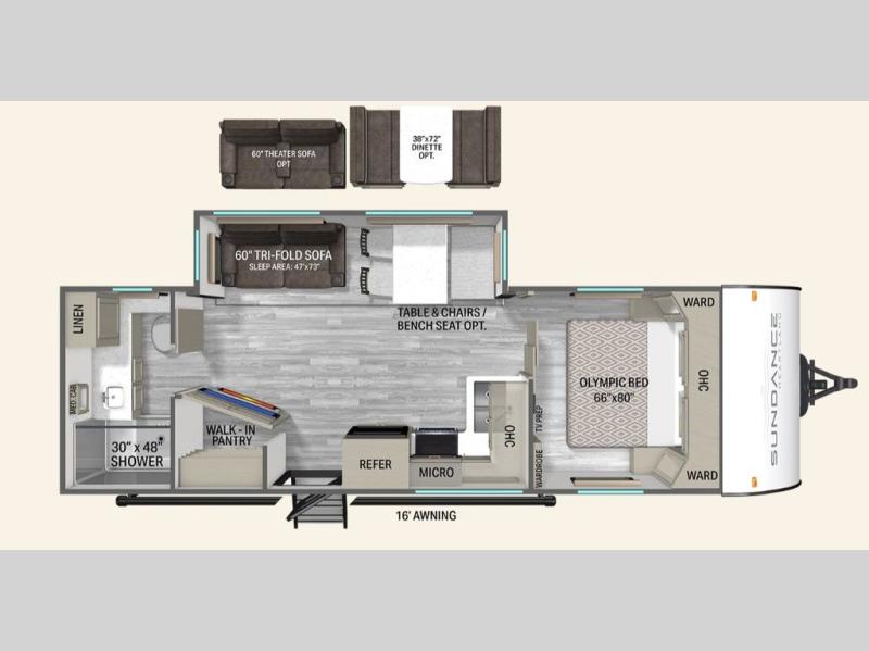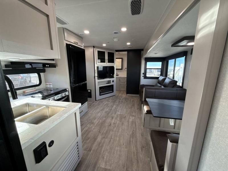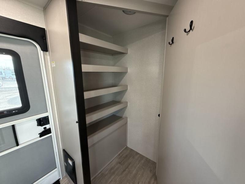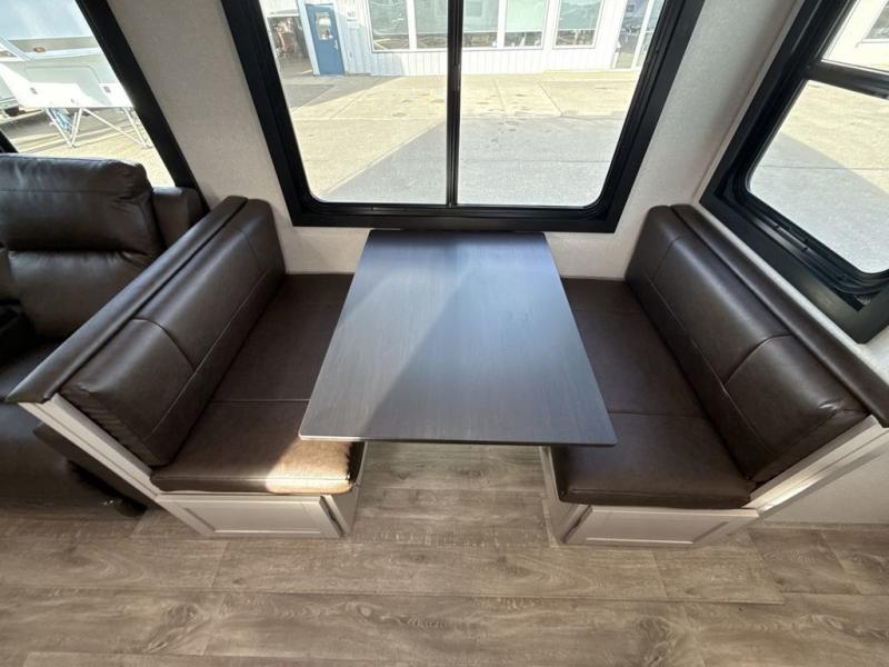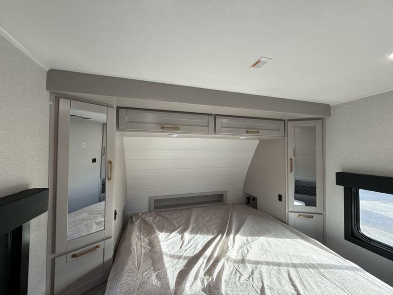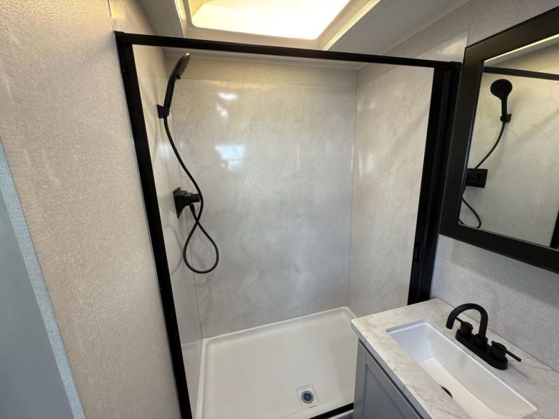 At the front of the trailer, you'll find a private bedroom designed for comfort and convenience, featuring a spacious 66" x 80" Olympic bed flanked by wardrobes on each side and overhead cabinets for storing clothes and essentials. Moving into the center, the main living area offers an L-shaped kitchen equipped with a kitchen faucet with a pull-out sprayer, a 10-cu. ft. 12V refrigerator, and a walk-in pantry perfect for keeping your dry goods organized. Across from the kitchen, a large slide-out houses a 60" tri-fold sofa that doubles as an extra-sleeping space when needed, while a nearby table and chairs provide the perfect spot for meals or game nights. At the rear, the full bathroom includes a roomy 30" x 48" shower, along with a medicine cabinet and linen storage, giving you all the comforts of home without ever needing to leave the trailer.