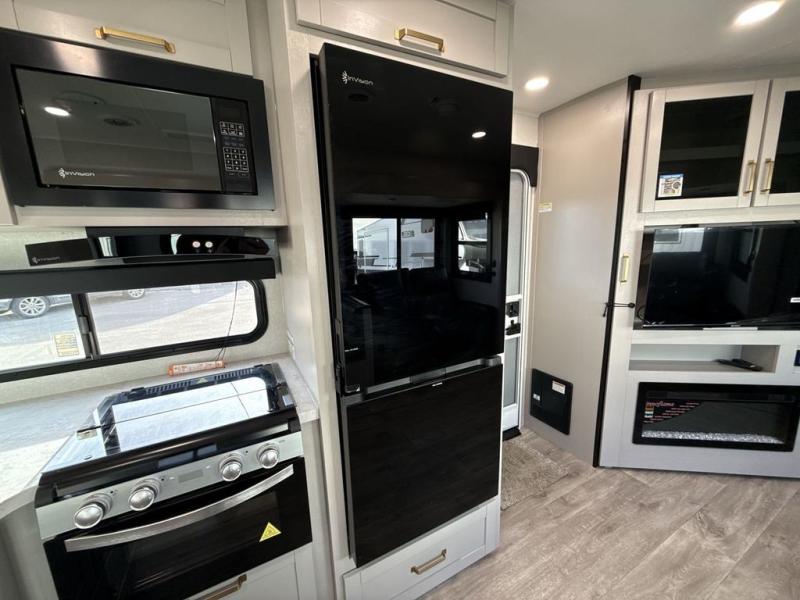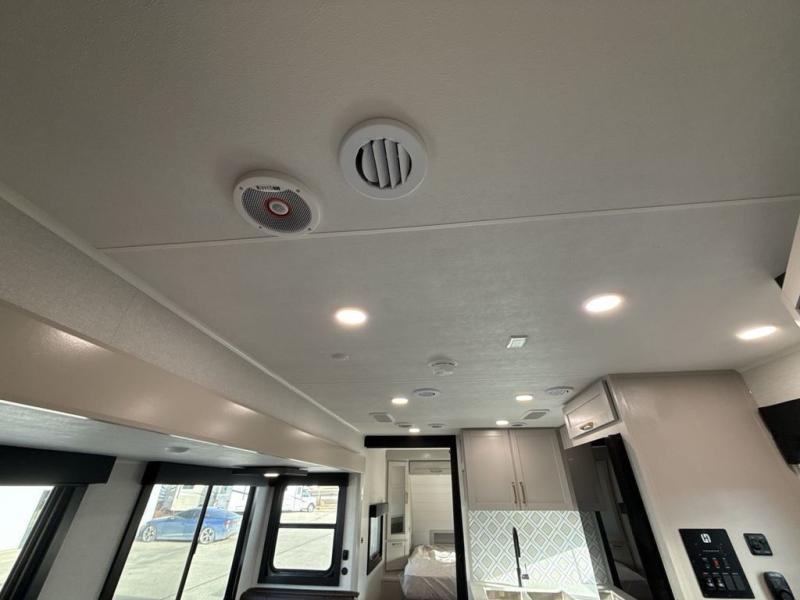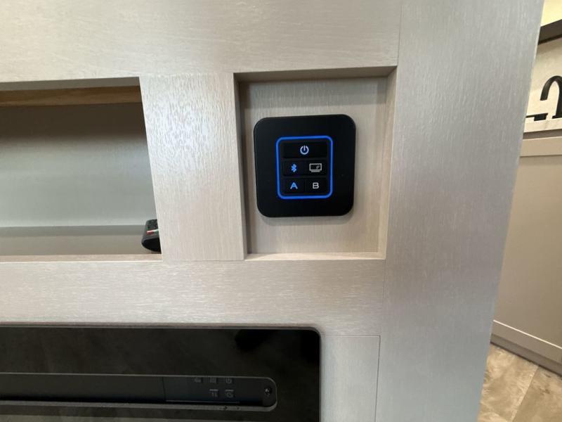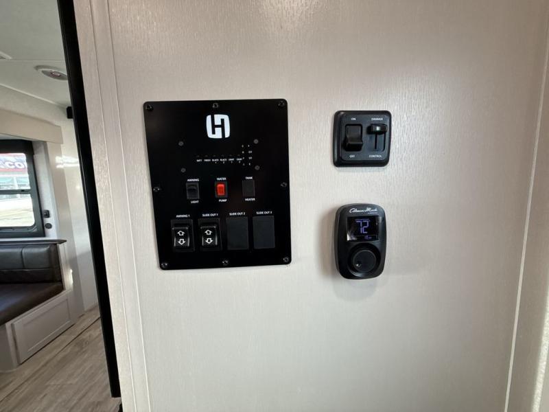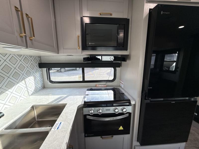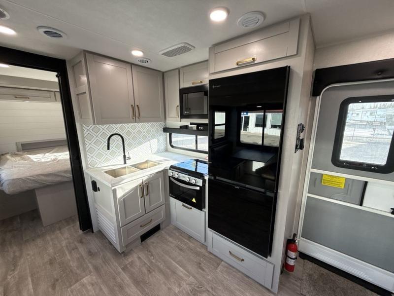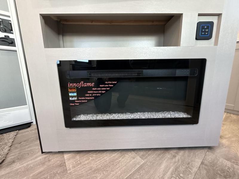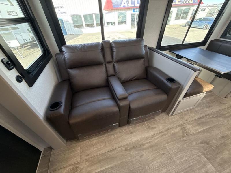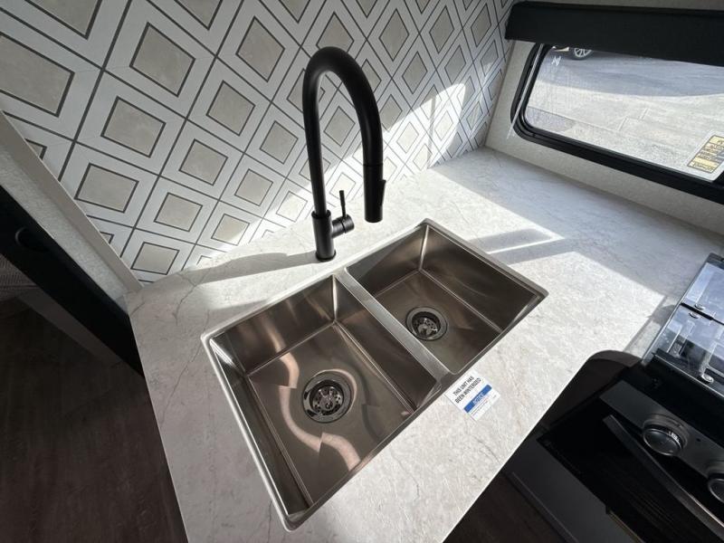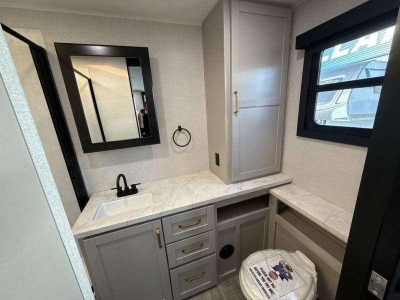 At the front of the trailer, you'll find a private bedroom designed for comfort and convenience, featuring a spacious 66" x 80" Olympic bed flanked by wardrobes on each side and overhead cabinets for storing clothes and essentials. Moving into the center, the main living area offers an L-shaped kitchen equipped with a kitchen faucet with a pull-out sprayer, a 10-cu. ft. 12V refrigerator, and a walk-in pantry perfect for keeping your dry goods organized. Across from the kitchen, a large slide-out houses a 60" tri-fold sofa that doubles as an extra-sleeping space when needed, while a nearby table and chairs provide the perfect spot for meals or game nights. At the rear, the full bathroom includes a roomy 30" x 48" shower, along with a medicine cabinet and linen storage, giving you all the comforts of home without ever needing to leave the trailer.