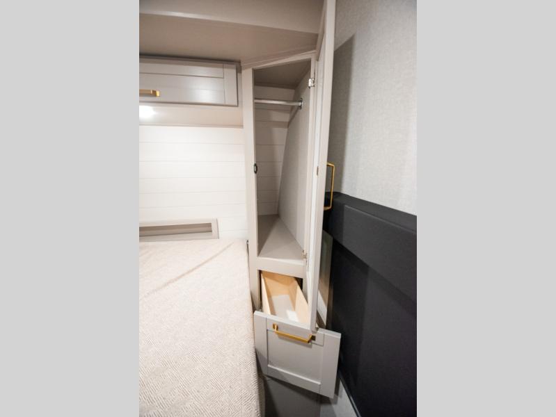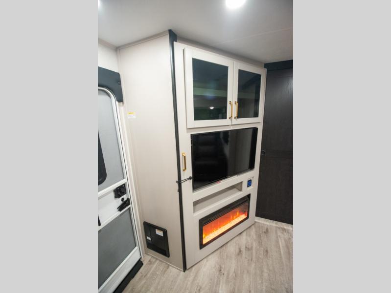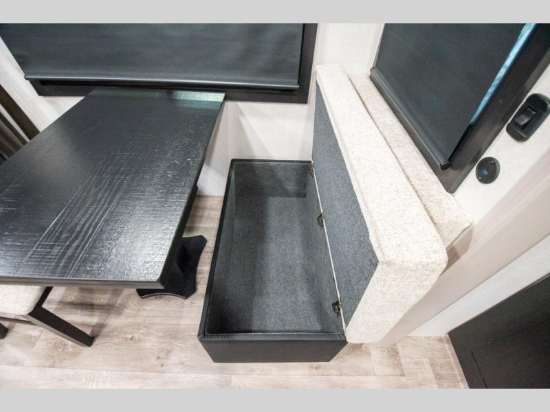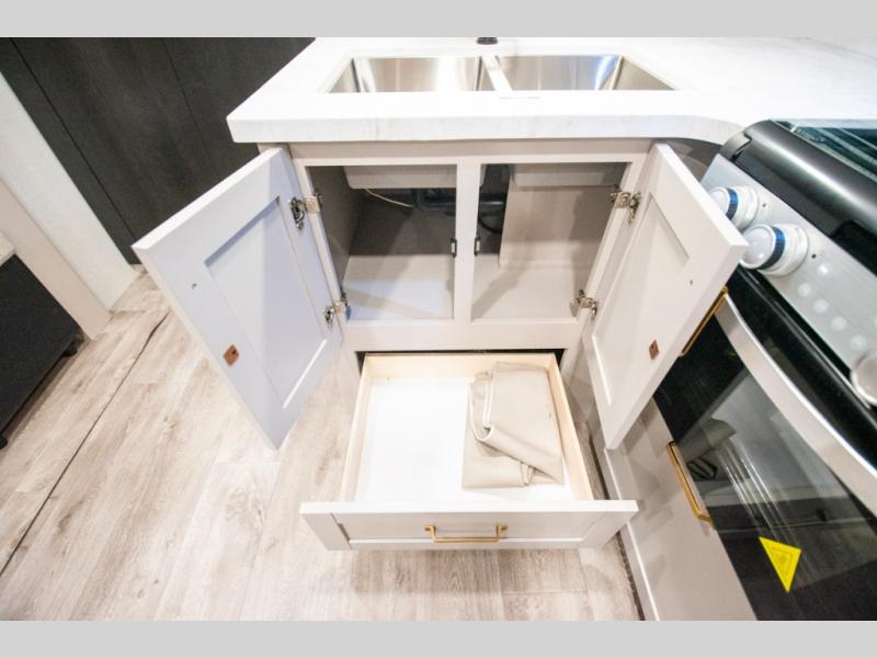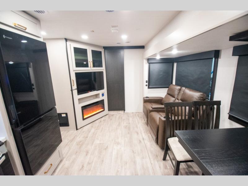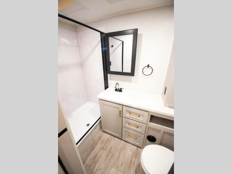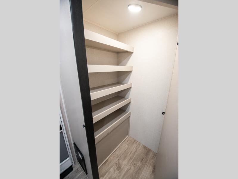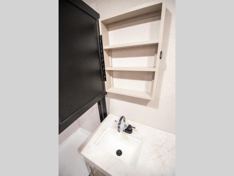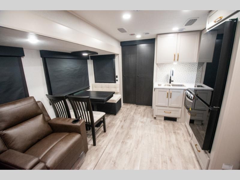 At the front of the trailer, you'll find a private bedroom designed for comfort and convenience, featuring a spacious 66" x 80" Olympic bed flanked by wardrobes on each side and overhead cabinets for storing clothes and essentials. Moving into the center, the main living area offers an L-shaped kitchen equipped with a kitchen faucet with a pull-out sprayer, a 10-cu. ft. 12V refrigerator, and a walk-in pantry perfect for keeping your dry goods organized. Across from the kitchen, a large slide-out houses a 60" tri-fold sofa that doubles as an extra-sleeping space when needed, while a nearby table and chairs provide the perfect spot for meals or game nights. At the rear, the full bathroom includes a roomy 30" x 48" shower, along with a medicine cabinet and linen storage, giving you all the comforts of home without ever needing to leave the trailer.