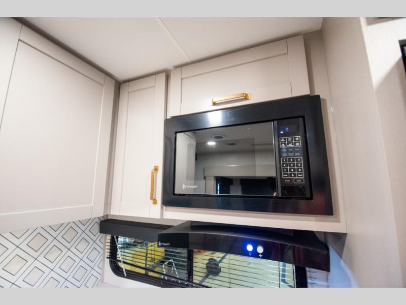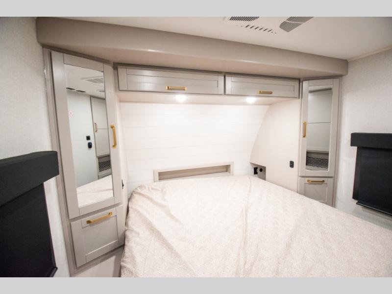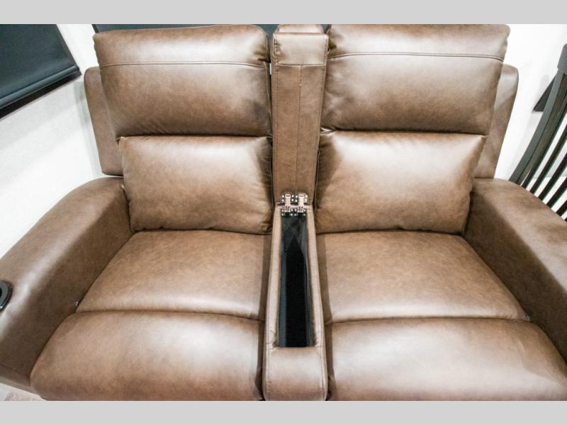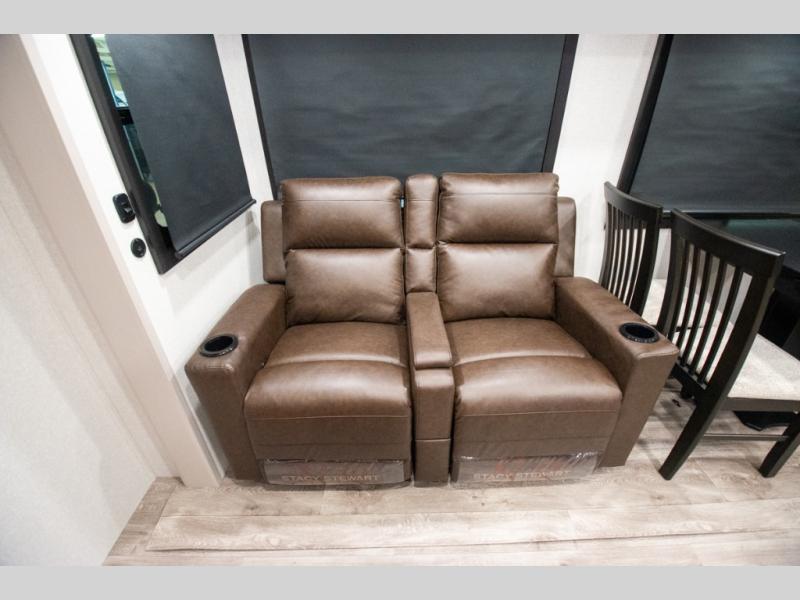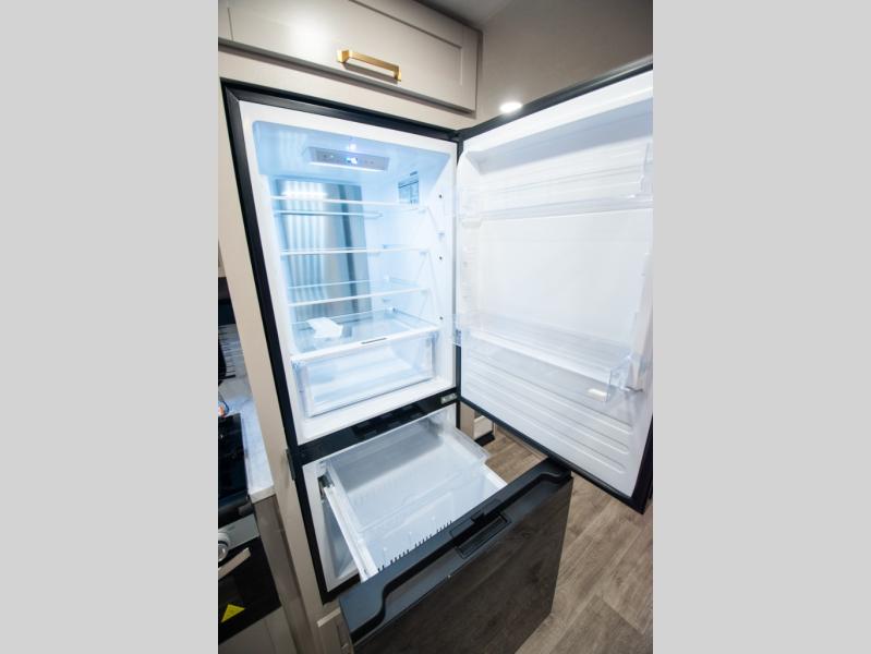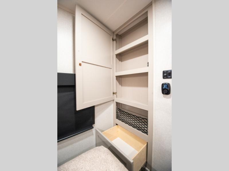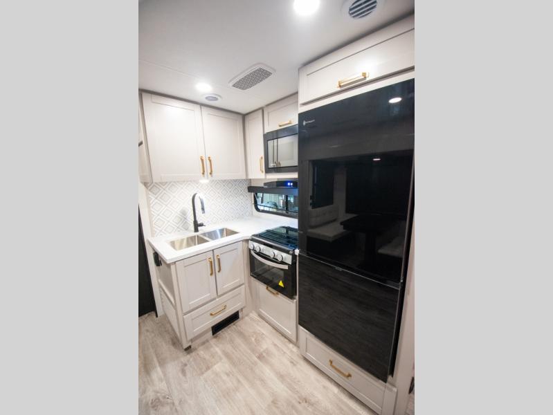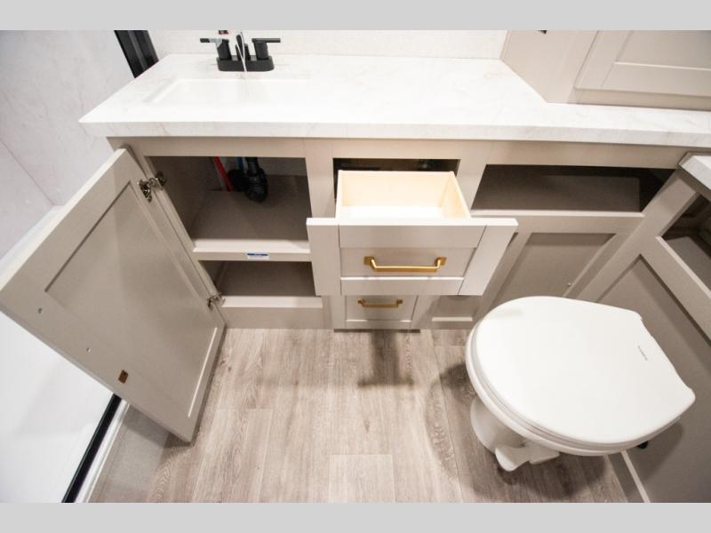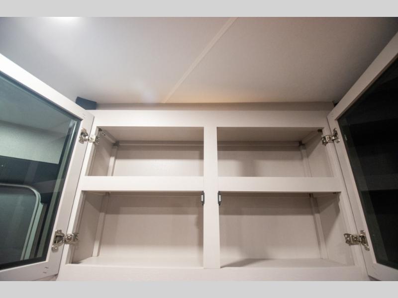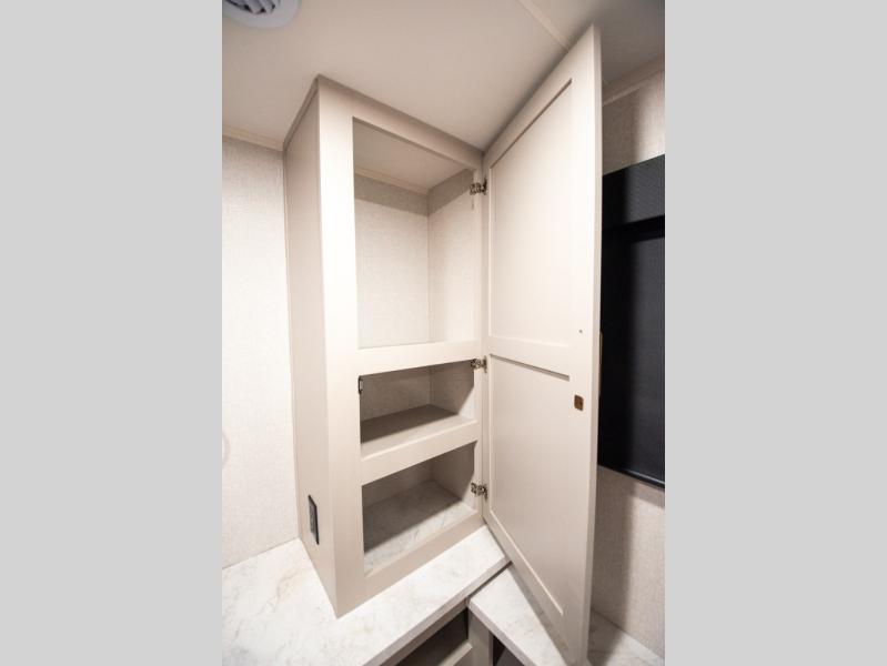 At the front of the trailer, you'll find a private bedroom designed for comfort and convenience, featuring a spacious 66" x 80" Olympic bed flanked by wardrobes on each side and overhead cabinets for storing clothes and essentials. Moving into the center, the main living area offers an L-shaped kitchen equipped with a kitchen faucet with a pull-out sprayer, a 10-cu. ft. 12V refrigerator, and a walk-in pantry perfect for keeping your dry goods organized. Across from the kitchen, a large slide-out houses a 60" tri-fold sofa that doubles as an extra-sleeping space when needed, while a nearby table and chairs provide the perfect spot for meals or game nights. At the rear, the full bathroom includes a roomy 30" x 48" shower, along with a medicine cabinet and linen storage, giving you all the comforts of home without ever needing to leave the trailer.