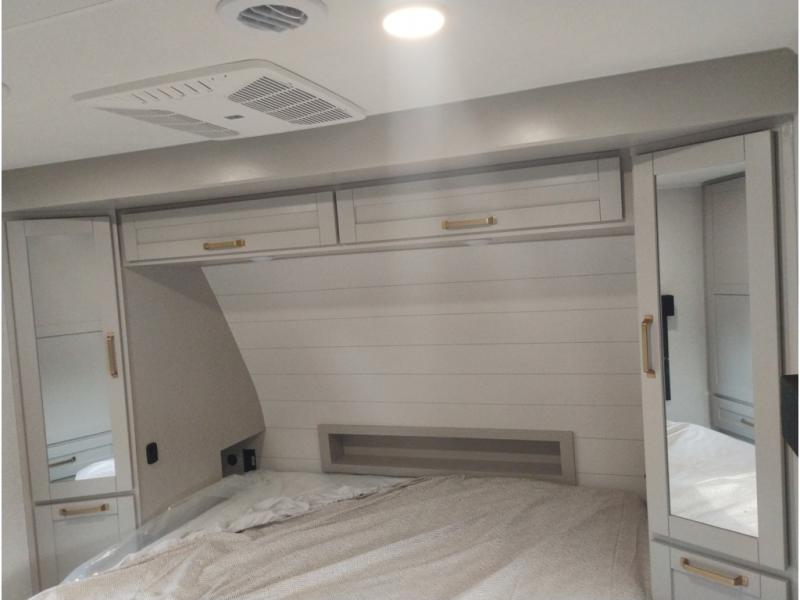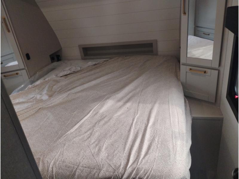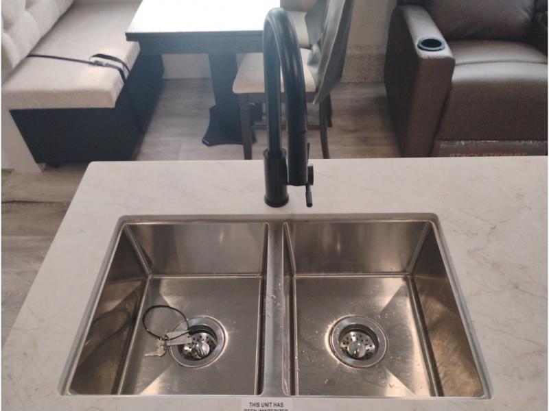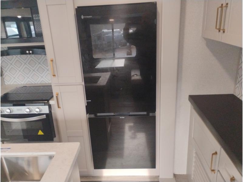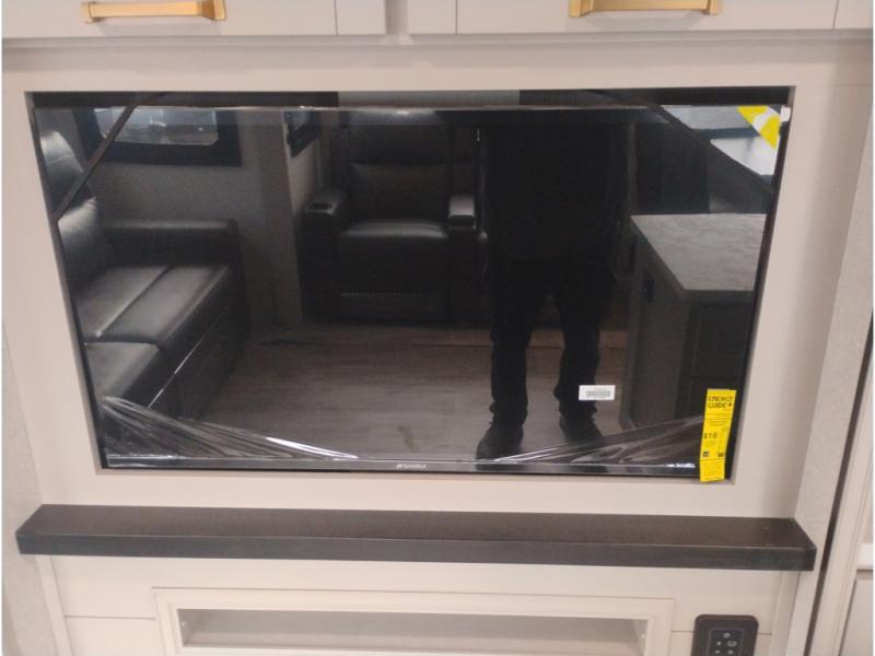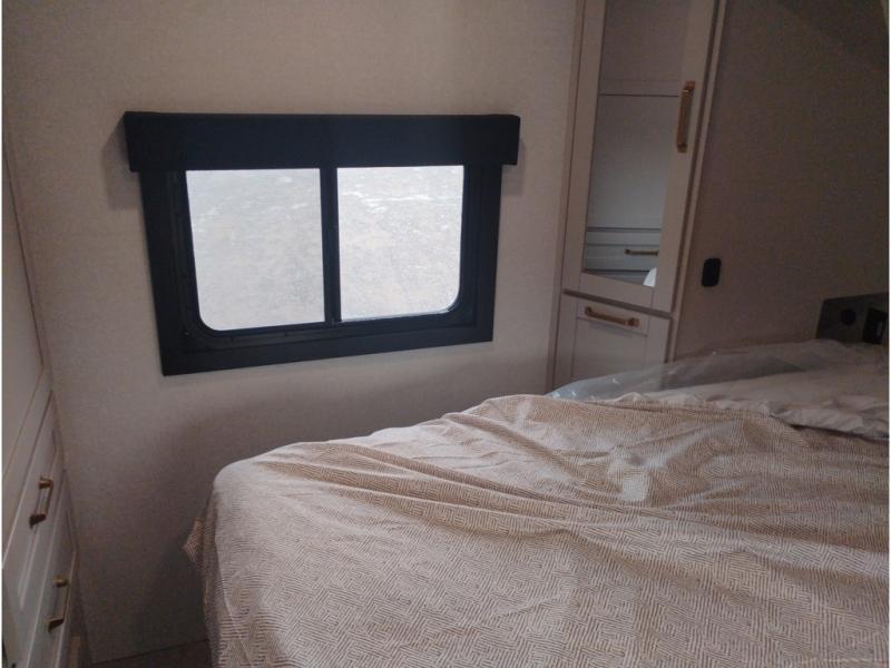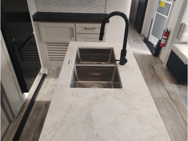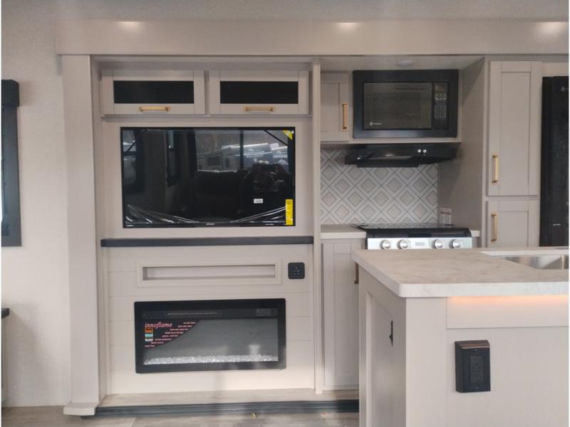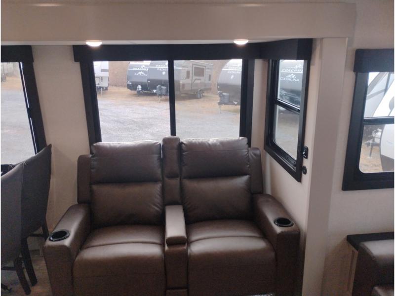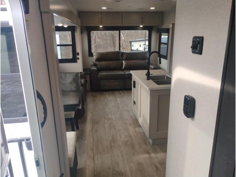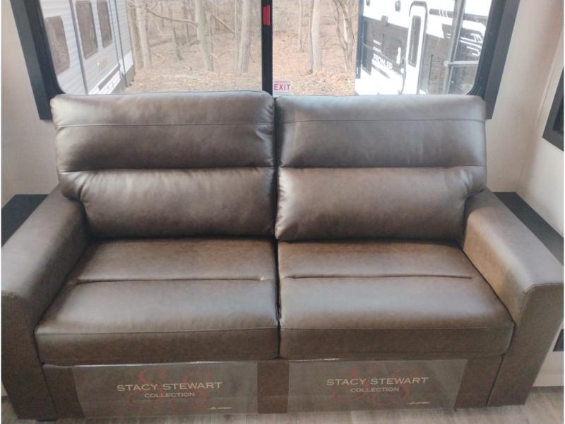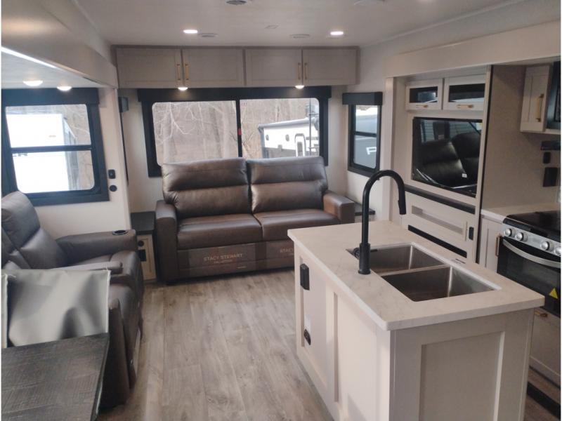 At the front of this trailer, you'll find a spacious full bedroom featuring a 66" x 80" Olympic queen bed, flanked by wardrobes on each side, overhead cabinets, and an additional corner wardrobe, providing plenty of storage for clothes, camping gear, and more. As you head down the hallway, the full bathroom offers a comfortable 30" x 36" shower with a skylight that adds extra headroom and natural light, along with a porcelain foot flush toilet and convenient linen storage for easy access to towels. Toward the rear, the main living area opens up with dual slide-outs, creating a roomy and inviting space. One slide houses the kitchen with a three-burner range, pantry, and a 10-cu. ft. refrigerator, all within easy reach. At the center, a kitchen island features a sink with a pull-out sprayer for added functionality. Opposite the kitchen, the second slide includes a 60" theater sofa and a table with chairs perfect for relaxing, dining, or gathering with friends. At the very rear, a 75" tri-fold sofa adds even more seating and can double as extra-sleeping space when needed