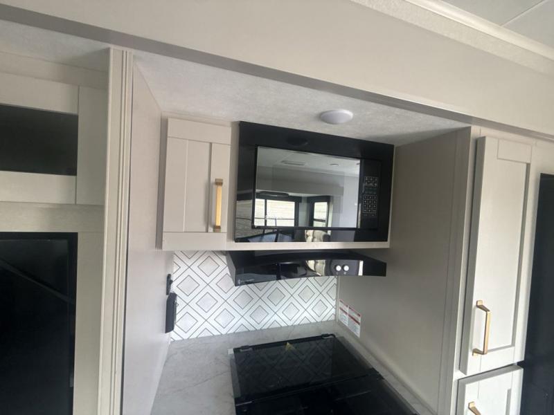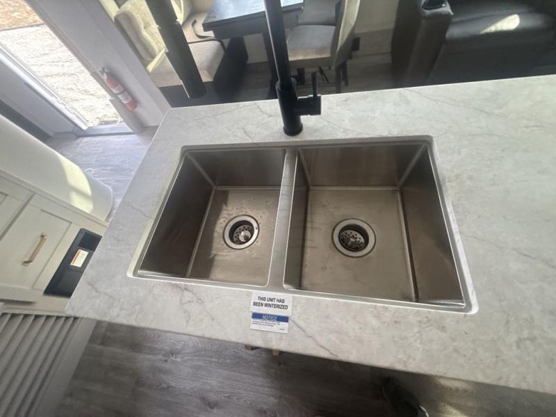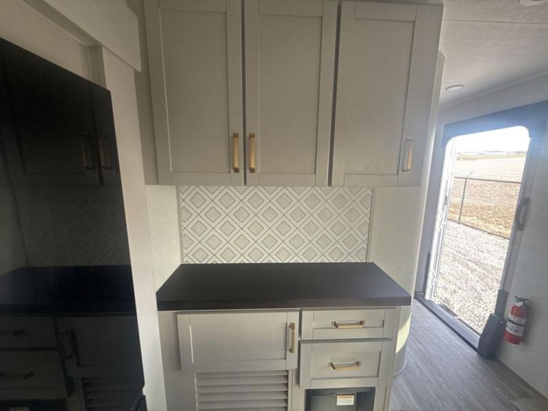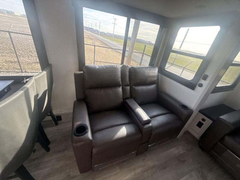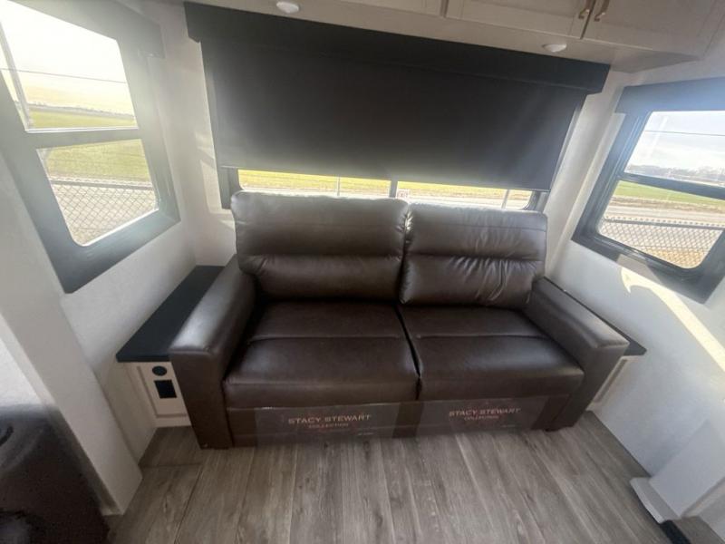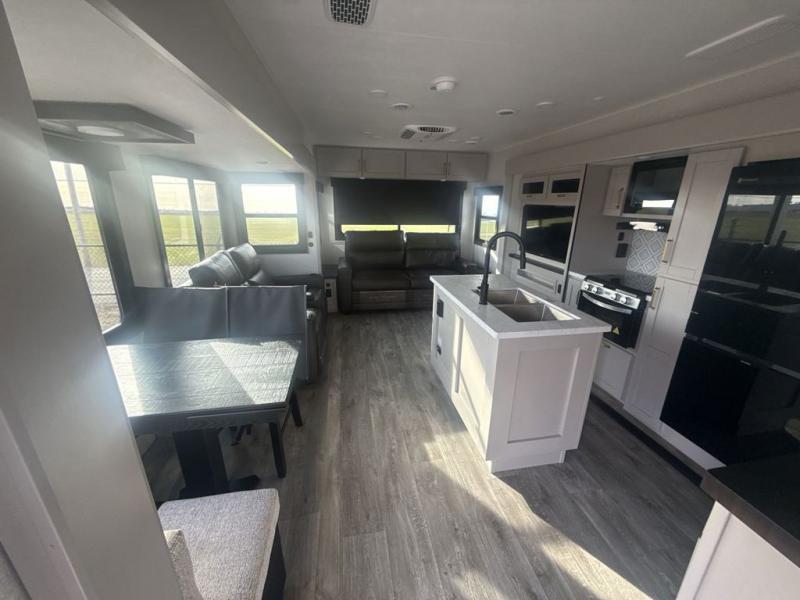 At the front of this travel trailer, the private bedroom offers a comfortable retreat with a 66" x 80" Olympic bed, flanked by wardrobes on each side, plus overhead cabinets and an additional corner wardrobe perfect for storing clothes and camping gear. Just down the hall, the bathroom features a 30" x 36" shower, a medicine cabinet with a custom-framed mirror, and a linen cabinet to keep towels easily accessible. The spacious main living area is made even more open by dual opposing slides. One slide includes the entertainment center, a three-burner range, pantry, and a 10-cu. ft. refrigerator for all your cooking and storage needs, while the central kitchen island equipped with a sink and pull-out sprayer adds functionality and convenience. Opposite that, the second slide features a 60" tri-fold sleeper sofa and booth dinette, offering ample seating and additional sleeping space. At the rear, the dedicated bunkhouse includes a 39" x 73" bunk, a top bunk on the opposite side, and a 60" tri-fold sofa below ensuring everyone has a cozy place to rest after a day full of adventure.