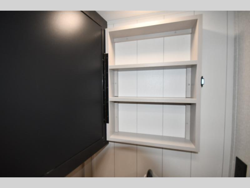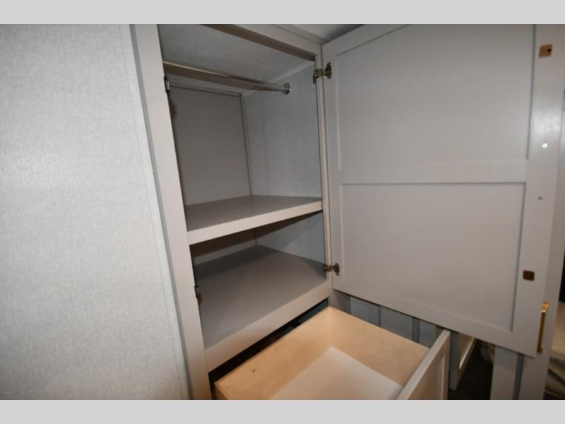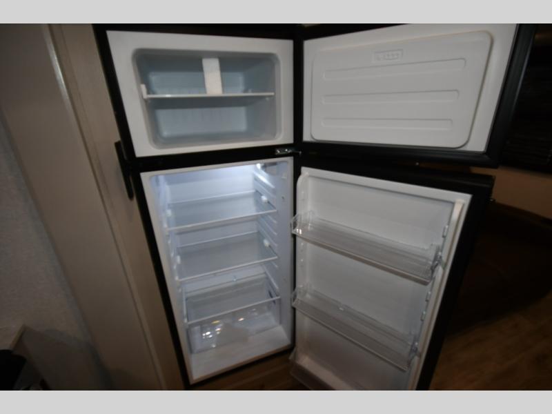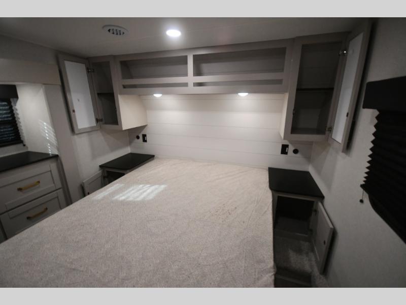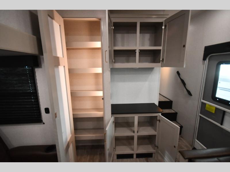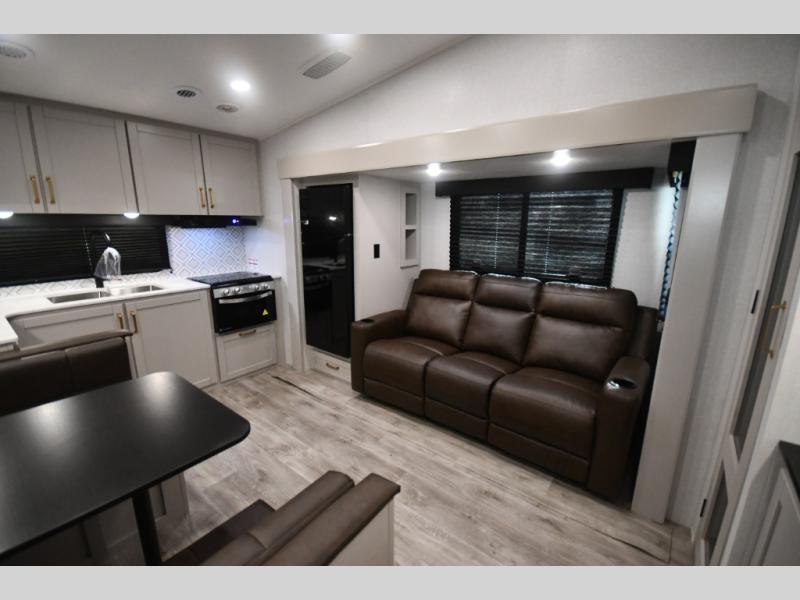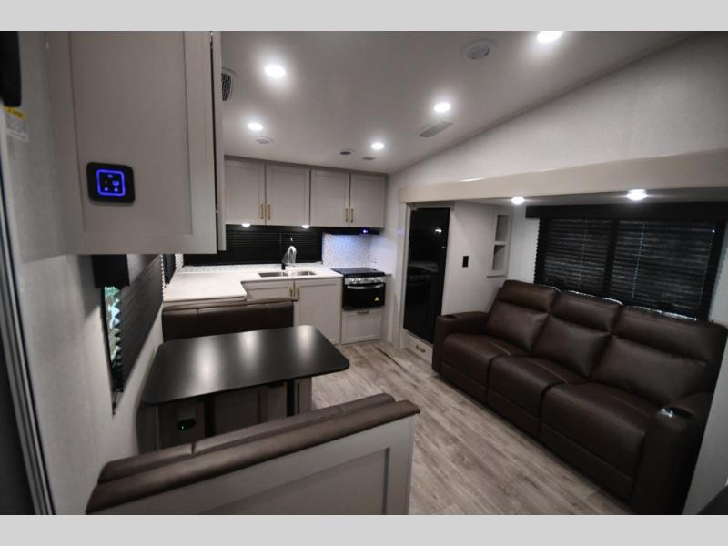 The fifth wheel you were waiting for! The spacious rear kitchen is equipped with a three-burner cooktop, microwave, booth dinette, 12V refrigerator, and sink, providing ample space for meal preparation. Overhead cabinets and a pantry provide ample storage for cookware, dishes, and other essential kitchen items. The living area features a trifold sofa, perfect for relaxation and entertainment. The full bathroom’s thoughtful design ensures that everyone has their own space, and the front bedroom is a retreat from the world, featuring a plush queen bed, a spacious wardrobe, and a closet.