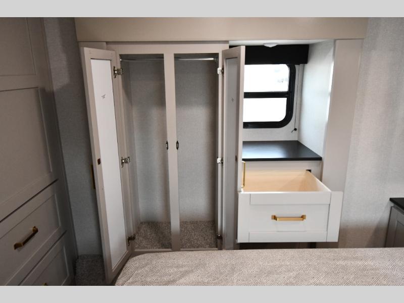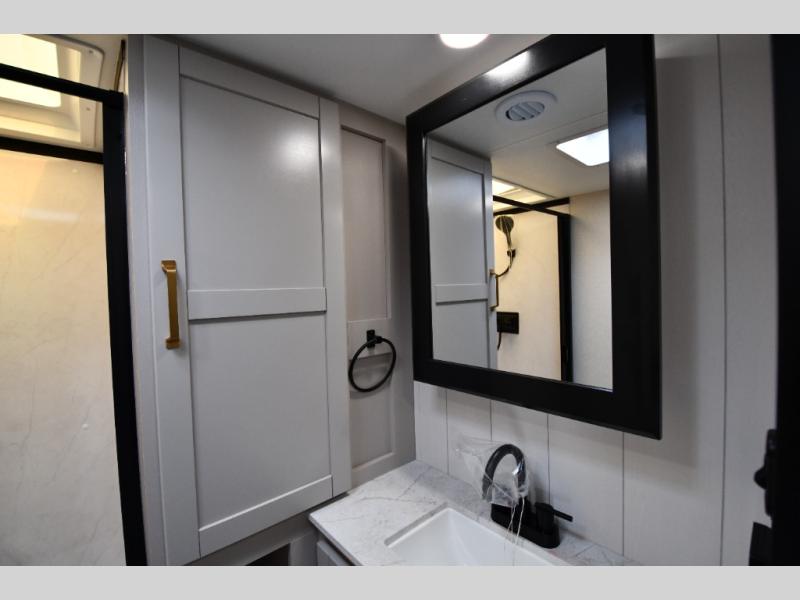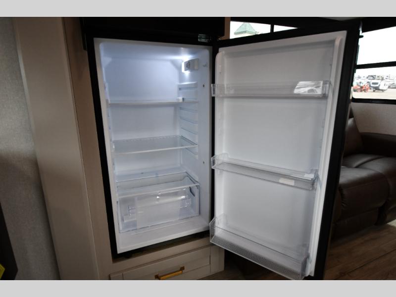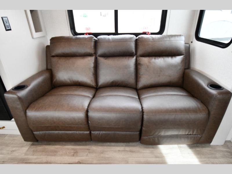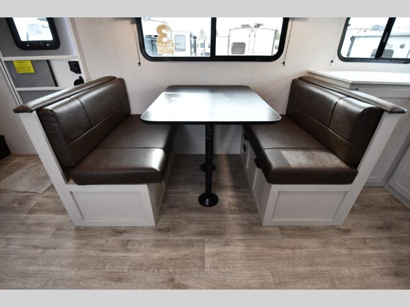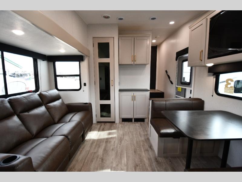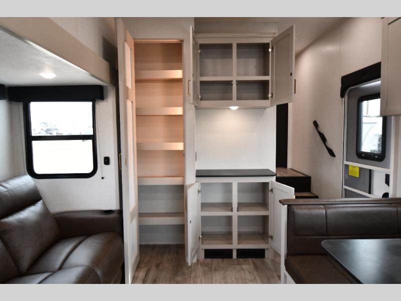 The fifth wheel you were waiting for! The spacious rear kitchen is equipped with a three-burner cooktop, microwave, booth dinette, 12V refrigerator, and sink, providing ample space for meal preparation. Overhead cabinets and a pantry provide ample storage for cookware, dishes, and other essential kitchen items. The living area features a trifold sofa, perfect for relaxation and entertainment. The full bathroom’s thoughtful design ensures that everyone has their own space, and the front bedroom is a retreat from the world, featuring a plush queen bed, a spacious wardrobe, and a closet.