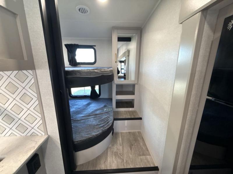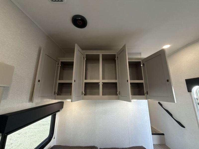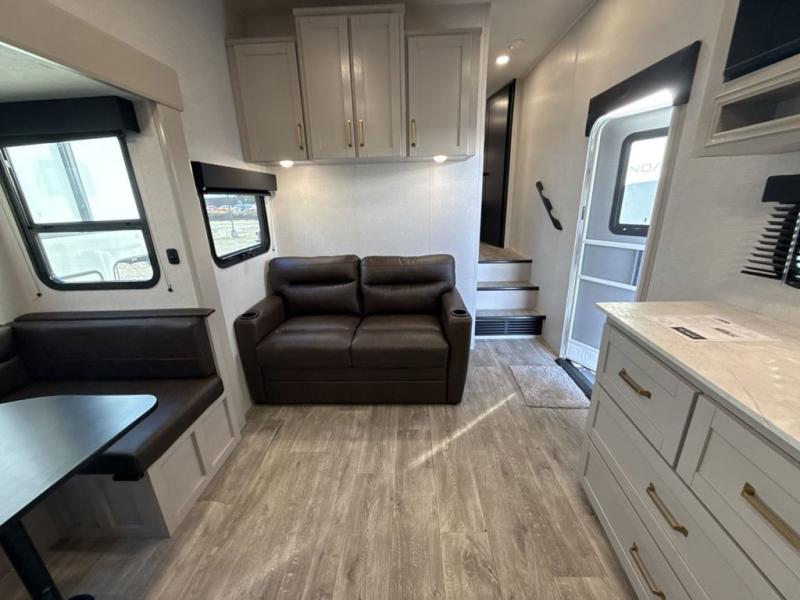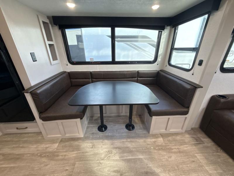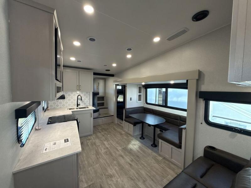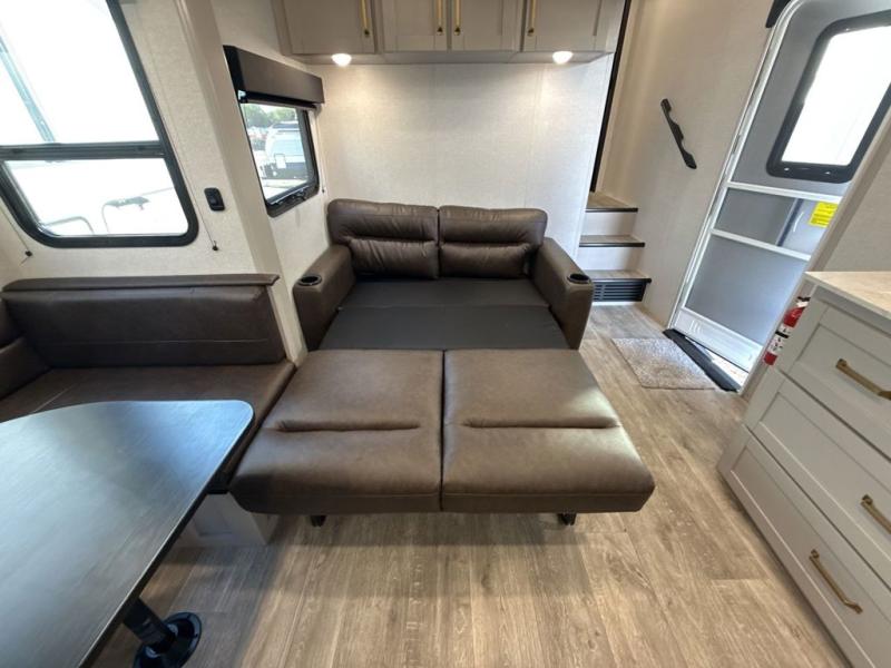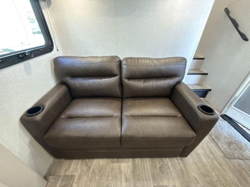 This fifth wheel's spacious interior boasts double-sized bunk beds designed for kids or guests, providing a comfortable sleeping space. A U-shaped dinette that offers ample seating and dining space for meals or even more sleeping space, as well as the 60” tri-fold sofa, which provides additional seating and can be converted into a comfortable sleeping area. In the kitchen area, you will find many amenities to cook delicious meals, such as a microwave, refrigerator, and overhead cabinets that will allow you to keep everything organized. The front bed is spacious, featuring a queen bed ideal for sleeping tight, and the full bath will complete the at-home experience since you will be able to take a refreshing shower on hot days!