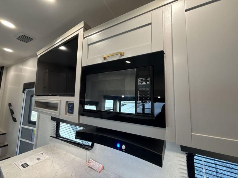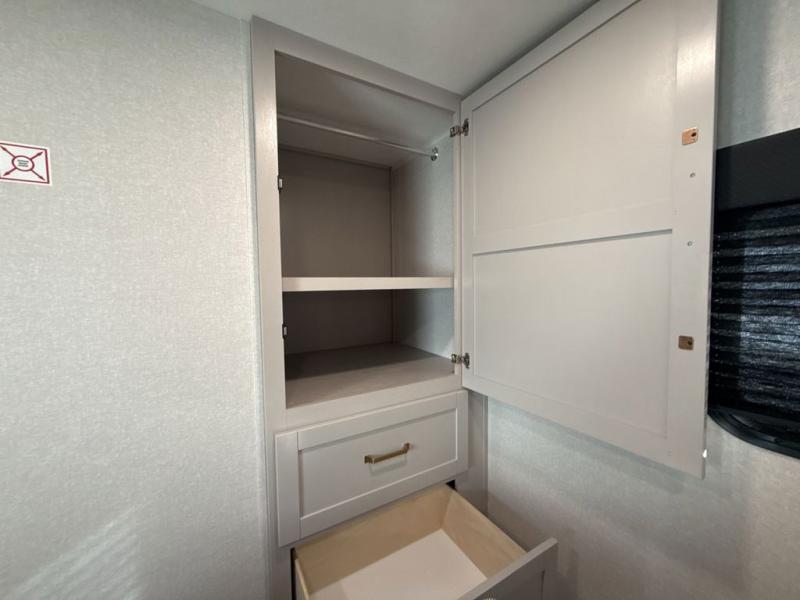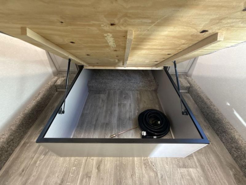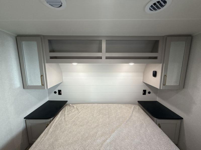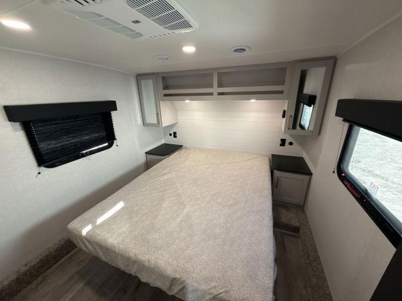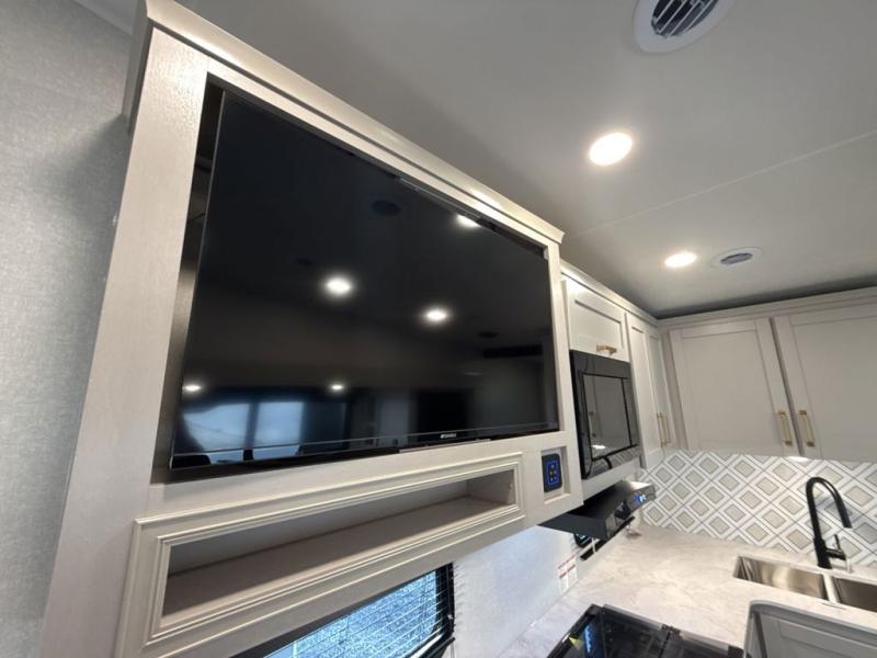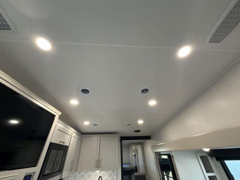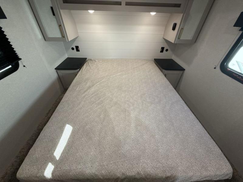 This fifth wheel's spacious interior boasts double-sized bunk beds designed for kids or guests, providing a comfortable sleeping space. A U-shaped dinette that offers ample seating and dining space for meals or even more sleeping space, as well as the 60” tri-fold sofa, which provides additional seating and can be converted into a comfortable sleeping area. In the kitchen area, you will find many amenities to cook delicious meals, such as a microwave, refrigerator, and overhead cabinets that will allow you to keep everything organized. The front bed is spacious, featuring a queen bed ideal for sleeping tight, and the full bath will complete the at-home experience since you will be able to take a refreshing shower on hot days!