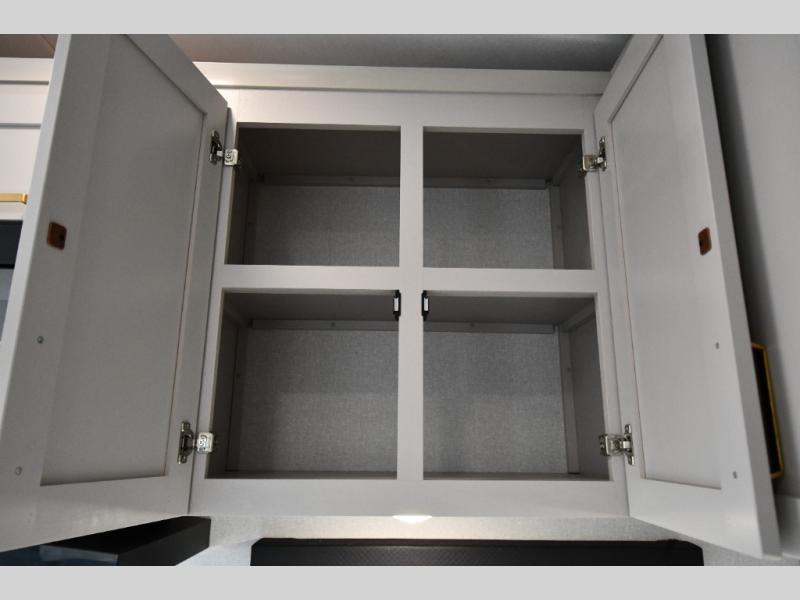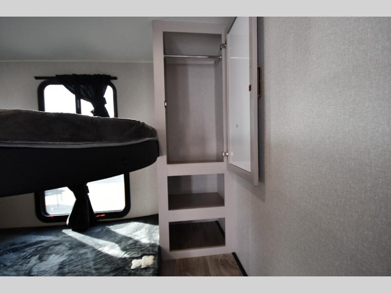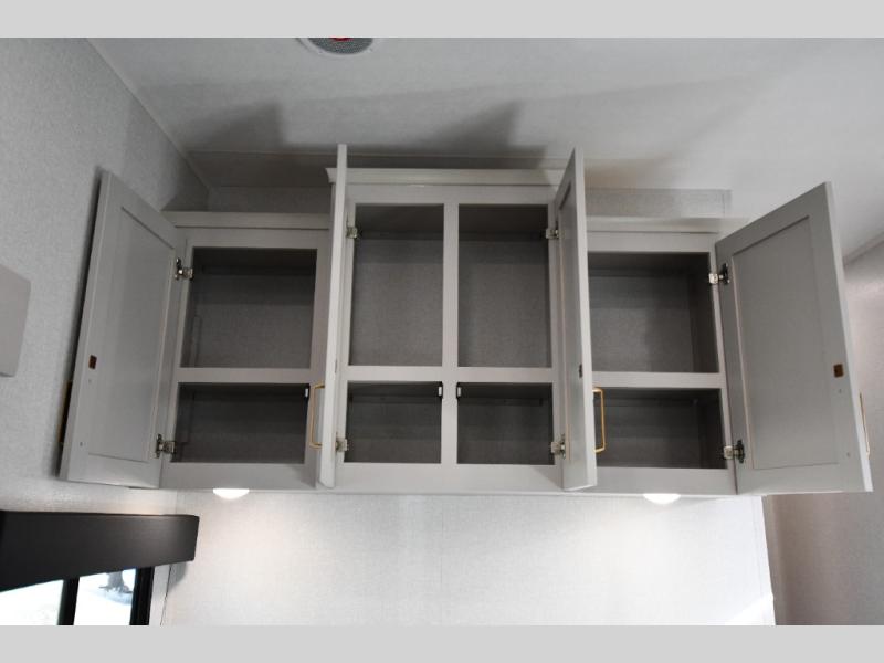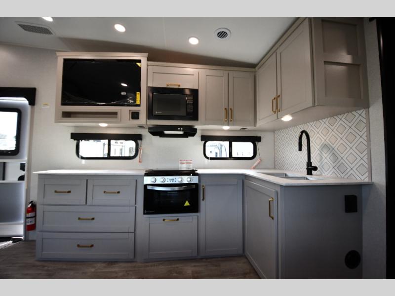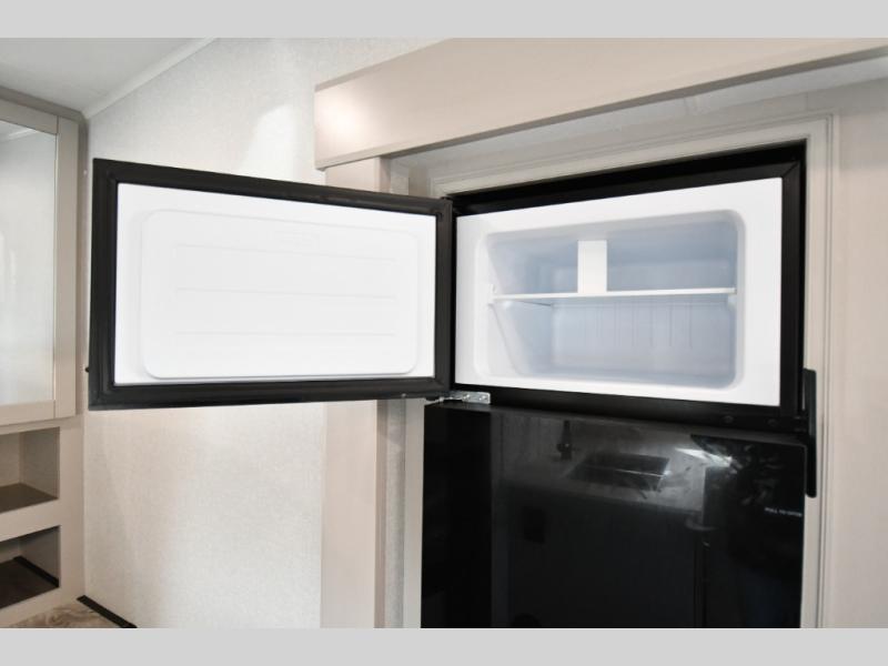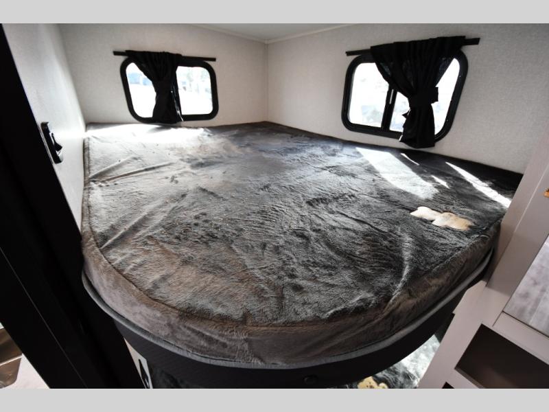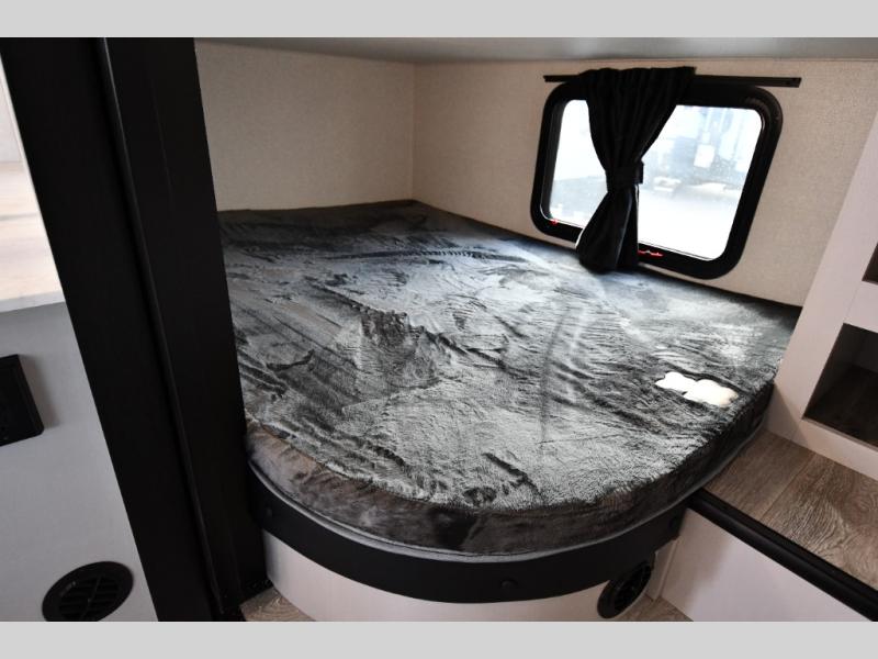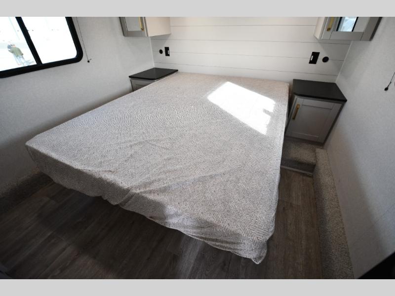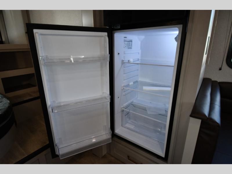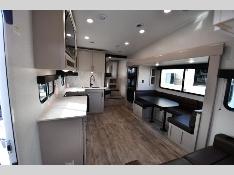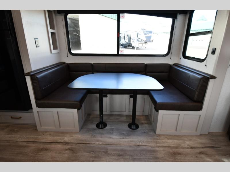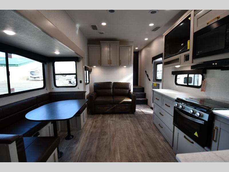 This fifth wheel's spacious interior boasts double-sized bunk beds designed for kids or guests, providing a comfortable sleeping space. A U-shaped dinette that offers ample seating and dining space for meals or even more sleeping space, as well as the 60” tri-fold sofa, which provides additional seating and can be converted into a comfortable sleeping area. In the kitchen area, you will find many amenities to cook delicious meals, such as a microwave, refrigerator, and overhead cabinets that will allow you to keep everything organized. The front bed is spacious, featuring a queen bed ideal for sleeping tight, and the full bath will complete the at-home experience since you will be able to take a refreshing shower on hot days!