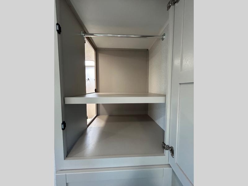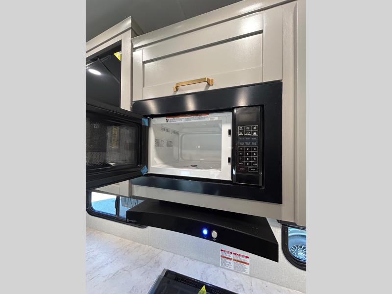 This fifth wheel's spacious interior boasts double-sized bunk beds designed for kids or guests, providing a comfortable sleeping space. A U-shaped dinette that offers ample seating and dining space for meals or even more sleeping space, as well as the 60” tri-fold sofa, which provides additional seating and can be converted into a comfortable sleeping area. In the kitchen area, you will find many amenities to cook delicious meals, such as a microwave, refrigerator, and overhead cabinets that will allow you to keep everything organized. The front bed is spacious, featuring a queen bed ideal for sleeping tight, and the full bath will complete the at-home experience since you will be able to take a refreshing shower on hot days!