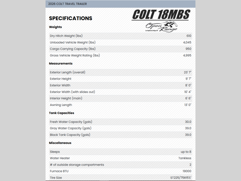 The Highland Ridge RV Open Range Colt 18MBS is not just about comfort and style; it’s engineered for performance with robust construction and advanced technology. Its lightweight design paired with cutting-edge amenities makes towing effortless, giving you the freedom to roam further and explore the unknown. Whether you’re setting up camp in the mountains or parked by a tranquil lake, this RV delivers reliable and consistent performance, making it a trusted partner for your spontaneous or planned escapades. Embrace the spirit of adventure and redefine your travel expectations with this exceptional RV that stands ready to take you wherever the road might lead.
