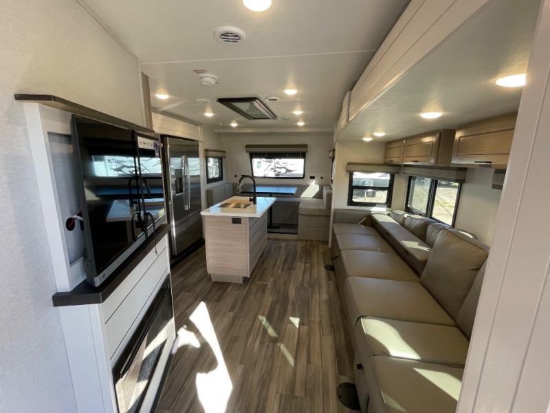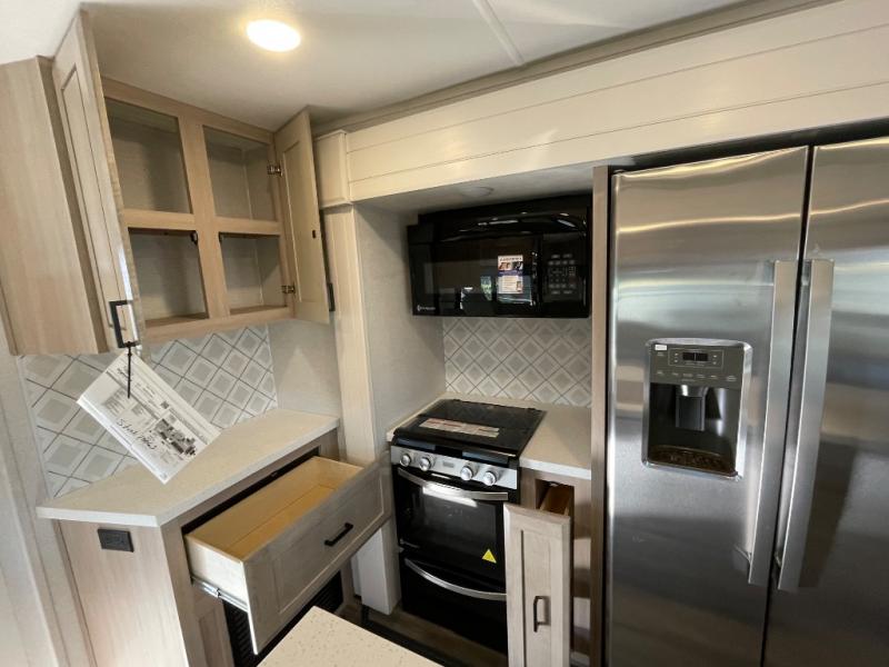 This Open Range travel trailer offers fantastic flexibility! The private rear bedroom with queen bed and king bed option is a lovely retreat, while your guests or children enjoy the middle bunkhouse with a bunk above a desk. The common living area is an open space with a mega lounge with two pedestal tables, plus a U-dinette for even more seating! A picture window provides the perfect view! A full bath is easily accessible, and the kitchen offers a full suite of appliances plus an island for convenient work space. Outside is a second kitchen with fridge and pull-out griddle for even more fun!