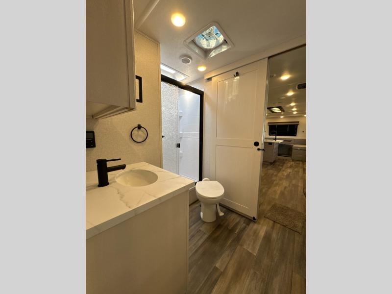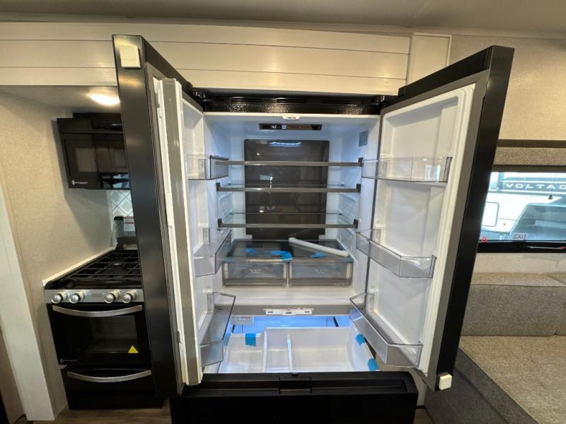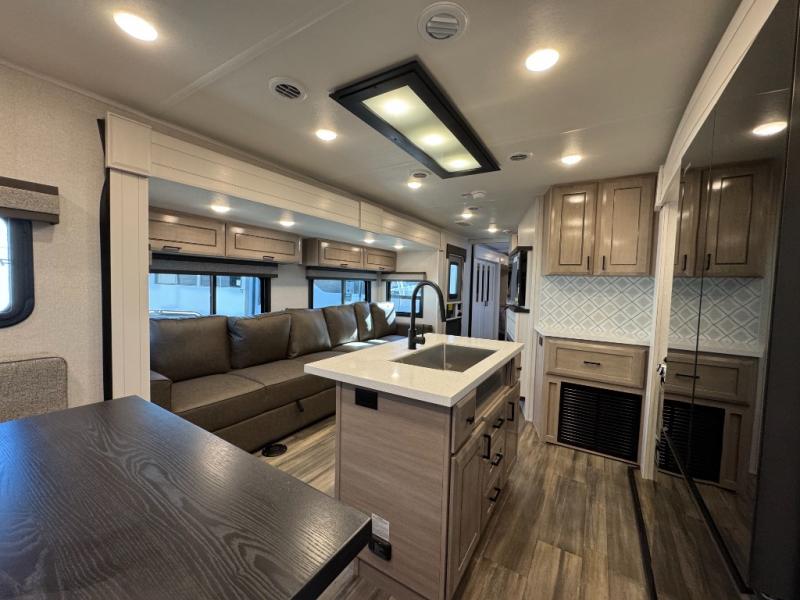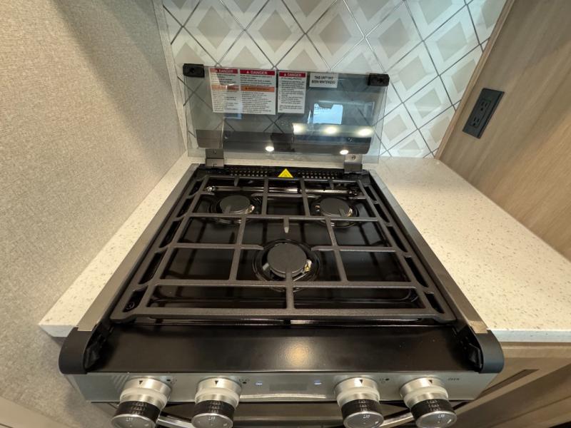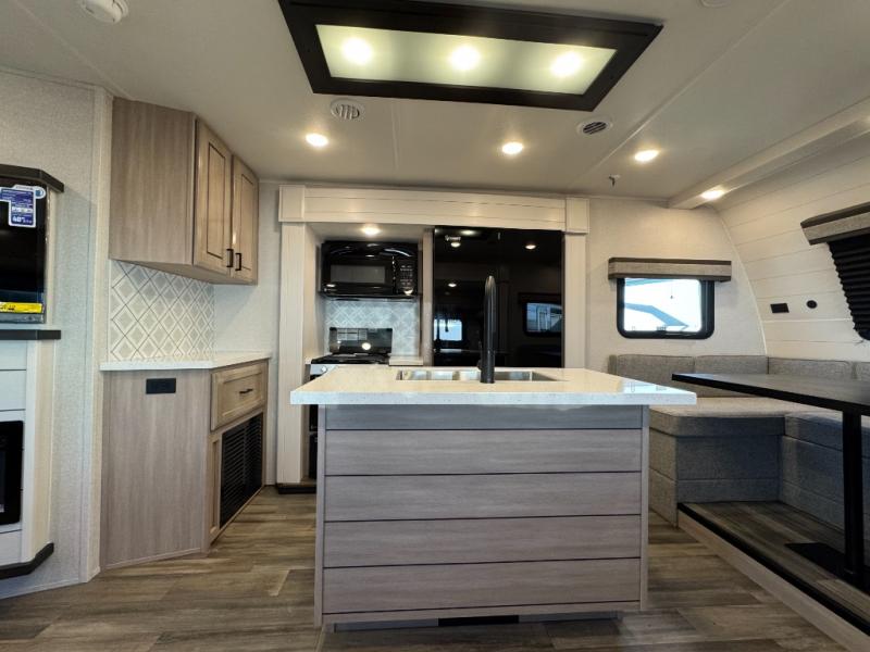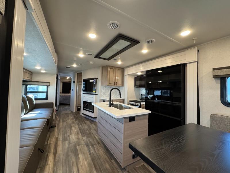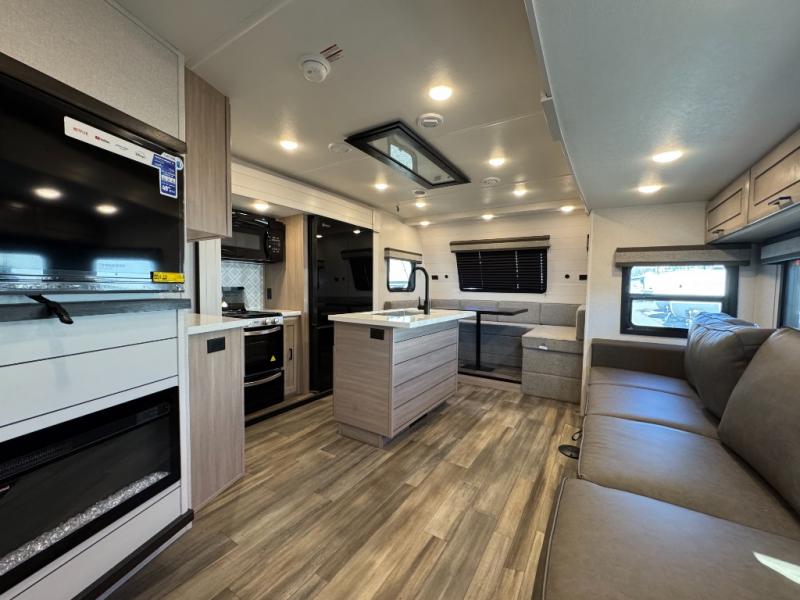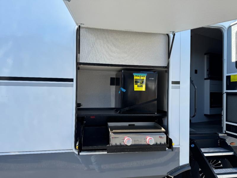 This Open Range travel trailer offers fantastic flexibility! The private rear bedroom with queen bed and king bed option is a lovely retreat, while your guests or children enjoy the middle room with a 28" x 74" bunk along with a desk. The common living area is an open space with a mega lounge with two pedestal tables, plus a U-dinette for even more seating! The frameless windows provide the perfect view! A full bath is easily accessible, and the kitchen offers a full suite of appliances plus an island for convenient work space. Outside is a second kitchen with fridge and pull-out griddle for even more fun!
