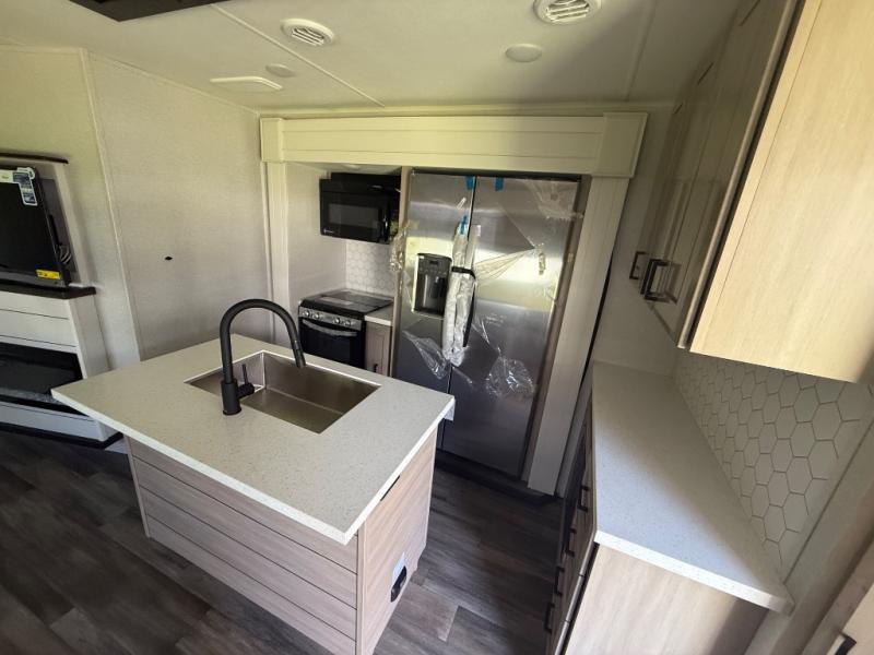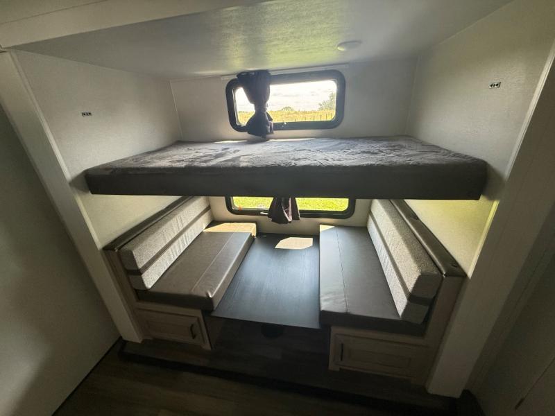 Spacious, comfortable and convenient are a few adjectives you might use when camping or even living in this trailer. The four slides throughout offer more floor space in each room from the master bedroom with a queen bed slide out, and the main living and kitchen area with dual opposing slides to the bunkhouse slide. The bedroom also offers a mirrored wardrobe, washer and dryer prep, a dresser with a window above and easy access to the double entry full bath. The rear bunkhouse gives you two bunks, a dinette, bench seating, plus a half bath for your kids or your friends. And the main area provides a mega lounge with two tables to watch the 50" Smart HDTV with a fireplace below. There are a few options offered on this model, such as a king bed in place of the queen, a larger refrigerator, and a free-standing table in place of the lounge!