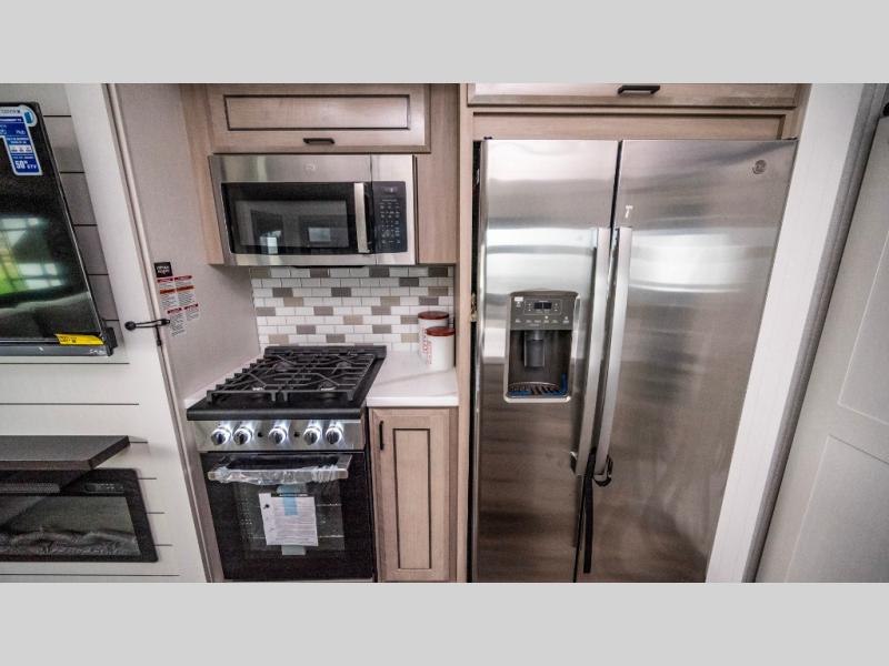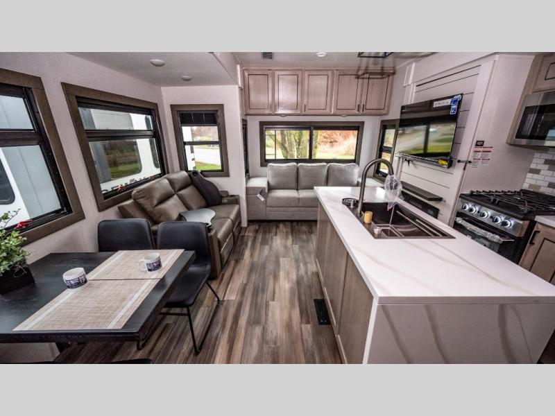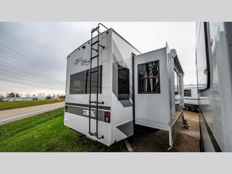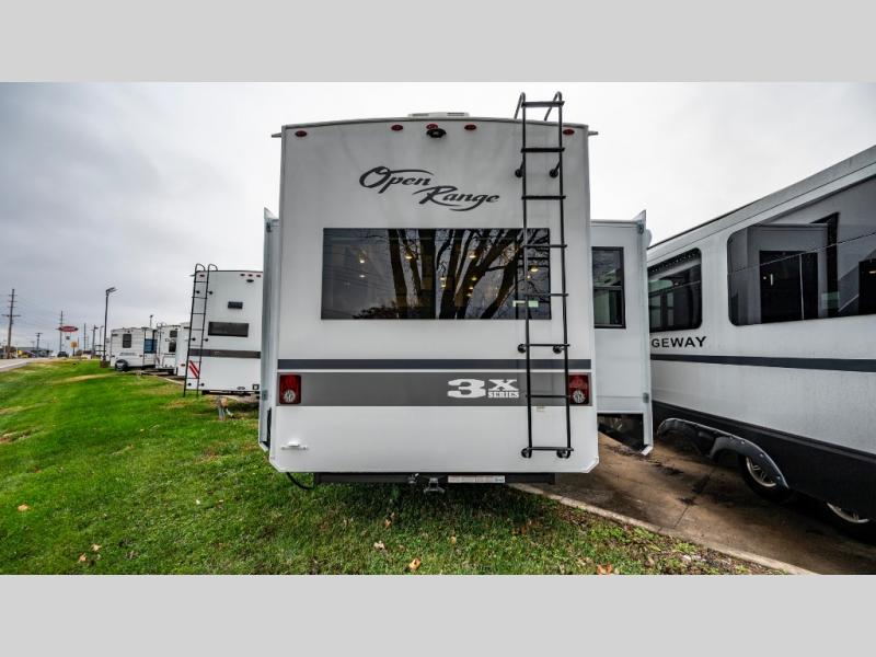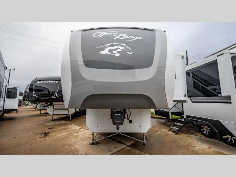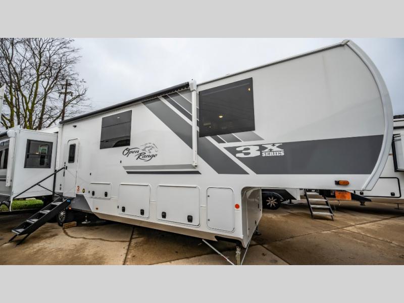 The Open Range 3X Luxury Fifth Wheel prioritizes the customer experience, offering residential living and exceptional construction quality. The 3X maximizes the space in the RV, without adding the weight. This fifth wheel has a 102-inch wide body and 84-inch tall by 42-inch deep main sliderooms, paired with the ACCU-SLIDE™ Slide System. The walls are 2.625-inches thick with a vapor barrier between the aluminum framing, providing 50% more insulation. The 3X is built with our well-known PVC Roofing Membrane, which is heat resistant and ensures durability. Pairing this construction with three 15,000 BTU A/C’s, ducted with quiet return systems, creates a comfortable indoor climate on those hot summer days. This Open Range 3X Luxury Fifth Wheel is enhanced by the inclusion of a GE Profile™ Kitchen Appliance Package, complete with a microwave, 21cu.ft. residential refrigerator, featuring an ice and water dispenser, a residential-style oven with a 4-burner range. Enjoy the luxury feel with our 9" soft/firm reversible mattress, providing the flexibility of comfort for your personalized sleeping experience. Control your fifth wheel with ease using the TravelLINK® System, accessible right from your phone or tablet, for added convenience. Another smart feature is the hands-free VoiceLINK™ Control System, responding to your voice commands. Embrace the Open Range 3X Luxury Fifth Wheel, worry-free with our full-time RVing warranty, reassuring you of the commitment to quality and longevity of your fifth wheel.