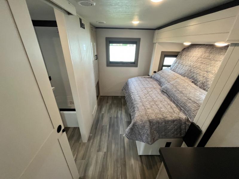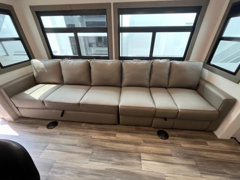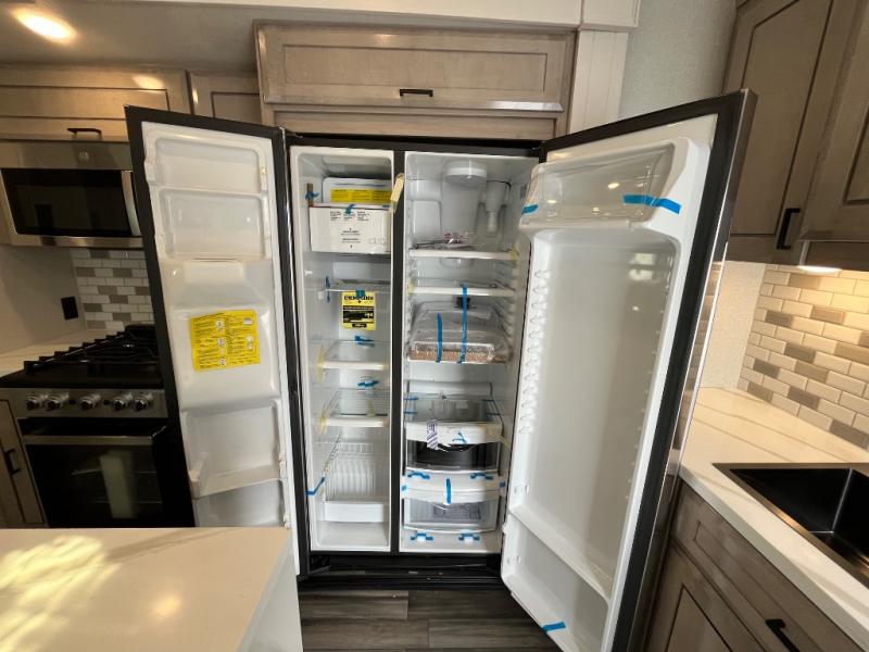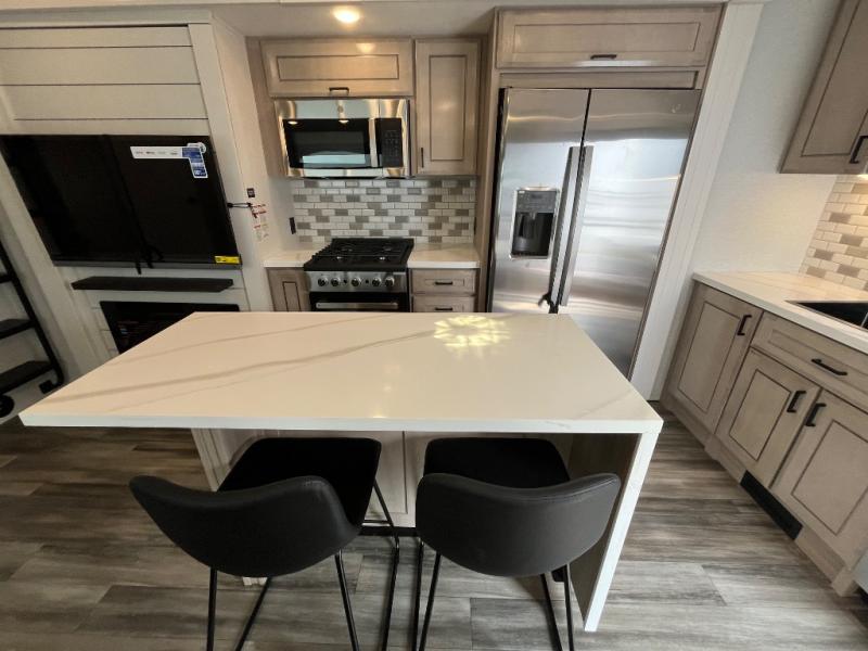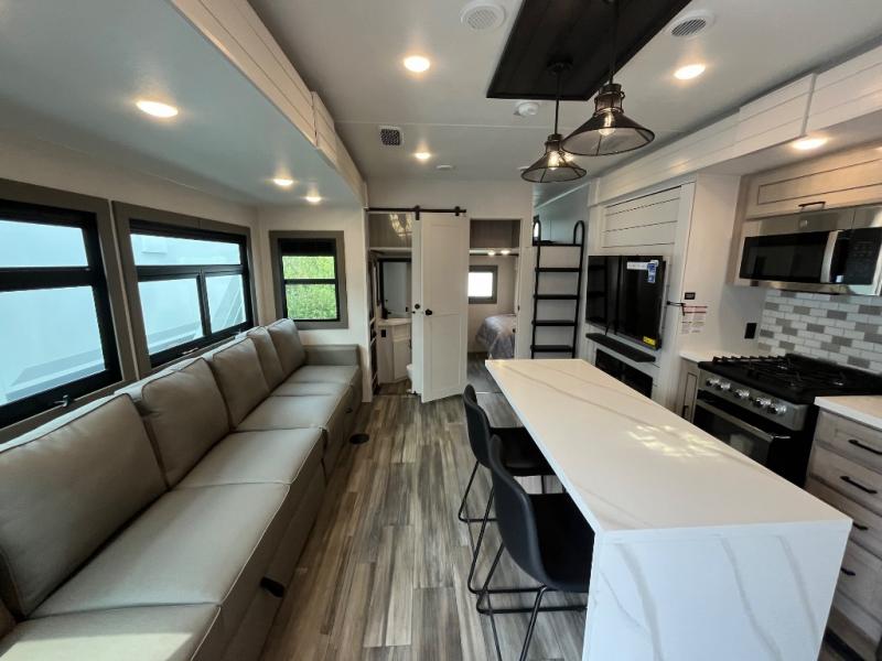If you enjoy luxury camping or you're looking for a residential fifth wheel to go full-time in, this Open Range 3X is the one! The middle kitchen and living room is made open by the dual opposing slides, and your crew can get comfortable on the mega lounge with two tables. The chef of your group will love cooking on GE free-standing four burner range, or they can use the GE residential microwave to heat up leftovers. The standard dishwasher and central vacuum make cleanup a breeze. A waterfall island with four chairs will provide a place to dine and the hidden pantry behind the swing-out entertainment center can hold snacks galore. There is also a fireplace and smart HDTV to make movie nights cozy. The front master bedroom includes a slide out king bed with a power base, two dressers, a large front closet, and a 32" TV to watch shows in bed. You even have your own entrance into the full bath plus washer and dryer prep if you choose to add those appliances. The rear master bedroom is just as accommodating with its queen bed slide out, wardrobe and dresser, plus second full bath with its own exterior entry door. And the loft above the rear bedroom provides even more sleeping space.