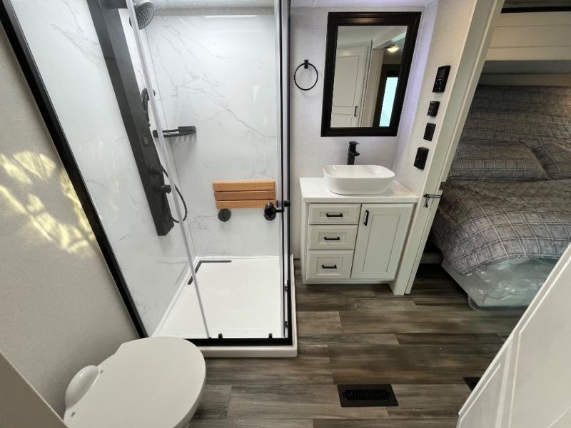 With any Open Range 3X fifth wheel by Highland Ridge, you will enjoy residential luxuries and an exceptional build. The TuffShell construction includes vacuum bonded laminated fiberglass and welded aluminum frames for added strength, and the PVC roofing membrane is ultra durable. You can plan to camp year around or go full-time since there is a mandatory Four Season Package that includes a heated and enclosed underbelly, a 40K BTU high-performance furnace, double insulated baggage doors, and more. The residential features continue on with the mandatory Executive Package with the TravelLINK Smart RV system, Keyed-Alike entry and baggage doors, painted fiberglass front cap with LED lighting, and three 15,000 BTU A/C units with quiet residential return air. Inside, you'll enjoy GE Profile kitchen appliances, sleek square windows with integrated blinds, ceramic subway tile backsplash, a glass shower door, and the list of amenities goes on!