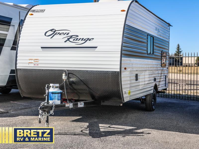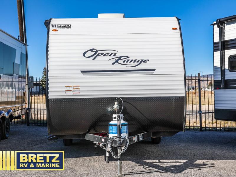 The affordable Open Range Conventional travel trailers by Highland Ridge are ready to meet your camping needs! You will appreciate the durable Magnum Roof system, plus each model is constructed with black front diamond plate protection, 5/8" main floor decking, and self-adjusting electric brakes with E-Z Lube axles for smooth towing. The 81" interior height means you won't feel cramped when relaxing with friends and family, and the residential vinyl flooring throughout is easy to clean, which will be perfect if you're camping with little ones or pets. These models also include a ceiling mount Bluetooth speaker plus a 13,500 BTU roof mounted A/C to keep you cool on those hot summer months.