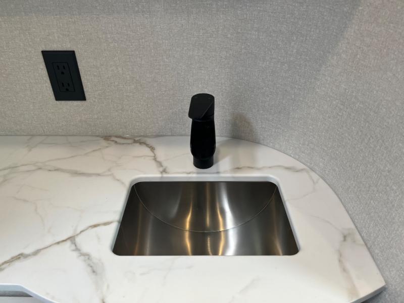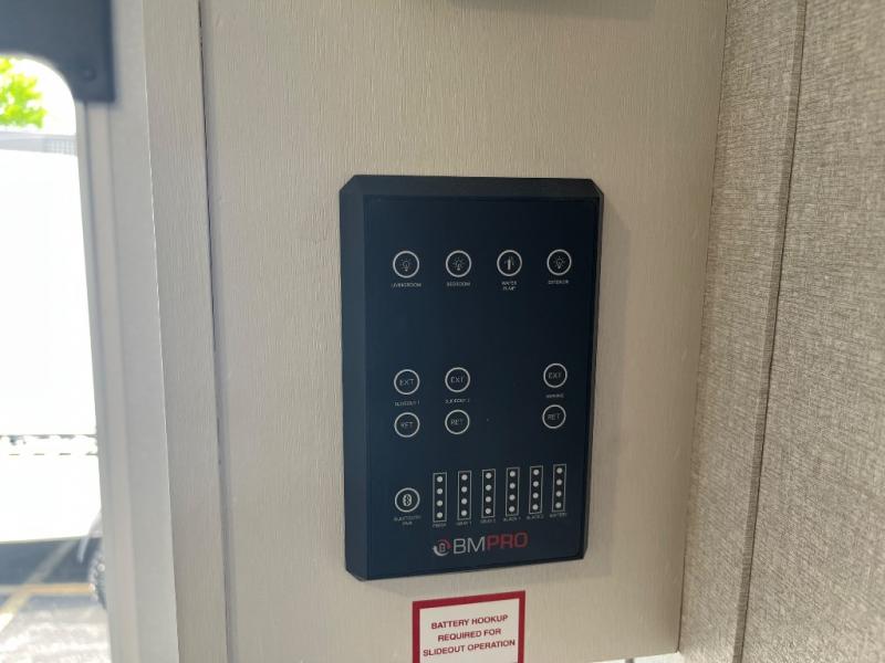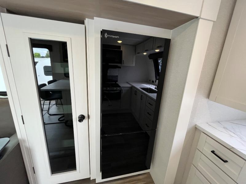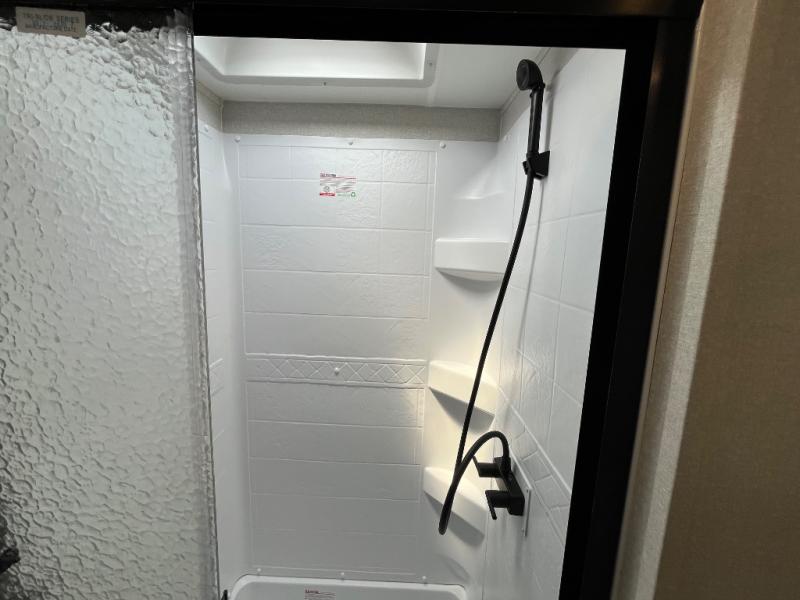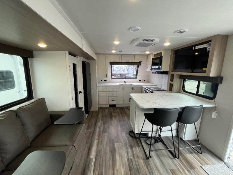 This is the perfect couple's unit to take on weekend excursions! You will find a front kitchen with ample counter space, including a bar top with two seats where you can enjoy breakfast at each morning. The theater seats are across from the entertainment center if you choose to stay in for the day, or you can grab your fishing poles from the pass-thru storage and head out for the day. A spacious full bath will let you freshen up when you return, and there is a closet with washer/dryer prep here if you want the option to add those appliances. Head to the rear private bedroom for a great night's rest on the king bed slide out. There is also a closet, dresser, and nightstand, plus one of the dual entry doors for added convenience!