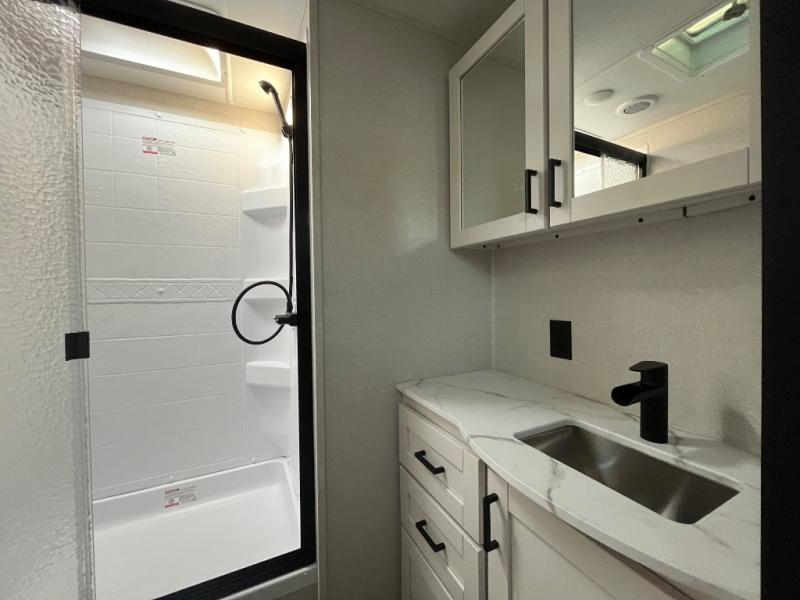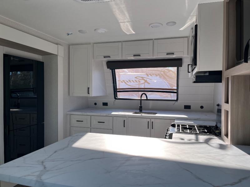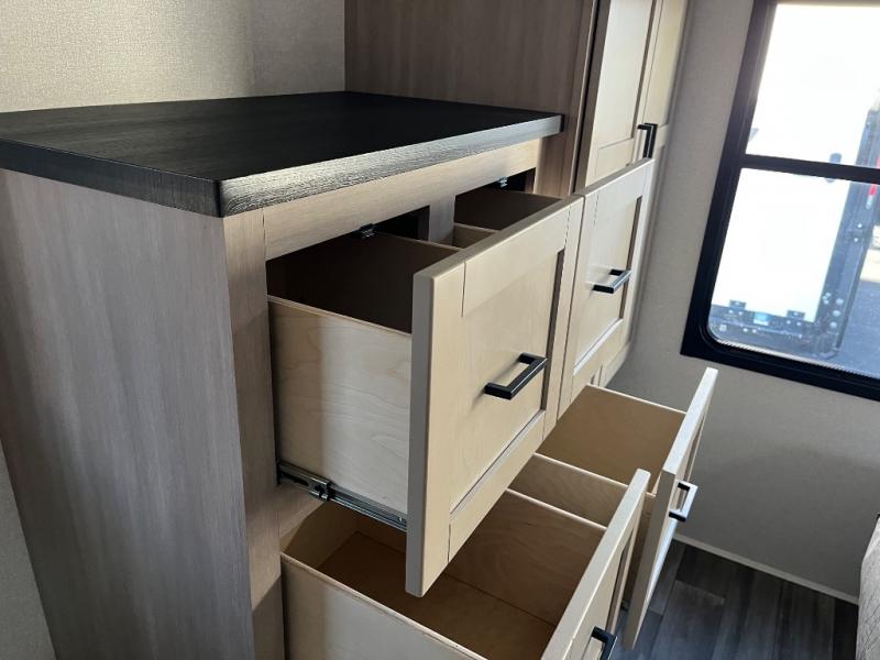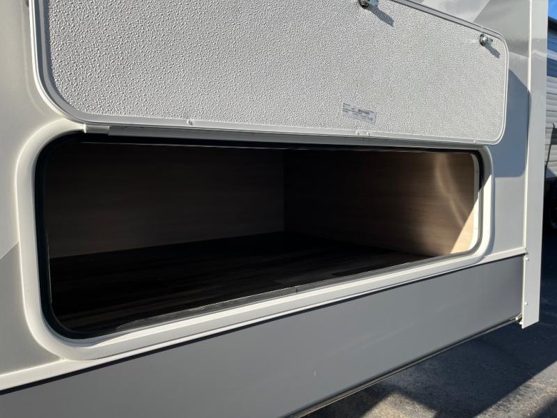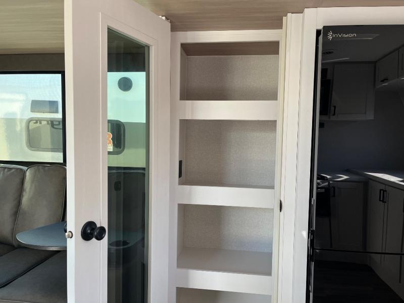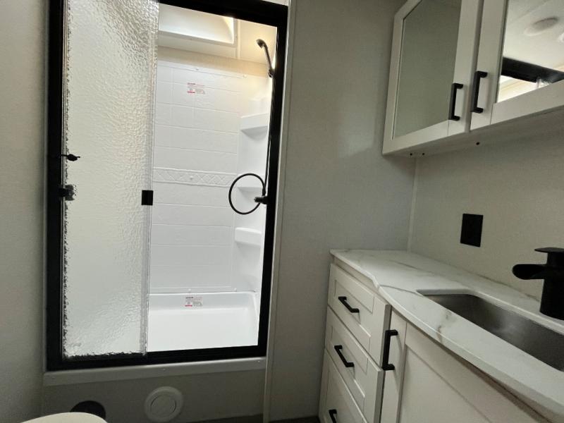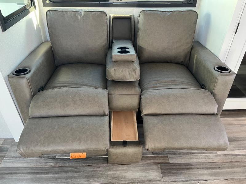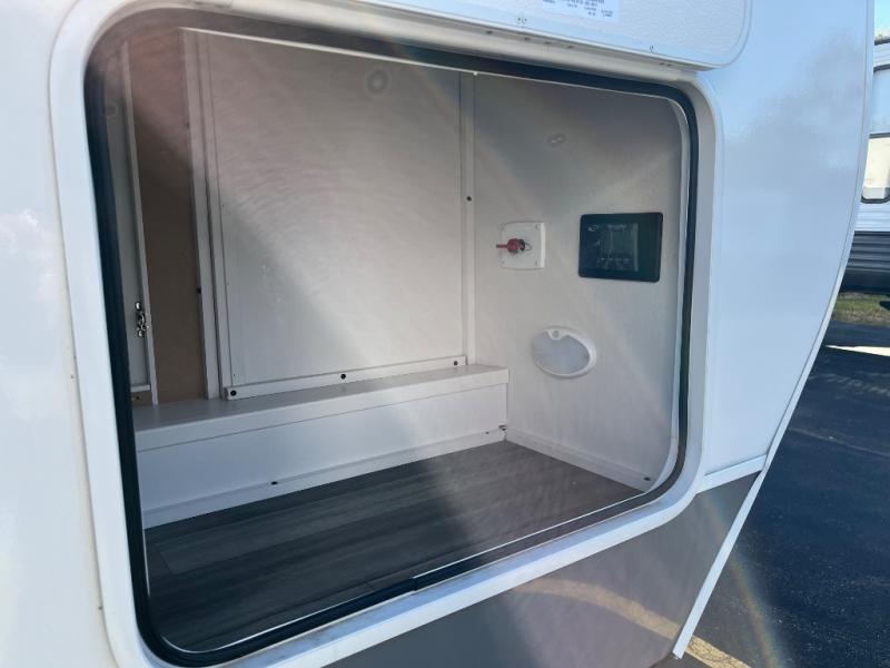 This is the perfect couple's unit to take on weekend excursions! You will find a front kitchen with ample counter space, including a bar top with two seats where you can enjoy breakfast at each morning. The theater seats are across from the entertainment center if you choose to stay in for the day, or you can grab your fishing poles from the pass-thru storage and head out for the day. A spacious full bath will let you freshen up when you return, and there is a closet with washer/dryer prep here if you want the option to add those appliances. Head to the rear private bedroom for a great night's rest on the king bed slide out. There is also a closet, dresser, and nightstand, plus one of the dual entry doors for added convenience!