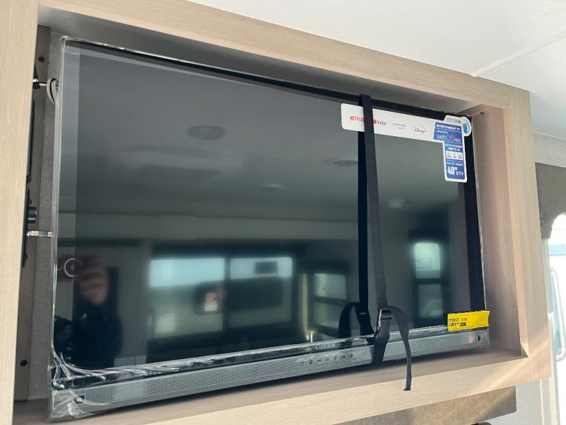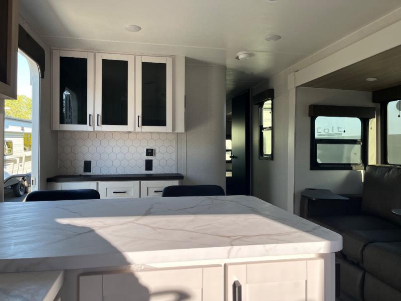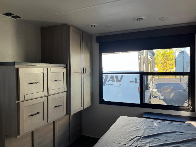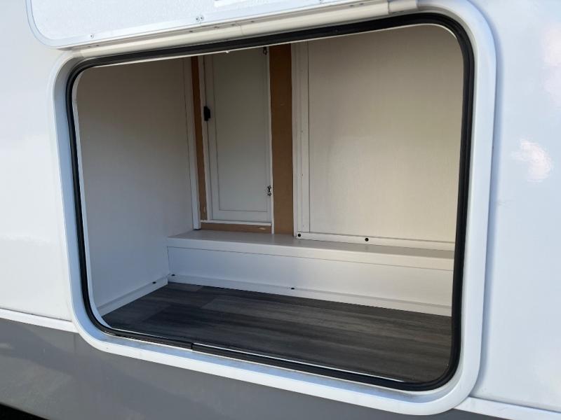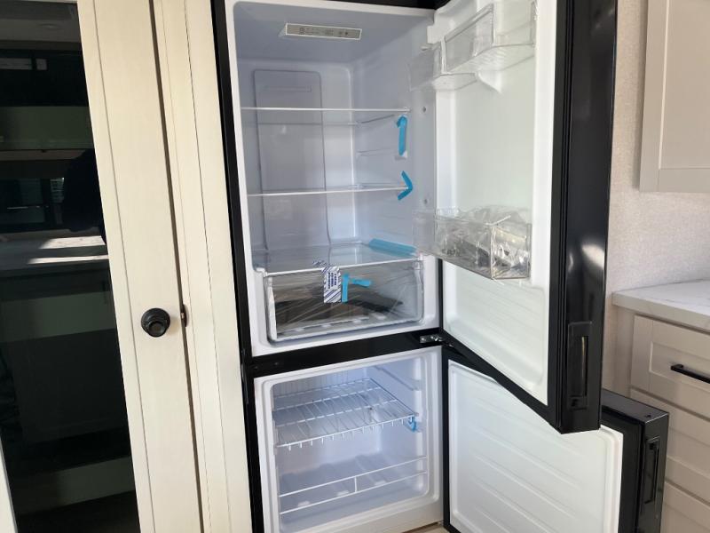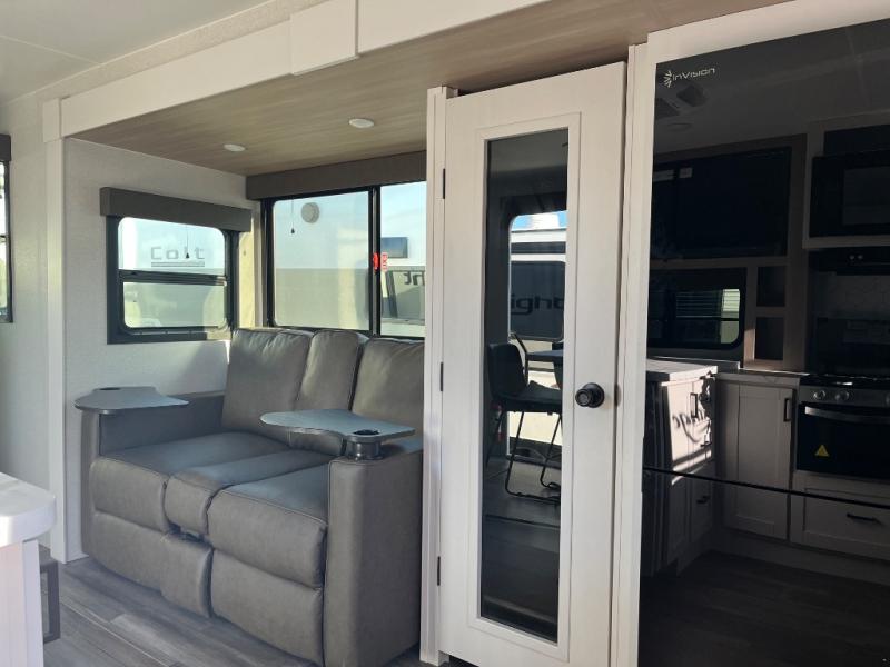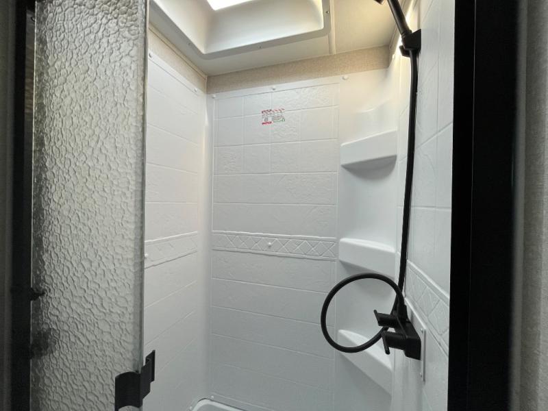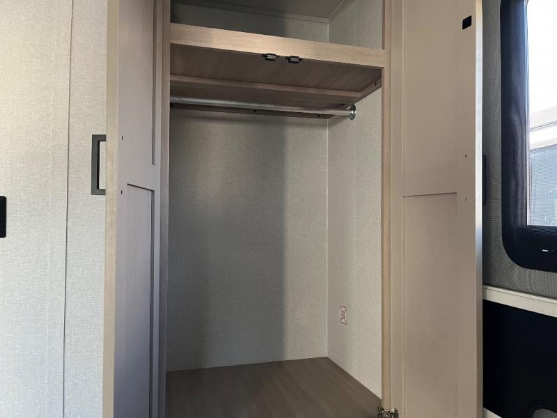 This is the perfect couple's unit to take on weekend excursions! You will find a front kitchen with ample counter space, including a bar top with two seats where you can enjoy breakfast at each morning. The theater seats are across from the entertainment center if you choose to stay in for the day, or you can grab your fishing poles from the pass-thru storage and head out for the day. A spacious full bath will let you freshen up when you return, and there is a closet with washer/dryer prep here if you want the option to add those appliances. Head to the rear private bedroom for a great night's rest on the king bed slide out. There is also a closet, dresser, and nightstand, plus one of the dual entry doors for added convenience!