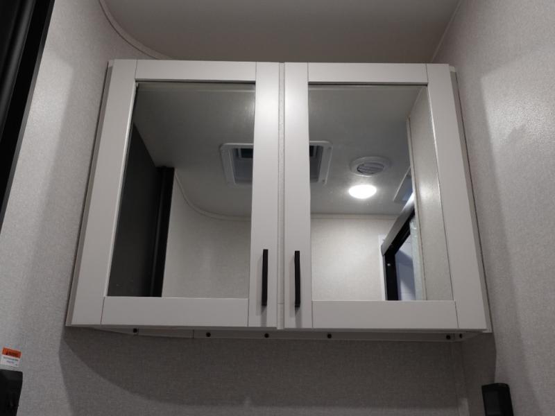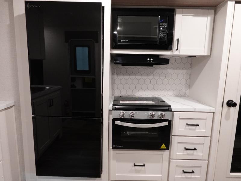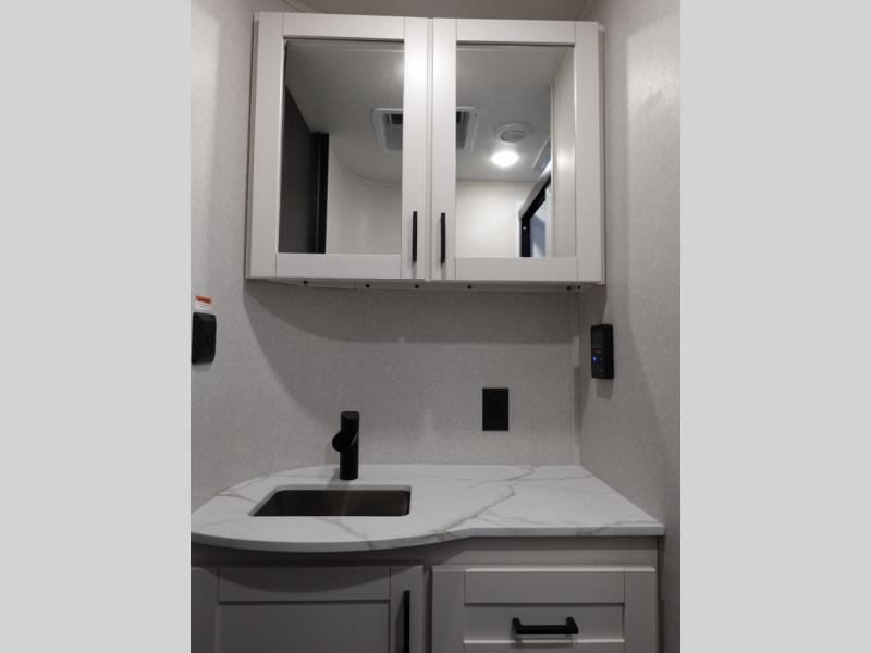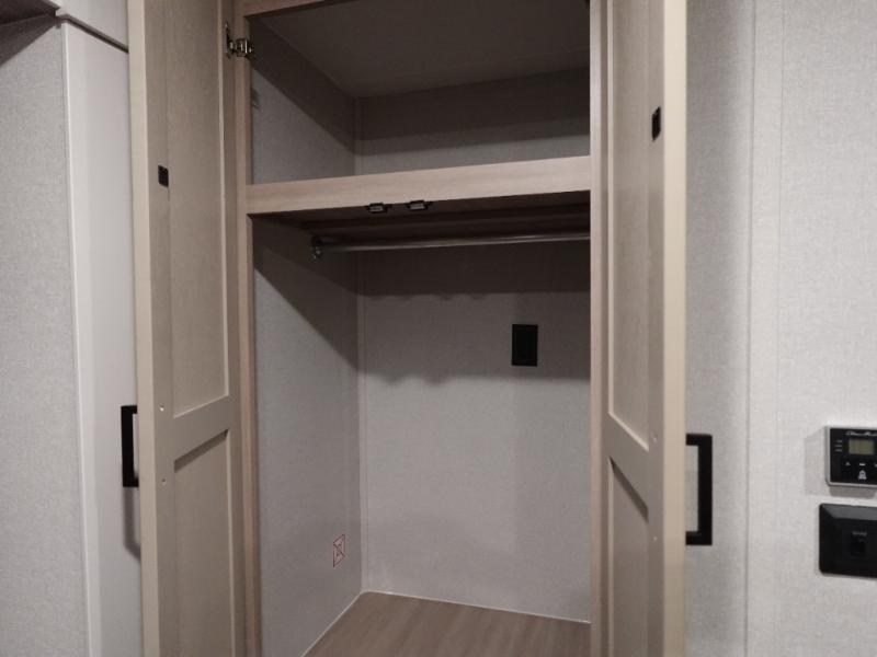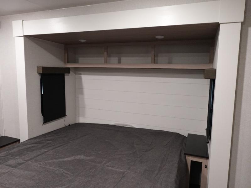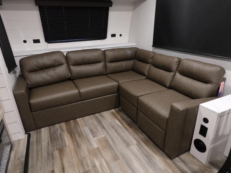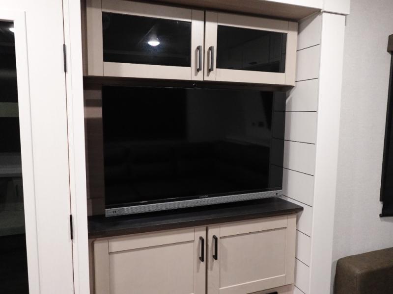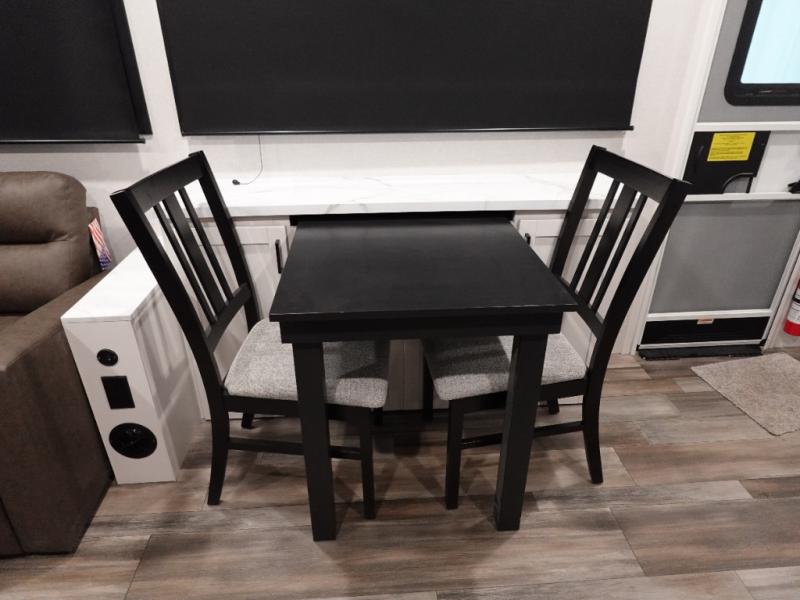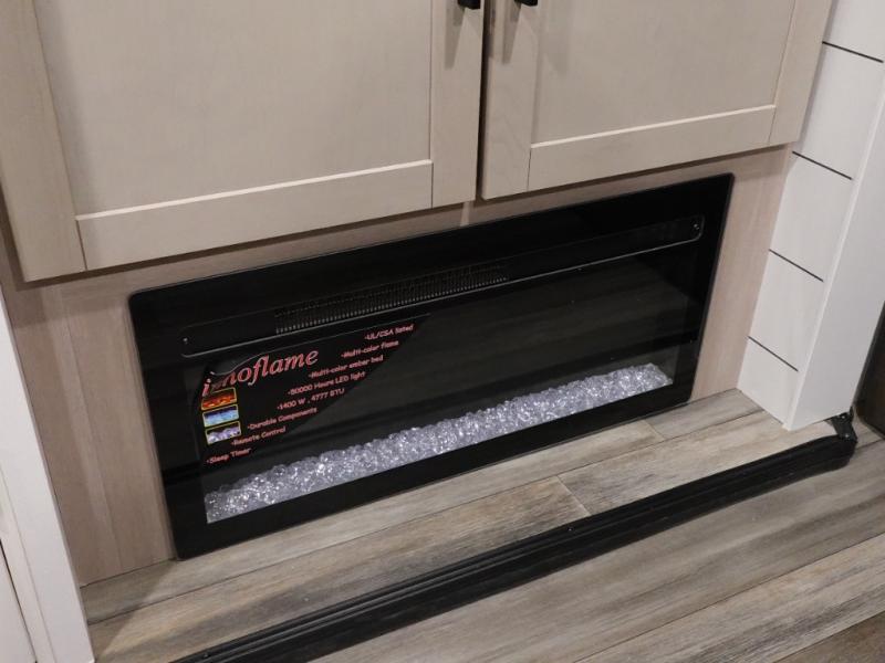 Escape to adventure in our stunning travel trailer, featuring a tranquil rear bedroom with a plush sleeping area, elegant nightstand, sophisticated dresser, and spacious closet. The luxurious full bathroom is a serene oasis, complete with a sleek medicine cabinet for storing essentials. Plus, the convenient closet with washer and dryer prep provides the option to stay fresh and clean on the go. The gourmet kitchen is equipped with a spacious fridge, high-performance microwave, and stylish overhead cabinet for storing cookware and dishes. The charming roll-top dinette table offers a cozy spot for meals or relaxation, perfect for savoring a morning coffee or enjoying a romantic dinner. The vibrant front living room is a hub for entertainment and relaxation, featuring a state-of-the-art entertainment center with a warm and inviting fireplace, the plush theater seating is perfect for movie nights, and the versatile bi-fold sofa offers additional sleeping space or a comfortable spot to lounge.