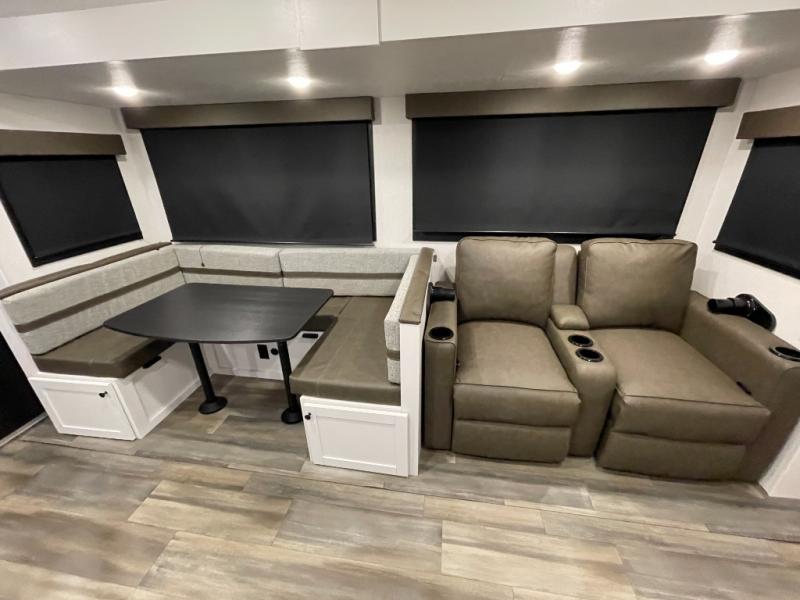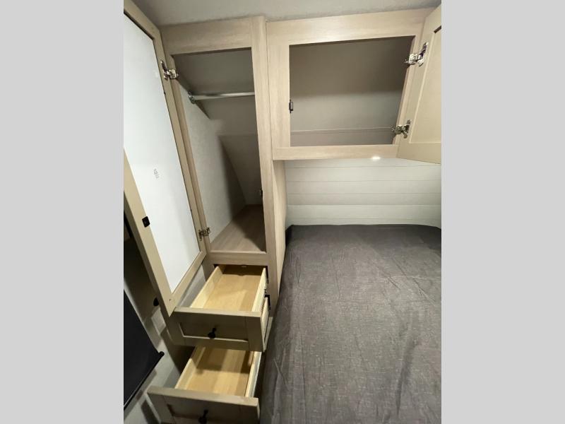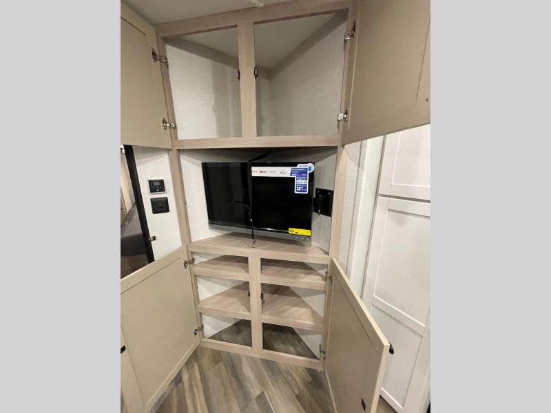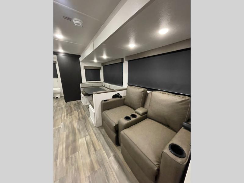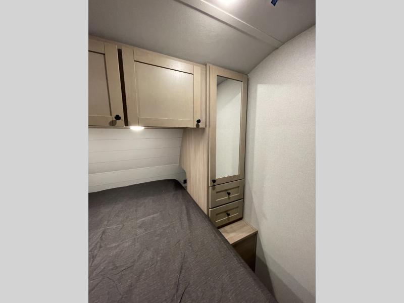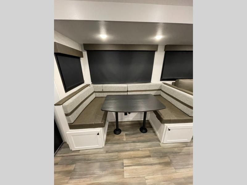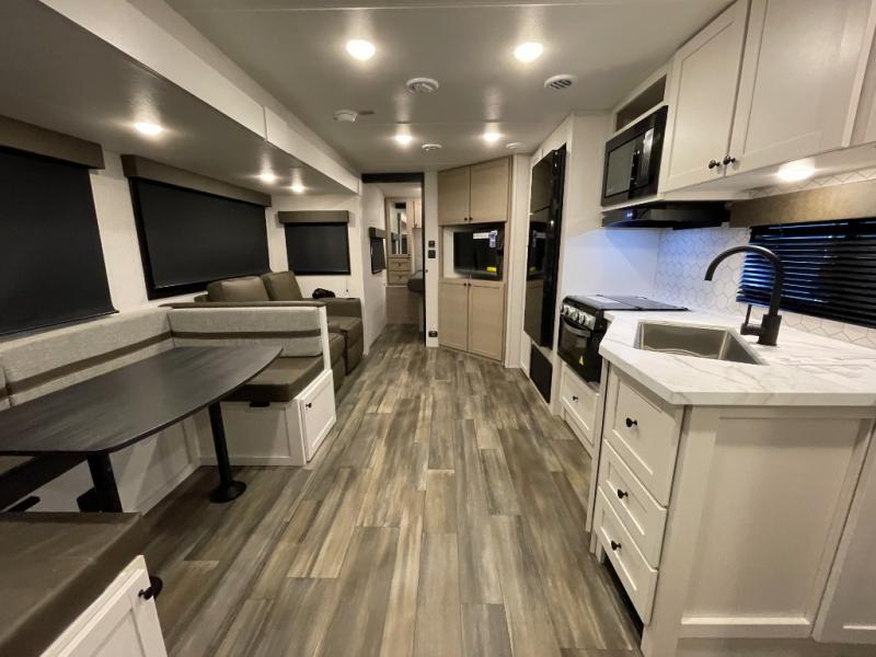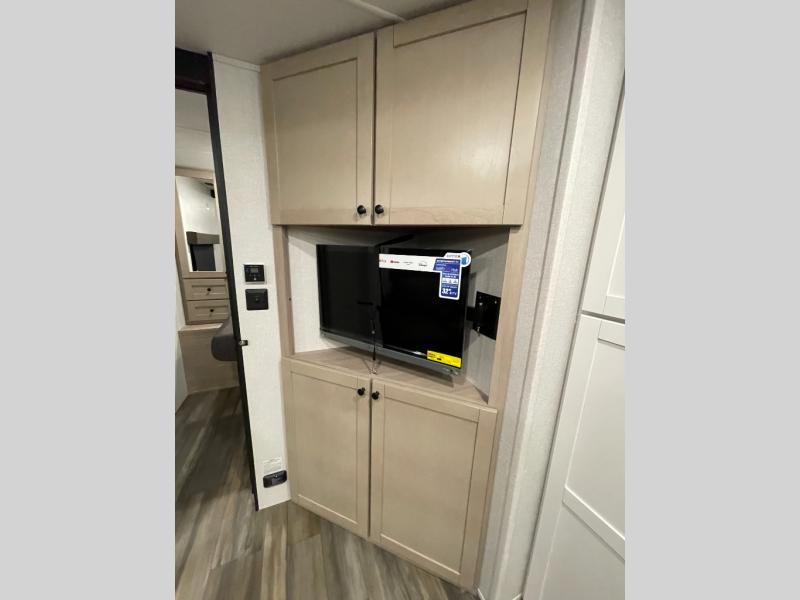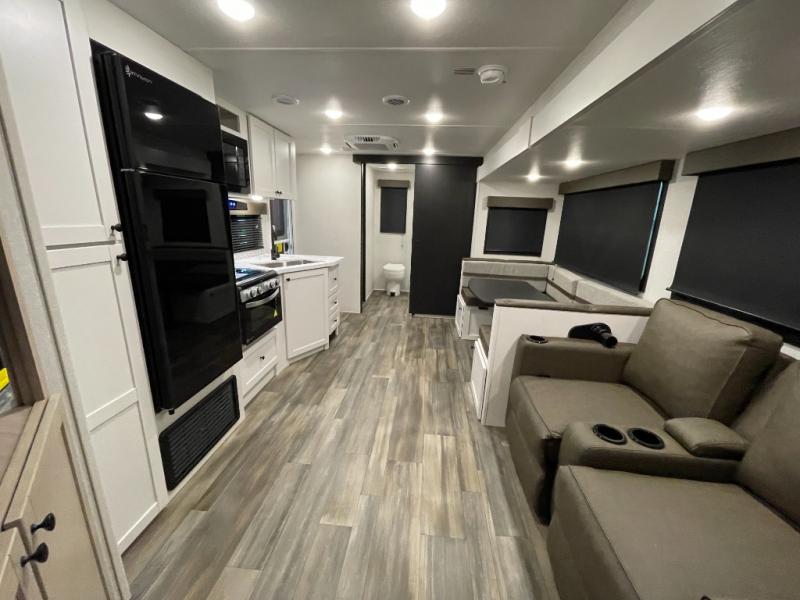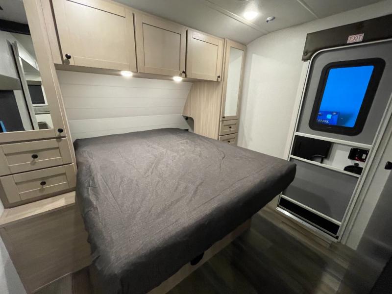 You will love all that this travel trailer has to offer! From the dual entry doors to the full rear bathroom with a radius shower and a large walk-in closet to keep your linens close. Prepare your best meals with the three burner cooktop and 17" oven then enjoy them at the U-shaped dinette and play a card game after dinner or you can relax on the tri-fold sofa and watch your favorite movie on the smart HDTV. The front private bedroom has a queen bed, wardrobes on either side for your hang up clothes, and even an entrance/exit door to quietly slip out for a quick fishing trip in the early mornings!