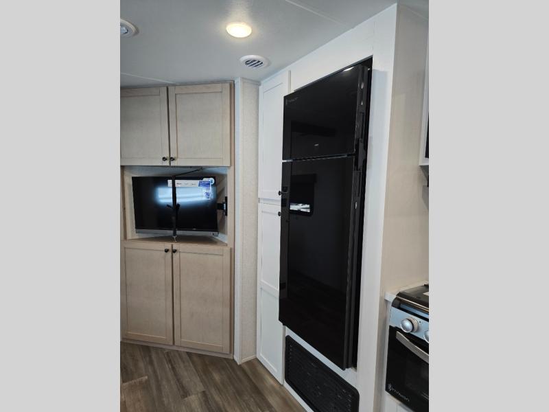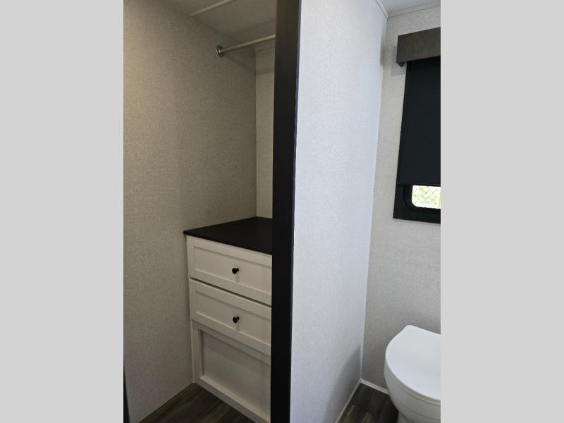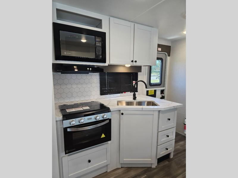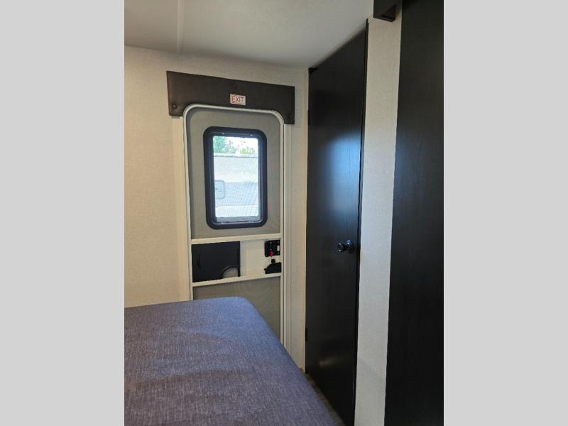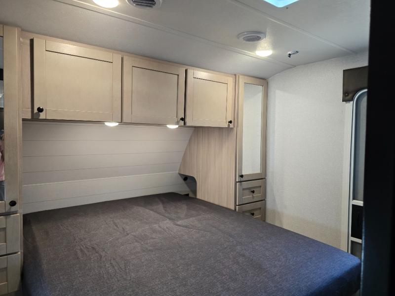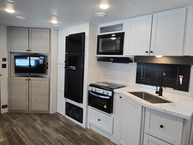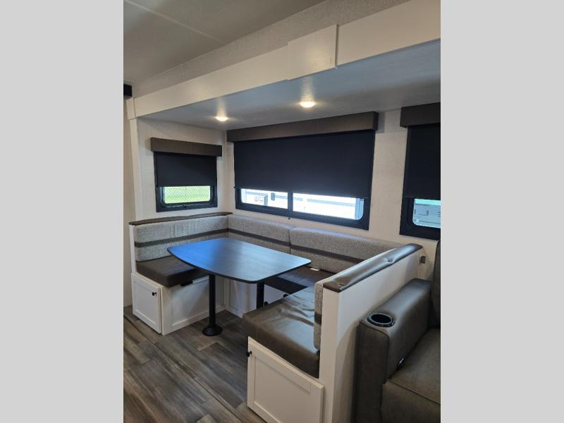 You will love all that this travel trailer has to offer! From the dual entry doors to the full rear bathroom with a radius shower and a large walk-in closet to keep your linens close. Prepare your best meals with the three burner cooktop and 17" oven then enjoy them at the U-shaped dinette and play a card game after dinner or you can relax on the tri-fold sofa and watch your favorite movie on the smart HDTV. The front private bedroom has a queen bed, wardrobes on either side for your hang up clothes, and even an entrance/exit door to quietly slip out for a quick fishing trip in the early mornings!