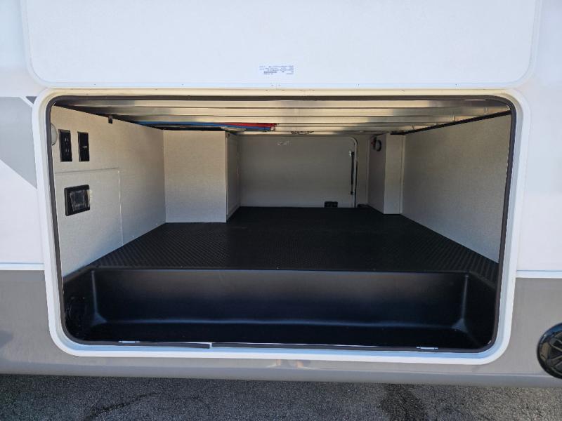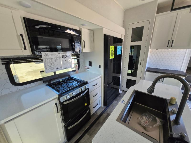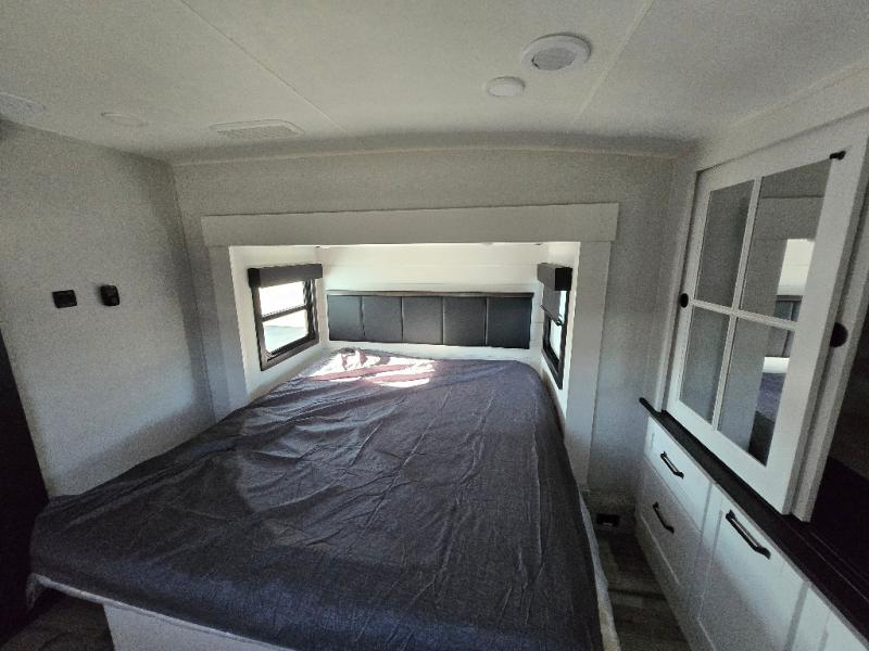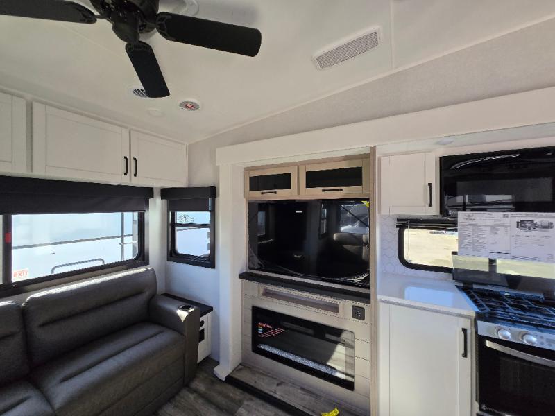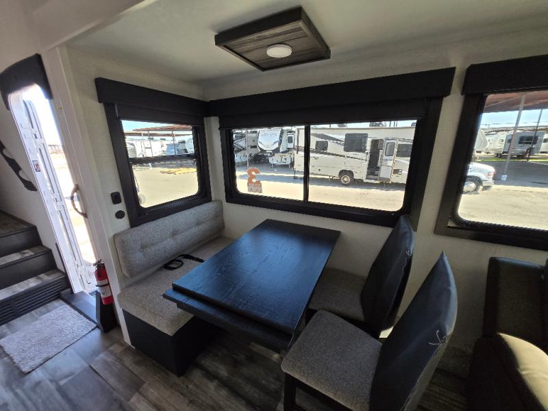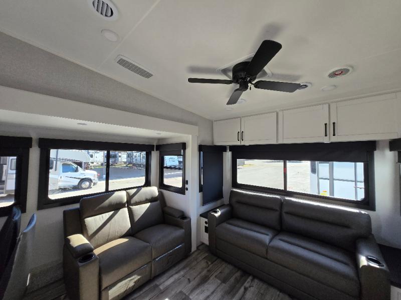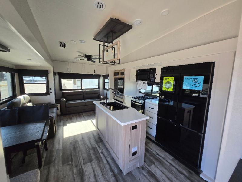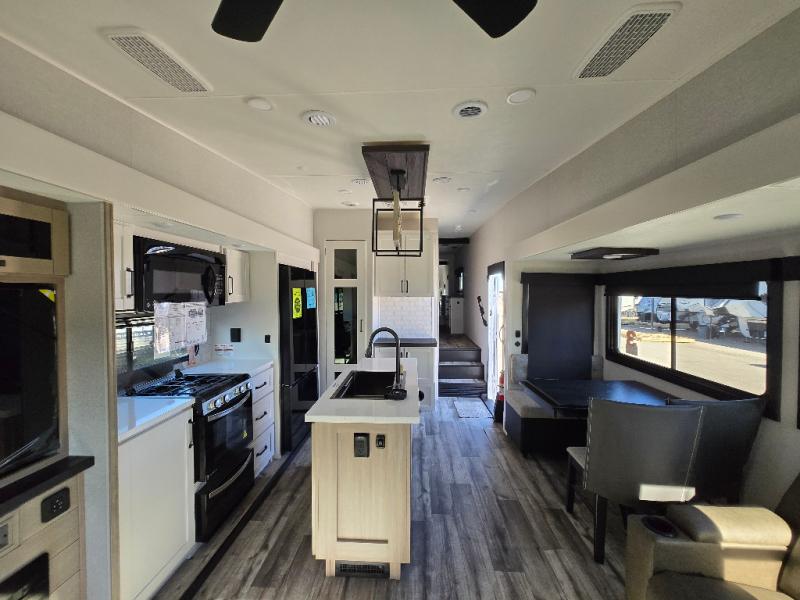 The perfect fifth wheel is found with this Roamer! Once you arrive at the campsite, you can put out the two power awnings and relax in your camp chairs. There are plenty of comfortable seating spaces in the rear living area, including a tri-fold sofa, theater seat, plus a table and chairs with a bench. The kitchen island provides extra counter space, along with a multi-functional sink, and you'll love having a pantry, hutch, and Hi Sense 12V black glass refrigerator for storage. The owners will enjoy their own space up front in the private bedroom, complete with a king bed slide, a closet with shelves and drawers below, a storage chest, plus washer and dryer prep!