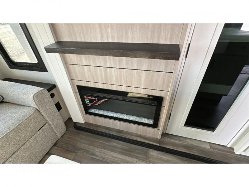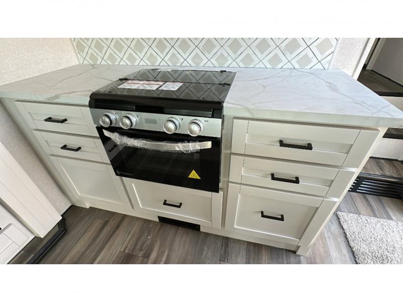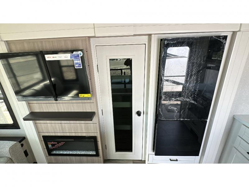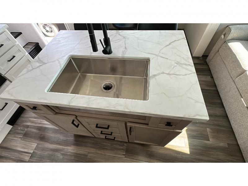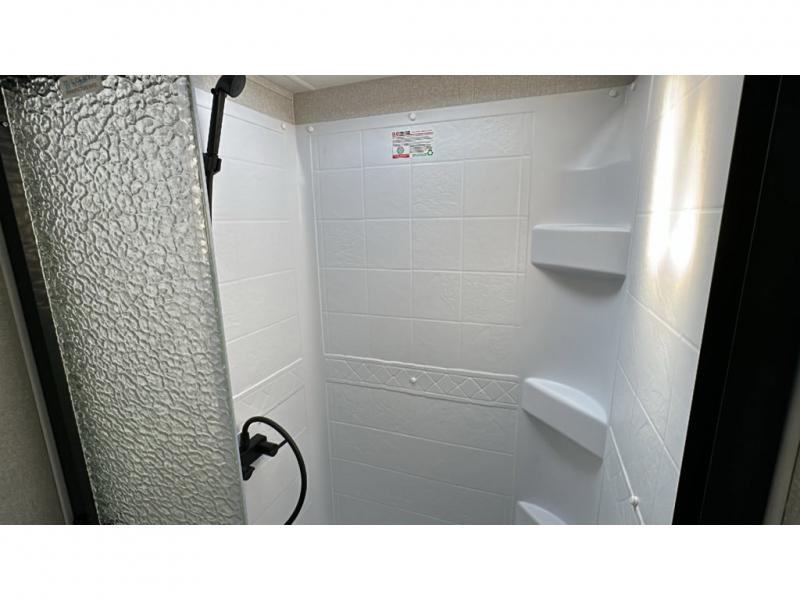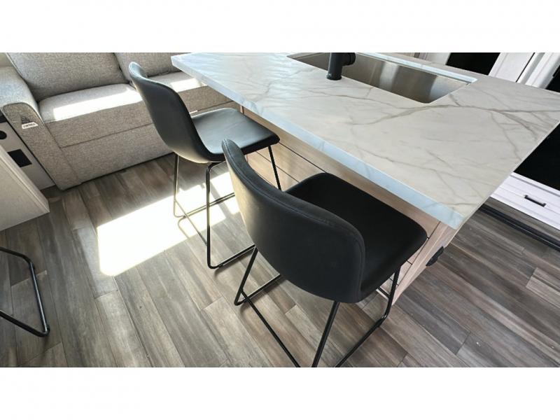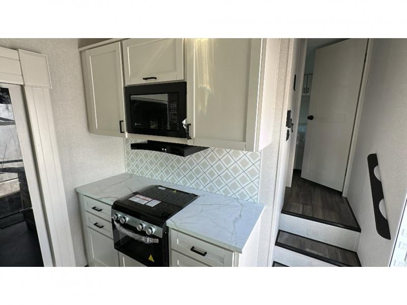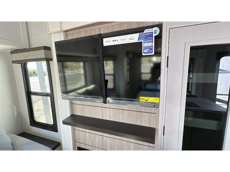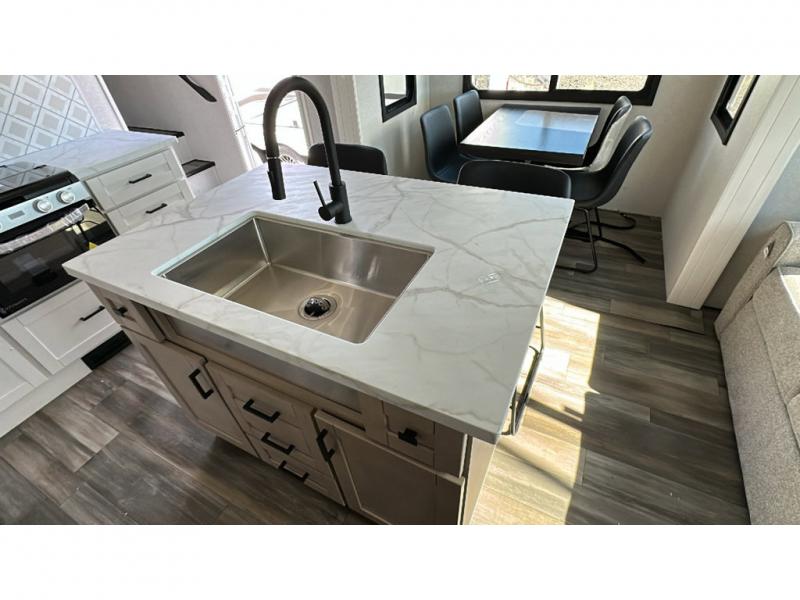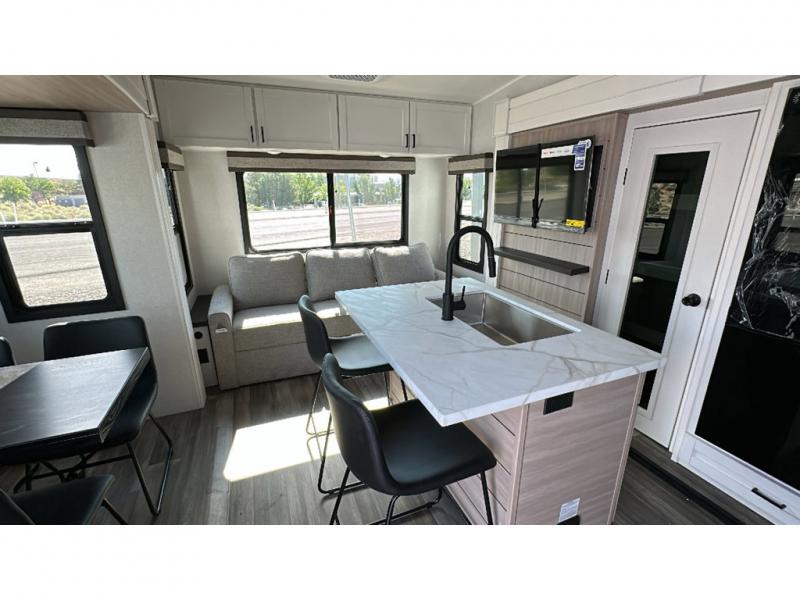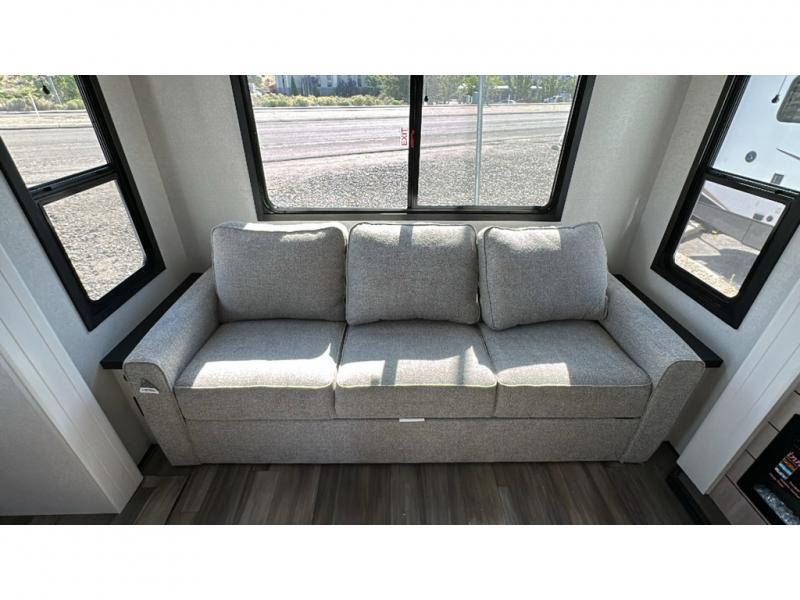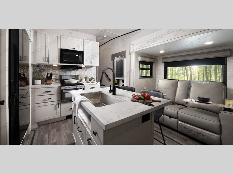 This well equipped fifth wheel features an open concept kitchen and living area with a dining table and two chairs within a slide just to the left of the entry door. Additionally a center island offers two bar height seats for quick meals or gathering with friends. The island also features a sink which makes prep work and cleanup easy. More counter space can be found along the interior wall where you will also find a three burner range with oven and an overhead microwave. There is plenty of cabinet storage and drawer space, a walk-in pantry, and a 10 cu. ft. 12V refrigerator within the roadside slide. From the bi-fold sofa along the rear wall you can easily view the 40" TV, and the sofa can be converted into sleeping space for two more overnight guests. The full bath will let you freshen up each day and the front private bedroom with a queen bed will feel just like home!