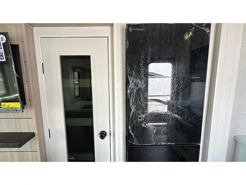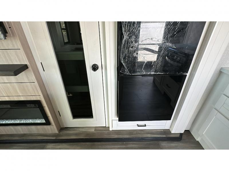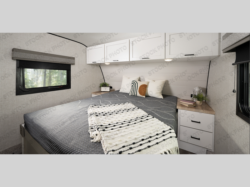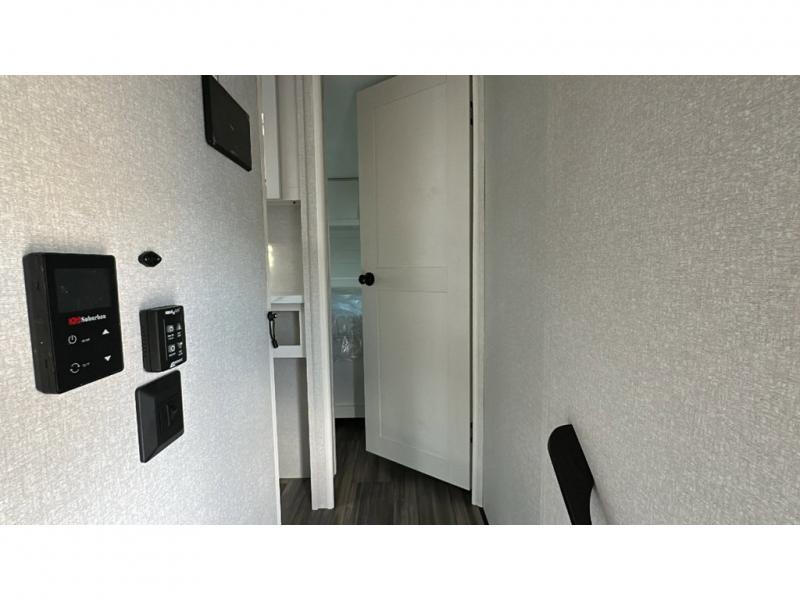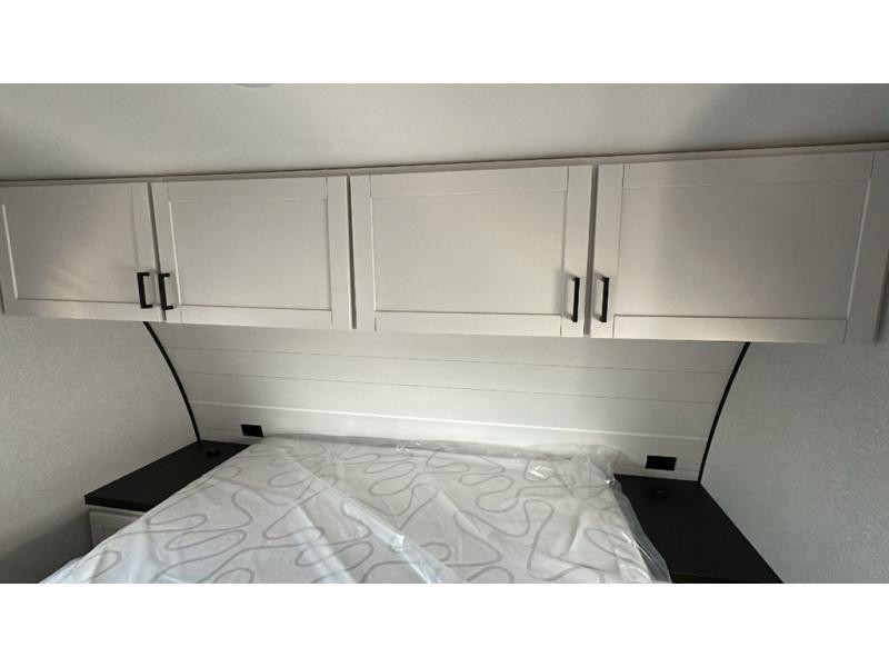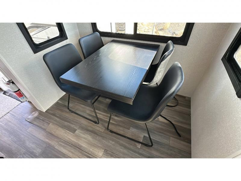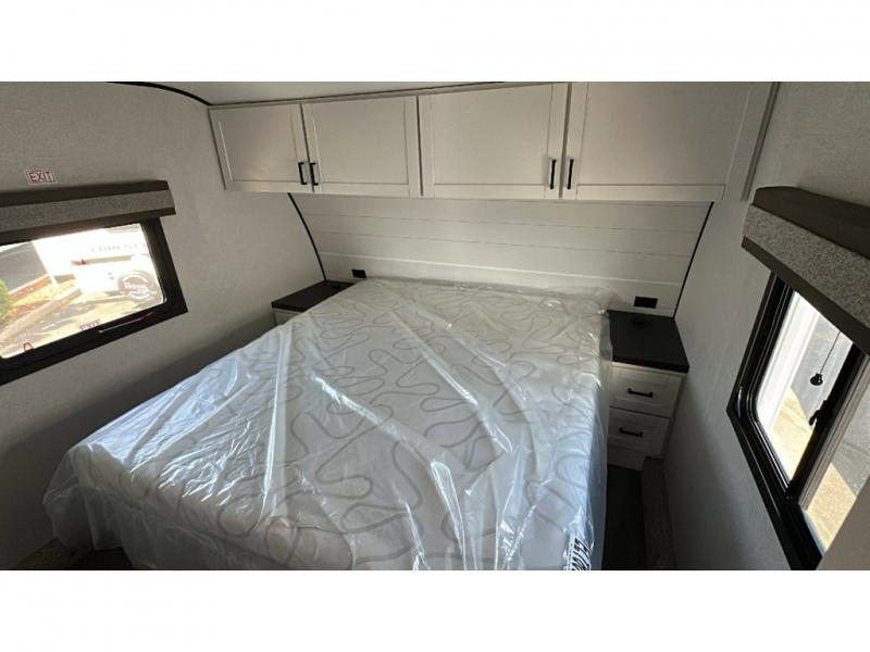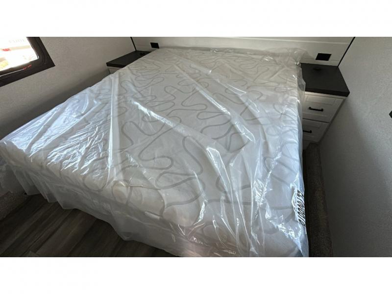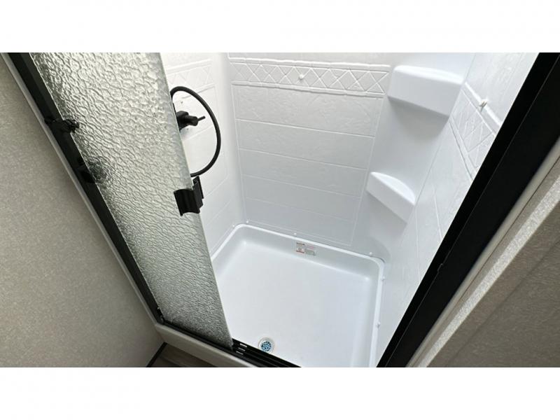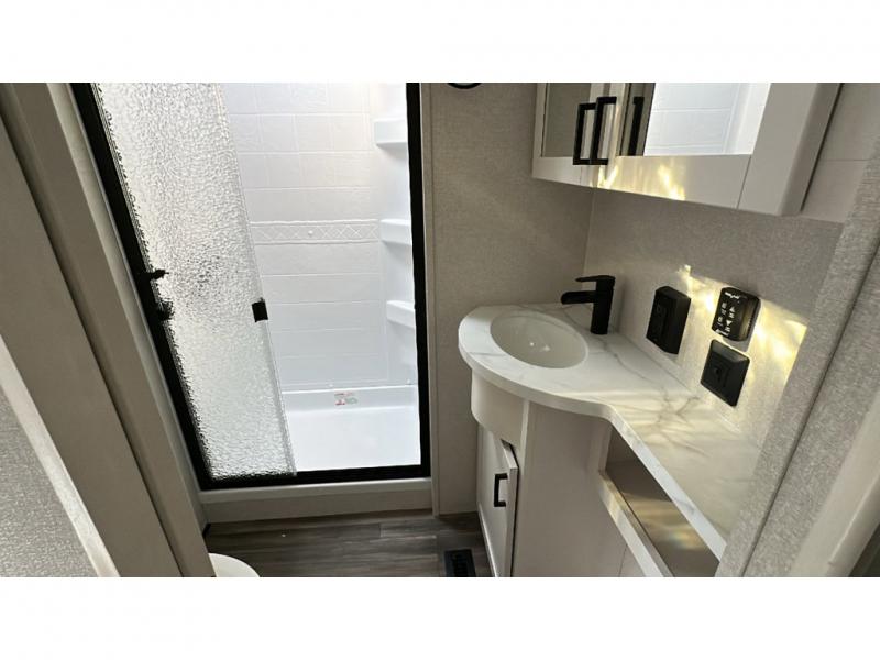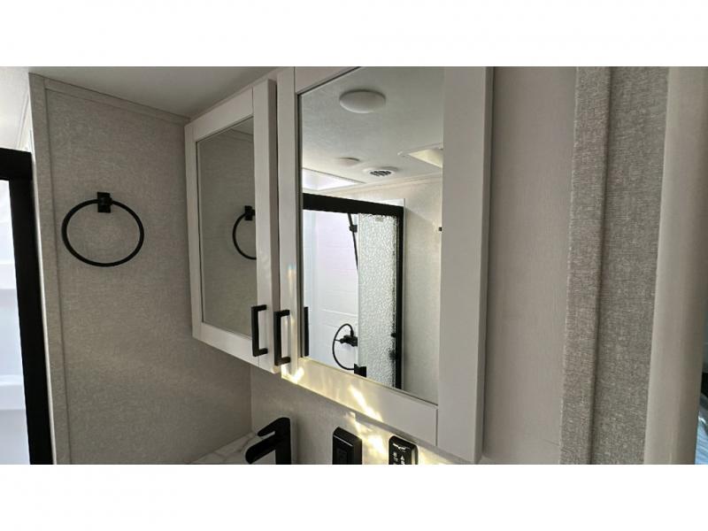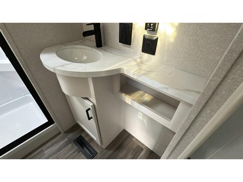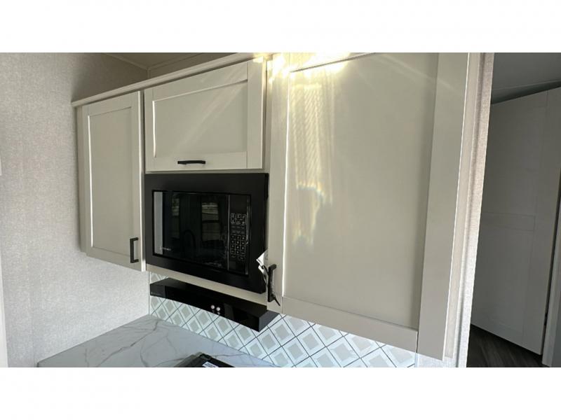 This well equipped fifth wheel features an open concept kitchen and living area with a dining table and two chairs within a slide just to the left of the entry door. Additionally a center island offers two bar height seats for quick meals or gathering with friends. The island also features a sink which makes prep work and cleanup easy. More counter space can be found along the interior wall where you will also find a three burner range with oven and an overhead microwave. There is plenty of cabinet storage and drawer space, a walk-in pantry, and a 10 cu. ft. 12V refrigerator within the roadside slide. From the bi-fold sofa along the rear wall you can easily view the 40" TV, and the sofa can be converted into sleeping space for two more overnight guests. The full bath will let you freshen up each day and the front private bedroom with a queen bed will feel just like home!