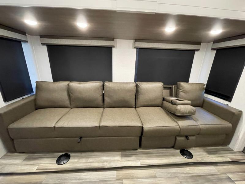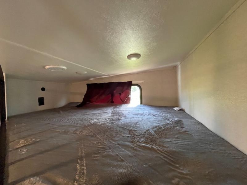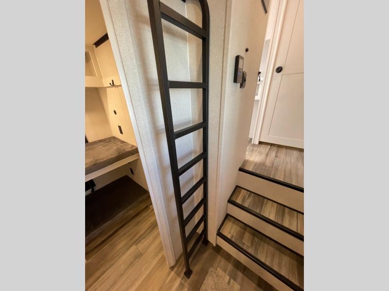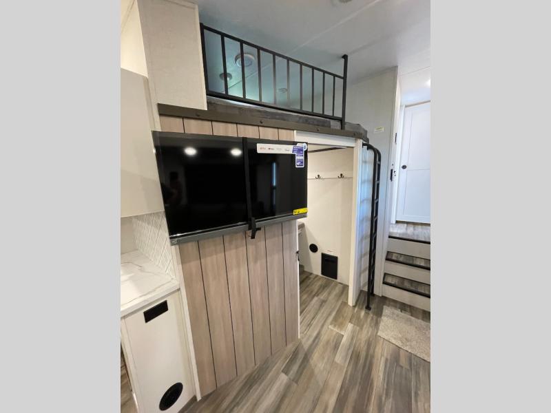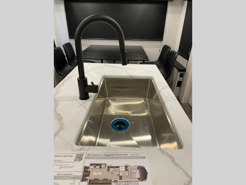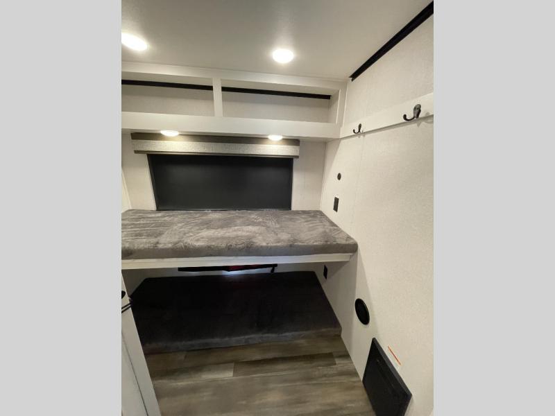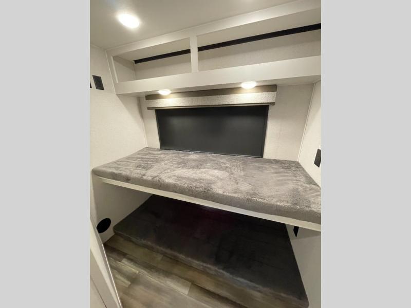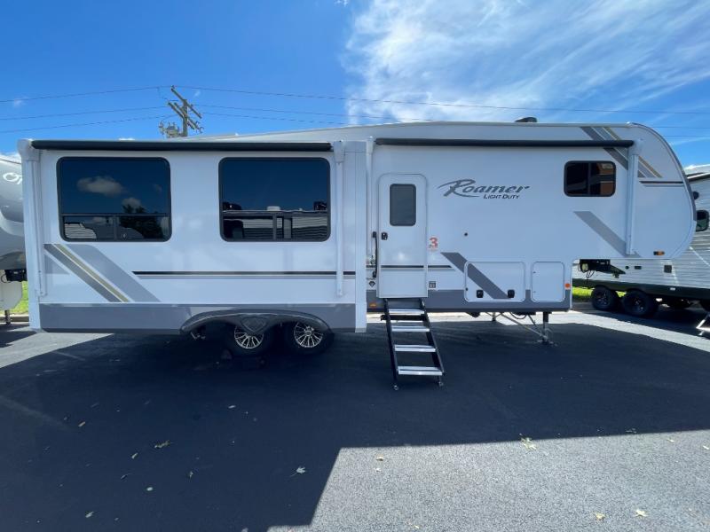 Enjoy this Roamer Light Duty bunkhouse fifth wheel! A second bedroom with a 28" x 74" bunk and a loft above can be easily used for a second bedroom or maybe you need office space for working on the go. And the mega lounge in the main living room provides even more sleeping space. You will love the modern interior with hardwood cabinet doors, 75 lb. ball bearing drawer glides, LED lighting, stainless steel appliances, and dual opposing flush floor slides. You will enjoy your own space in the front private bedroom with a queen bed, and the spacious full bath is close by for convenience. Outside, two awnings provide lots of outdoor space to relax with camp chairs protected from the elements both day and night, and there is TV hook-up available as well as hook-up for a grill, plus LP quick connect too. Outside storage is also available, along with an outside shower to quickly rinse off dirty feet before heading inside.
