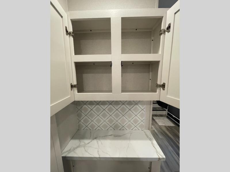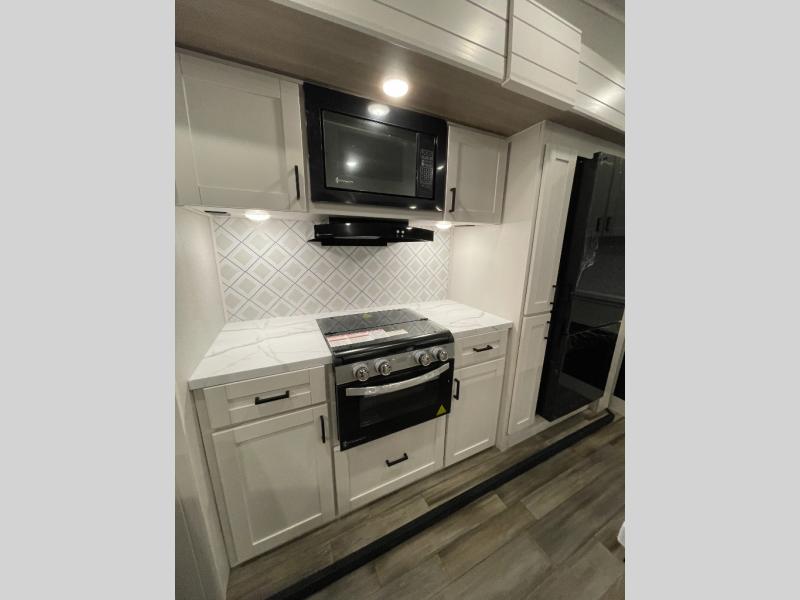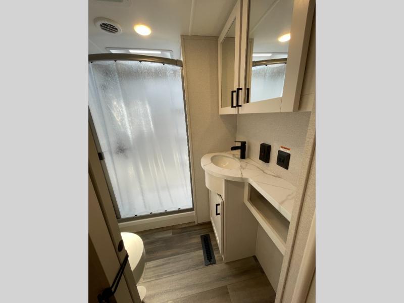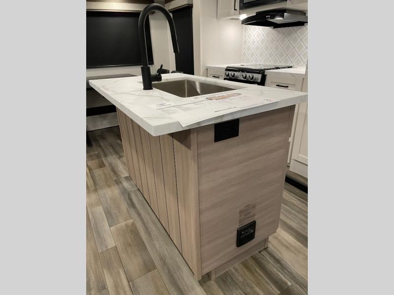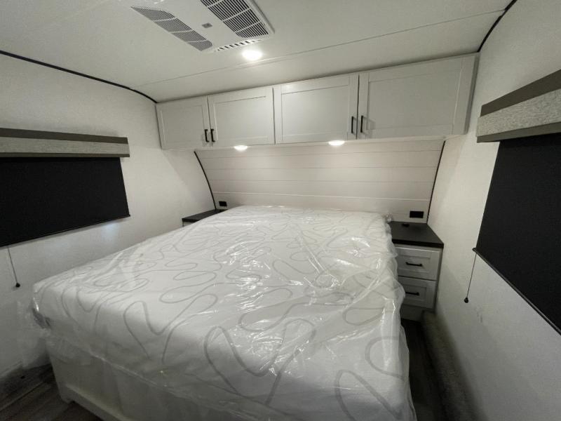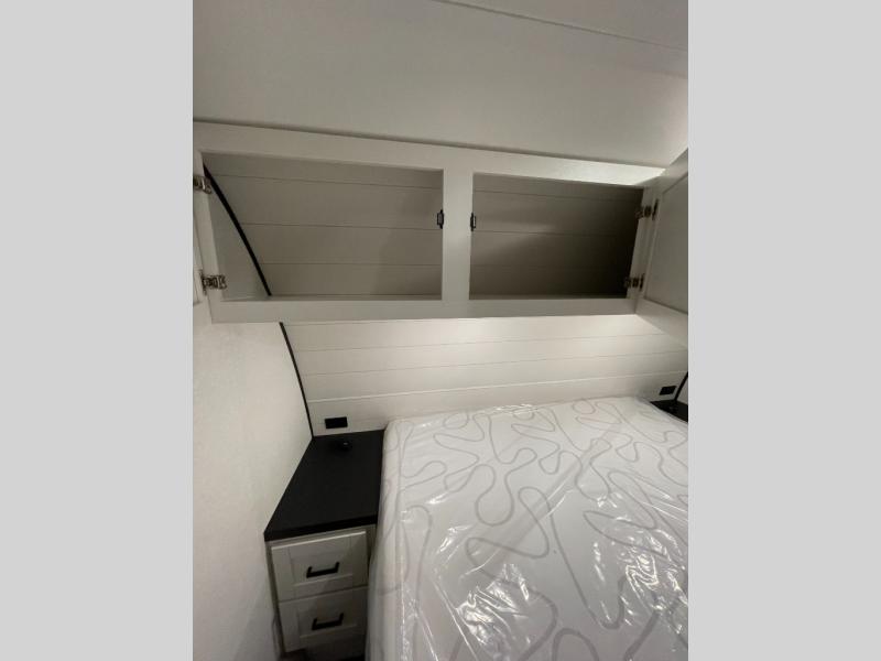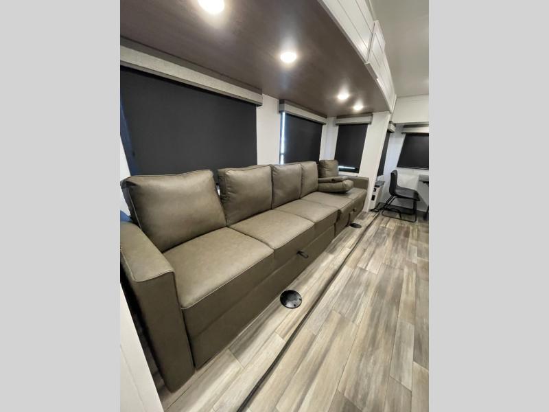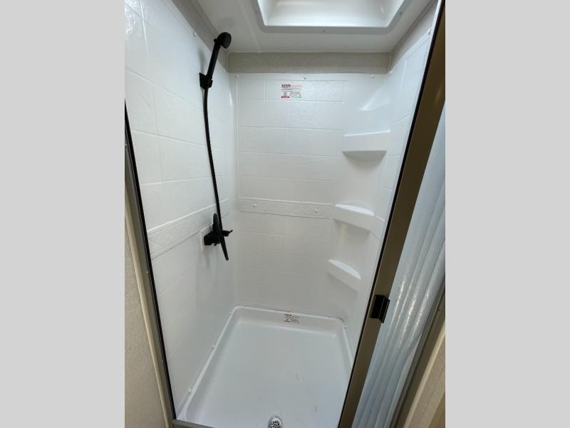 Enjoy this Roamer Light Duty bunkhouse fifth wheel! A second bedroom with a 28" x 74" bunk and a loft above can be easily used for a second bedroom or maybe you need office space for working on the go. And the mega lounge in the main living room provides even more sleeping space. You will love the modern interior with hardwood cabinet doors, 75 lb. ball bearing drawer glides, LED lighting, stainless steel appliances, and dual opposing flush floor slides. You will enjoy your own space in the front private bedroom with a queen bed, and the spacious full bath is close by for convenience. Outside, two awnings provide lots of outdoor space to relax with camp chairs protected from the elements both day and night, and there is TV hook-up available as well as hook-up for a grill, plus LP quick connect too. Outside storage is also available, along with an outside shower to quickly rinse off dirty feet before heading inside.