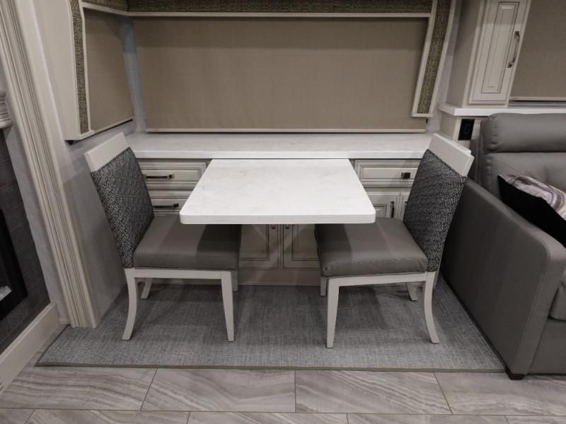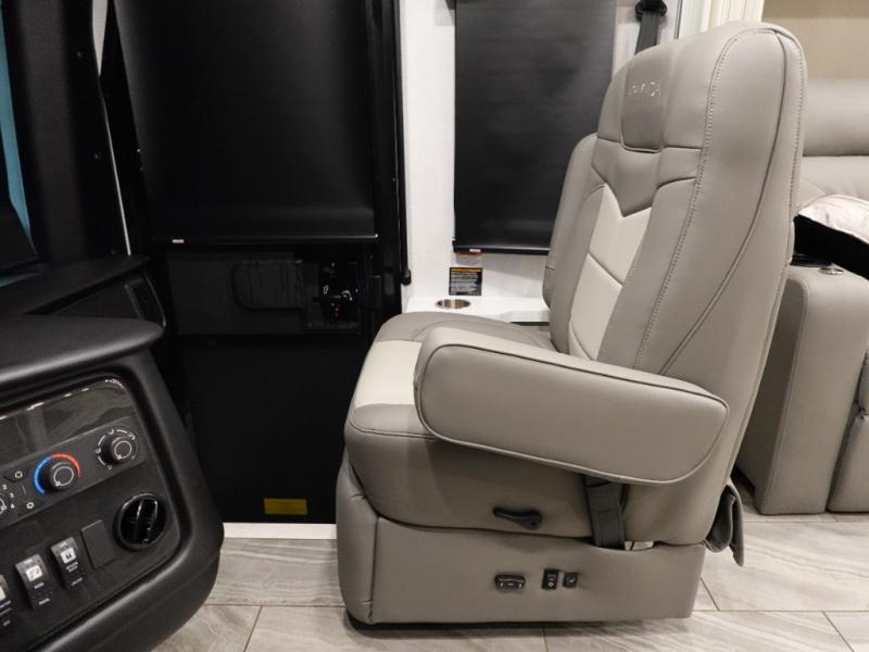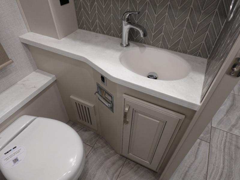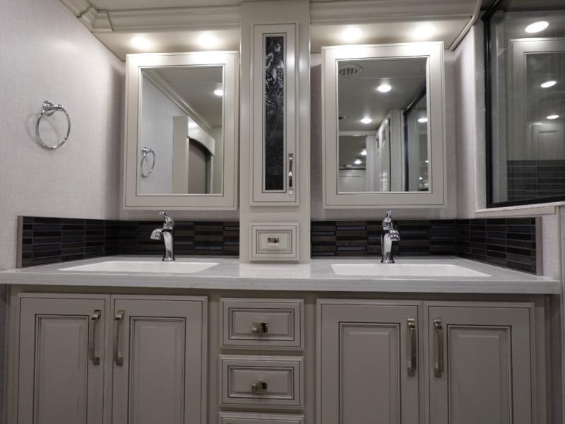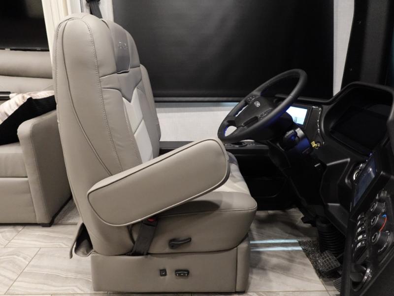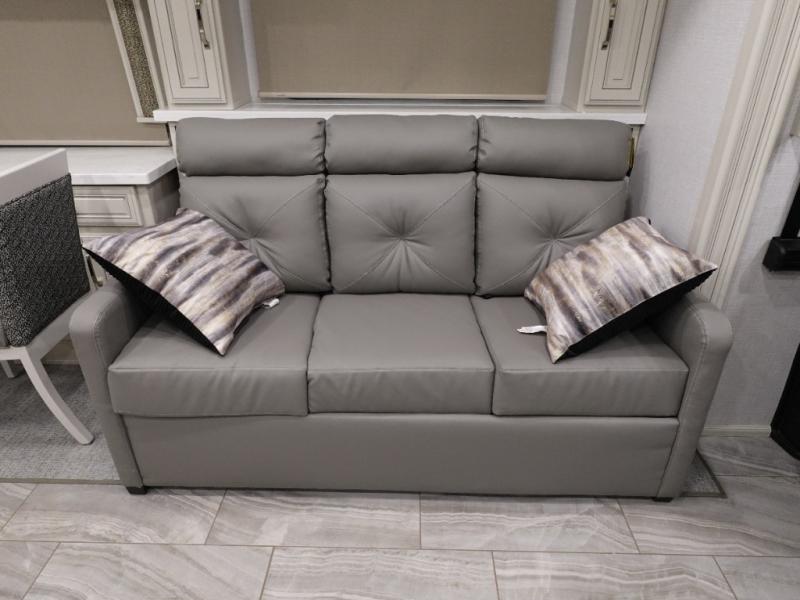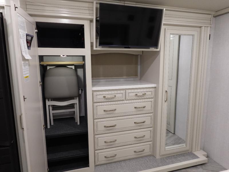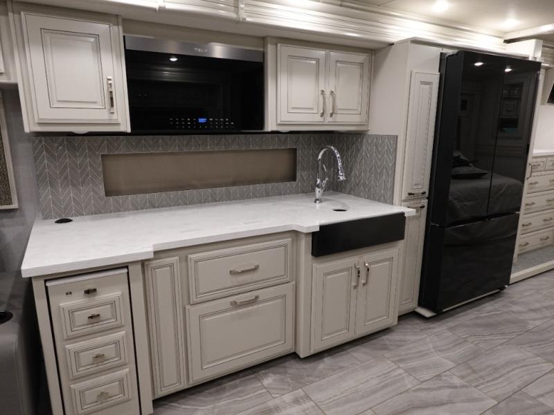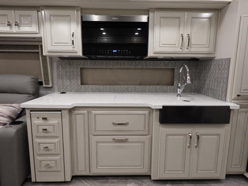 The luxury on this Armada Class A diesel motorhome will amaze you! The first luxurious details you'll notice are the full and half bathroom. The full bathroom sits back in the master suite, and it contains a dual-sink vanity so that you both can get ready at once. This full bathroom also has a 50" x 28" shower with seat and a stackable washer/dryer, so you'll be living the high-class life. The kitchen is the next section that will catch your eye with its pull-out pantry, convection microwave, residential refrigerator with ice/water in the door, and a dishwasher. You won't even skip a beat going from home to coach when preparing meals. The living area is quite comfortable with its sofa sleeper with a pull-out full mattress, a loveseat with storage, and free-standing dinette with credenza.
