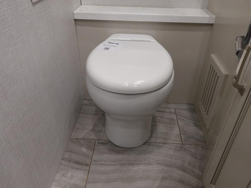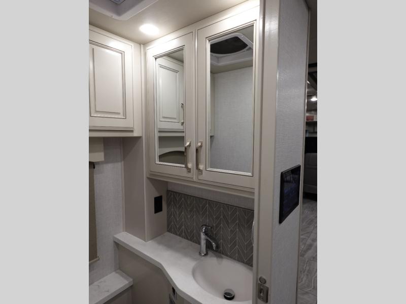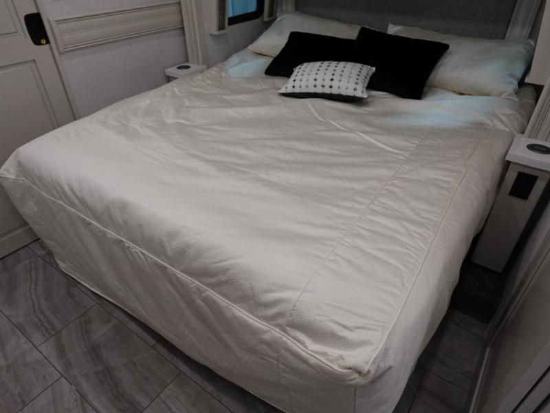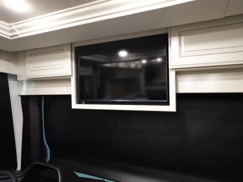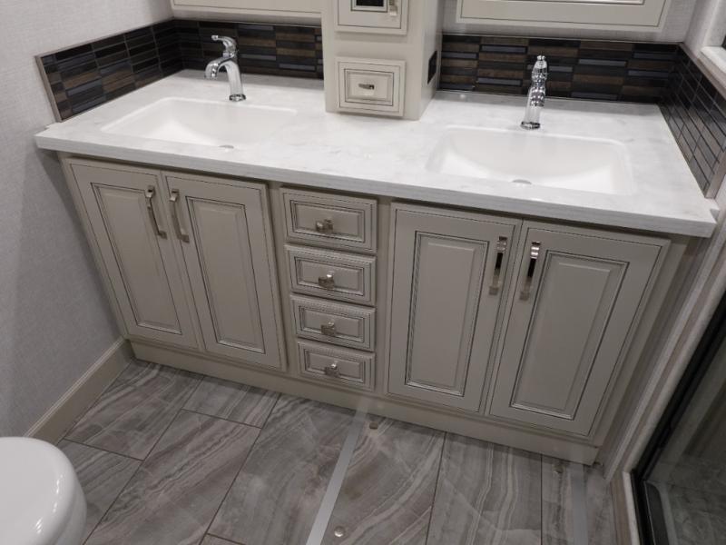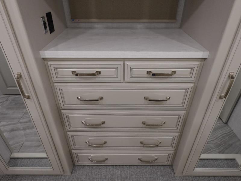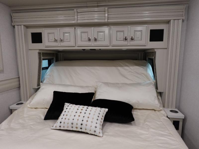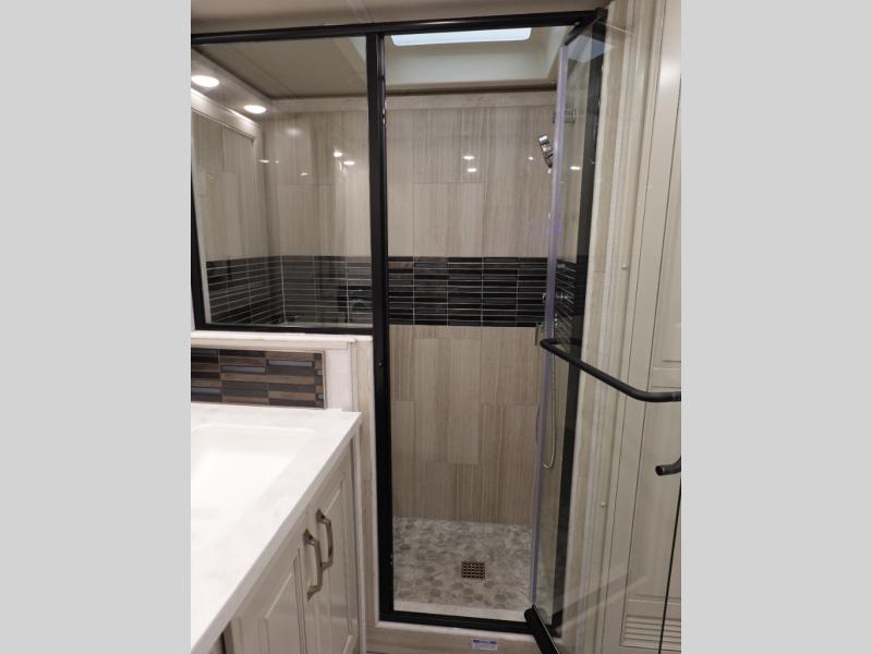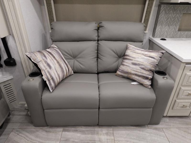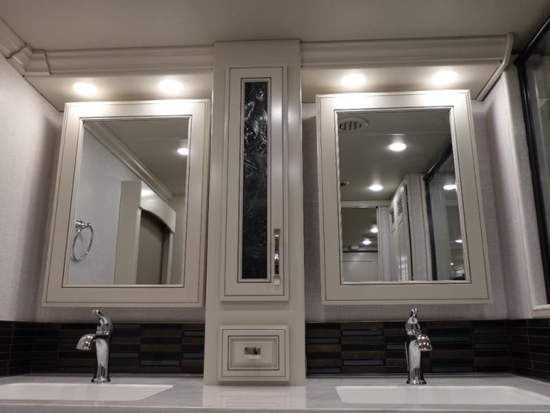 The luxury on this Armada Class A diesel motorhome will amaze you! The first luxurious details you'll notice are the full and half bathroom. The full bathroom sits back in the master suite, and it contains a dual-sink vanity so that you both can get ready at once. This full bathroom also has a 50" x 28" shower with seat and a stackable washer/dryer, so you'll be living the high-class life. The kitchen is the next section that will catch your eye with its pull-out pantry, convection microwave, residential refrigerator with ice/water in the door, and a dishwasher. You won't even skip a beat going from home to coach when preparing meals. The living area is quite comfortable with its sofa sleeper with a pull-out full mattress, a loveseat with storage, and free-standing dinette with credenza.