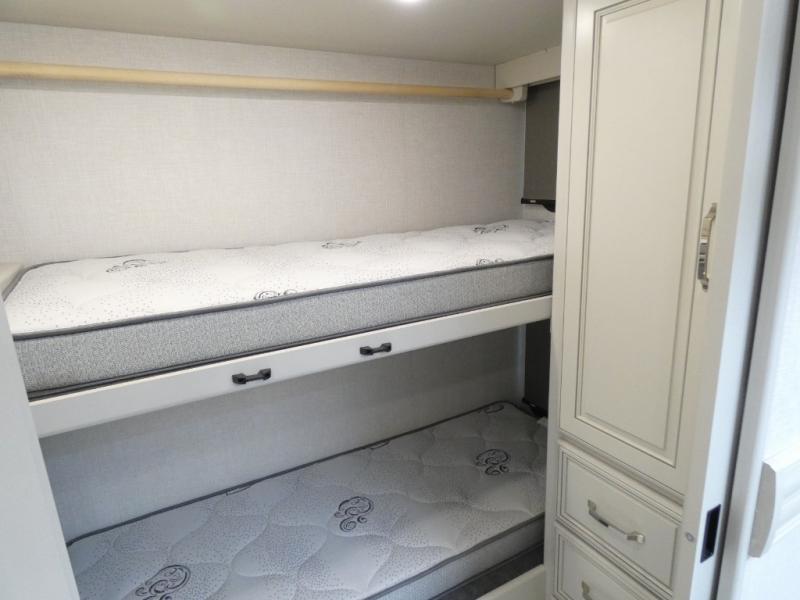 This Armada Class A diesel motorhome is filled with high-class amenities and luxurious furnishings! The back of this coach has a small private bunkhouse that is perfect for the kids or grandkids to spend the night in. Separating the bunkhouse from the master bedroom is a walk-through bathroom that allows campers from both bedrooms to have easy access at night. The master bedroom is undeniably comfortable with its Encore Series king bed, opposing slides, LED TV, dresser, and washer/dryer. Out in the main living area, you'll have more space once again with another set of opposing slides. These slides create lots of room for the sofa with storage, sofa sleeper with queen mattress, and U-shaped dinette. Spend some time getting a couple of meals together in the kitchen with the convection microwave and two-burner induction cooktop. You will also appreciate the residential refrigerator with ice and water in the door.