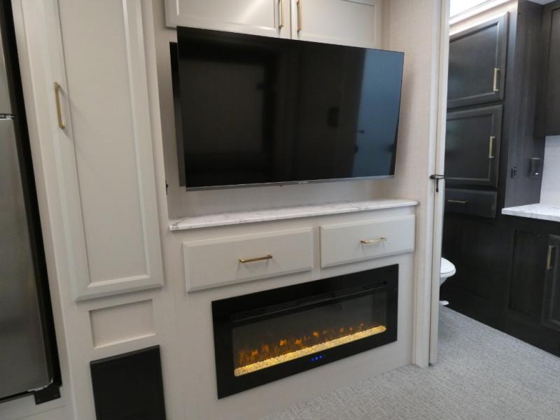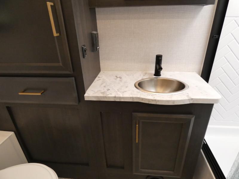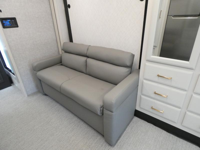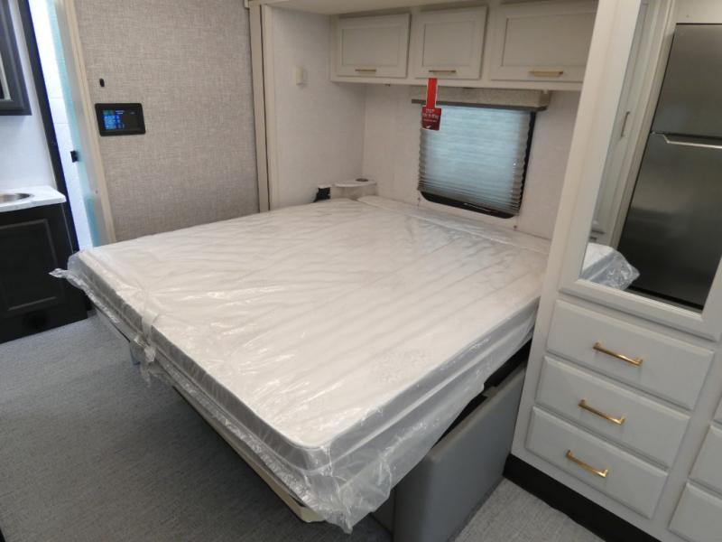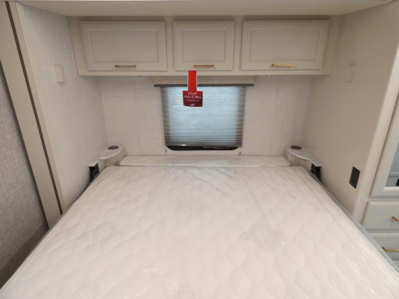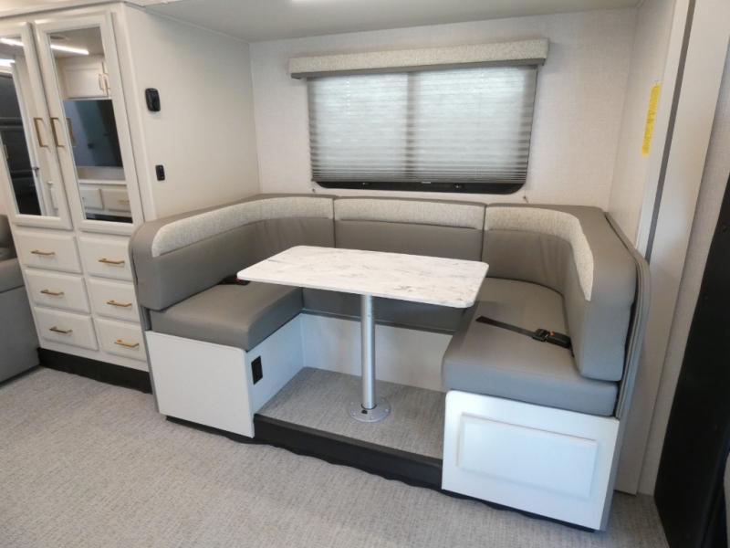 Pack your bags and head off on new adventures in this spacious coach! You will love gathering around the U-shaped dinette for a game or a meal, and the full-wall slide provides ample space to move around. An overhead bunk provides sleeping space for little ones or to be used as extra storage space. Since there is a queen Murphy bed, you will enjoy versatile seating and sleeping space, and the full rear bath will allow you to freshen up each day without having to use the camp's facilities. This model also includes a three burner range/convection microwave combo to cook meals on plus an exterior kitchen with a mini fridge, pull-out griddle, and storage when the weather is nice!