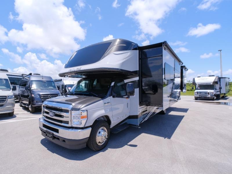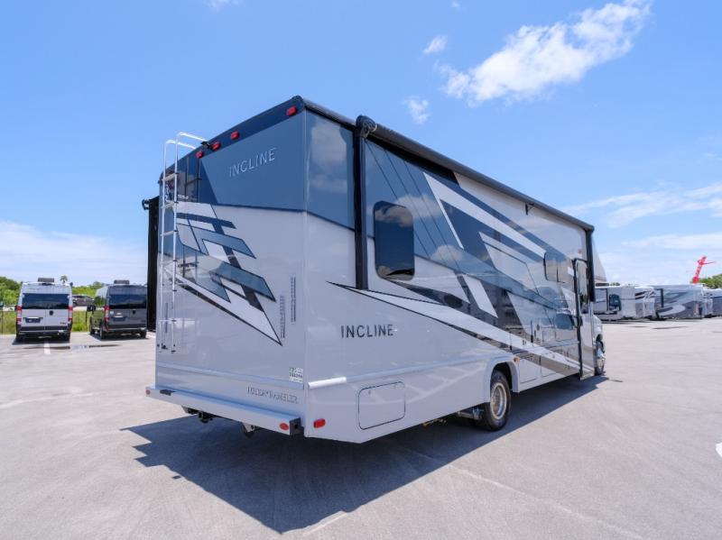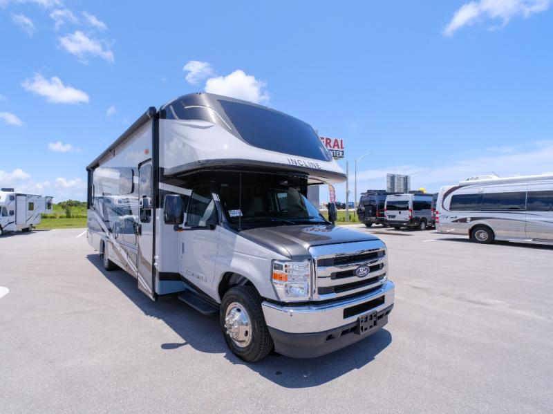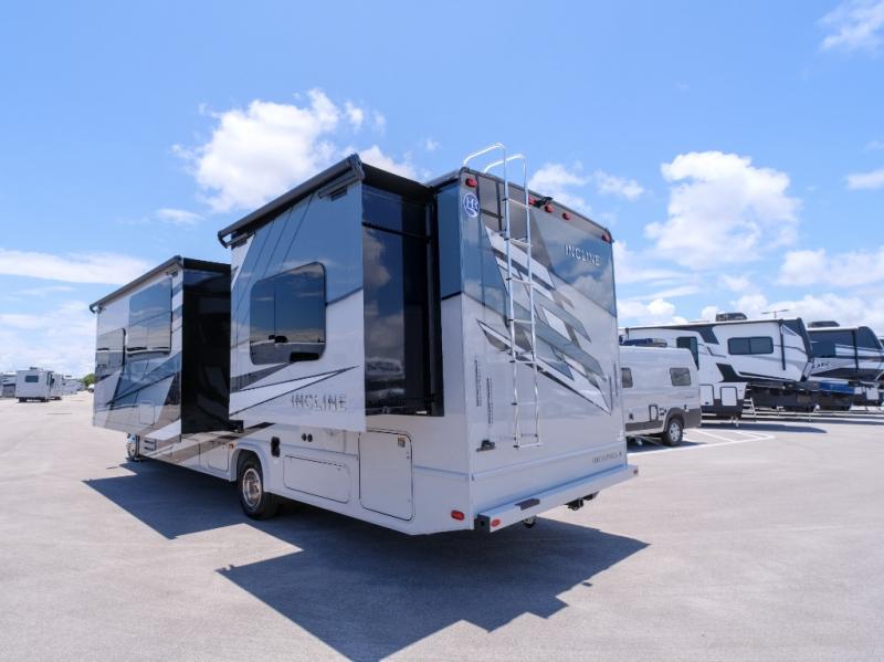 With any Incline Class C gas motorhome by Holiday Rambler, you will enjoy unrivaled performance, unbeatable storage, and luxury at every turn! You will love the journey just as much as the destination with reclining back and swivel captain's chairs and side view cameras, plus there is a Ford 7.3L V8 engine for power you can feel. Each model features painted steel frame construction with a Powerlock System ll that interlocks the walls to the roof for added durability, along with Vacu-Bond aluminum framed sidewalls, roof, and floor. Outside, you'll find automatic hydraulic leveling jacks, patio lighting, slam latch luggage door handles, and a Winegard Air 360+ that will allow you to stay connected as you travel. Head inside to find Surf-X countertops, slide out fascia with coordinating interior wood color, hidden hinge cabinet doors, kitchen backsplash, and many more comforts!