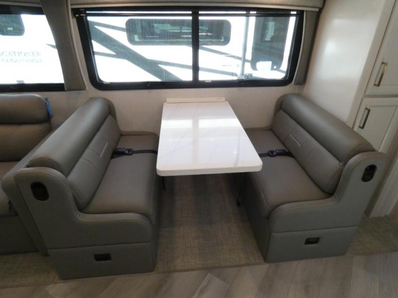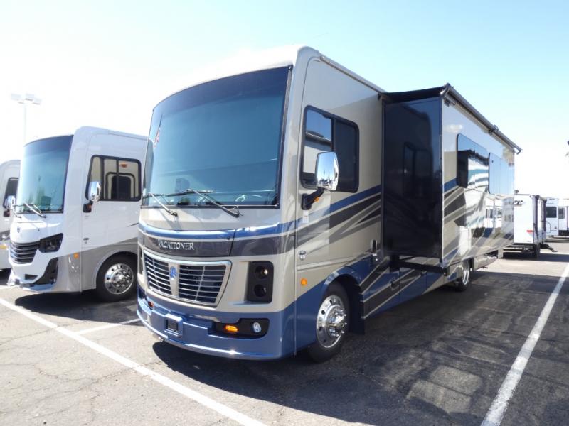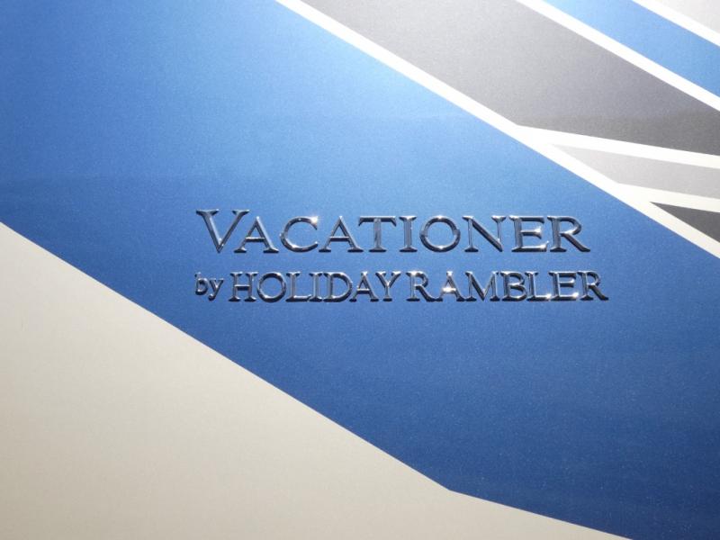 Escape the boring for fun trips in a Vacationer Class A gas motorhome by Holiday Rambler. You can easily make this coach your home-away-from home with features such as dual A/C units, vinyl tile flooring, and stainless steel appliances. The bus-style luggage doors will make for easy unloading, and the automatic hydraulic leveling jacks make setting up camp easier than ever. The Vacationer is constructed with a Powerlock System with interlocking floor, walls, and roof, plus premium gel exterior Vetrosina fiberglass skin with no wood substrate for added durability. Each model includes an automotive style dash with dual monitors, and MultiPlex house controls that can easily be controlled by your smart phone or tablet. The list of standard features doesn't stop there. You'll have an environmentally friendly 100W solar panel, an exterior entertainment center, large holding tank capacities, and so much more!
