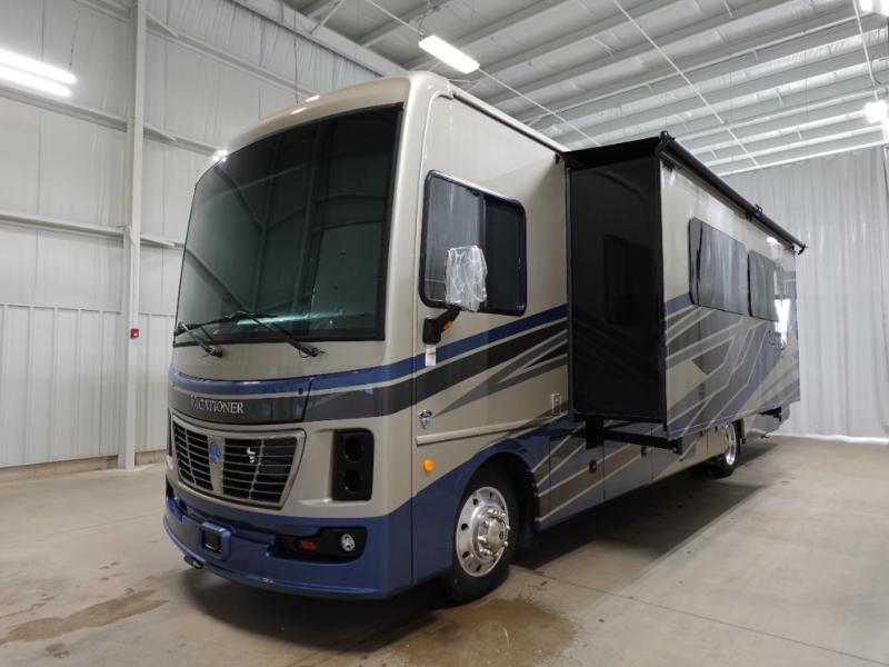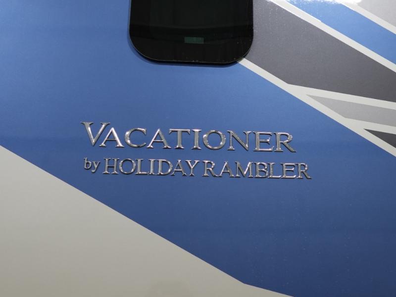Escape the boring for fun trips in a Vacationer Class A gas motorhome by Holiday Rambler. You can easily make this coach your home-away-from home with features such as dual A/C units, vinyl tile flooring, and stainless steel appliances. The bus-style luggage doors will make for easy unloading, and the automatic hydraulic leveling jacks make setting up camp easier than ever. The Vacationer is constructed with a Powerlock System with interlocking floor, walls, and roof, plus premium gel exterior Vetrosina fiberglass skin with no wood substrate for added durability. Each model includes an automotive style dash with dual monitors, and MultiPlex house controls that can easily be controlled by your smart phone or tablet. The list of standard features doesn't stop there. You'll have an environmentally friendly 100W solar panel, an exterior entertainment center, large holding tank capacities, and so much more!
