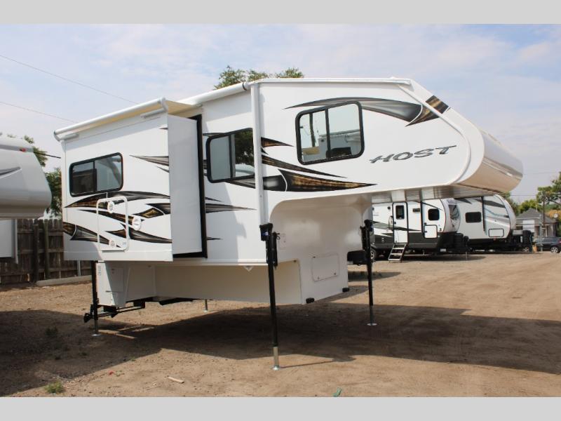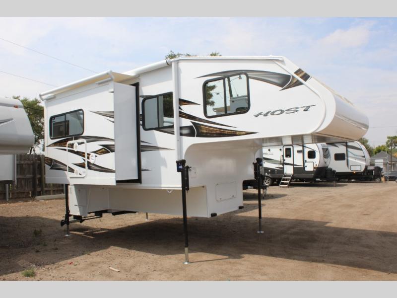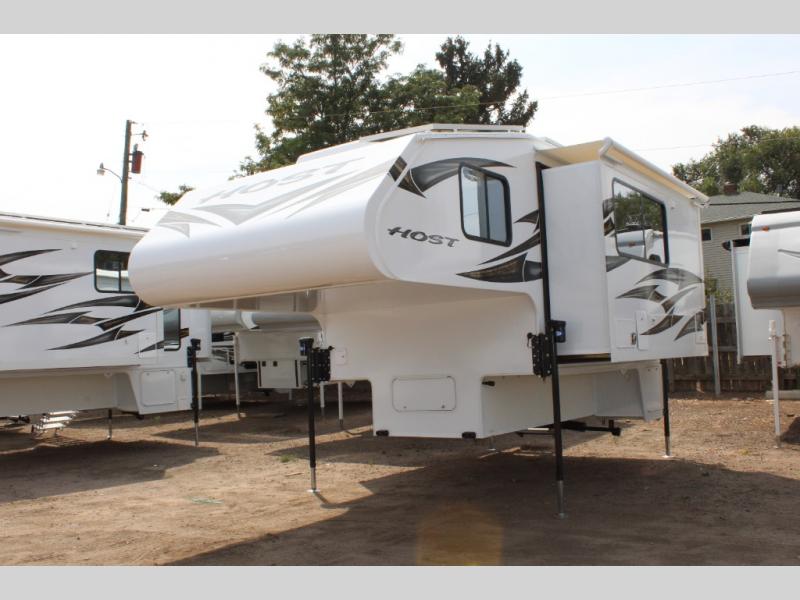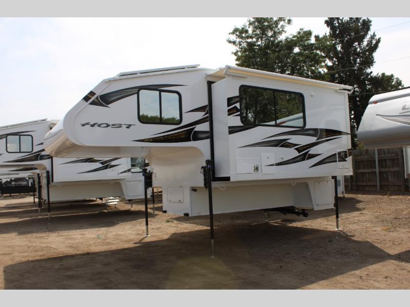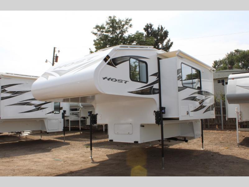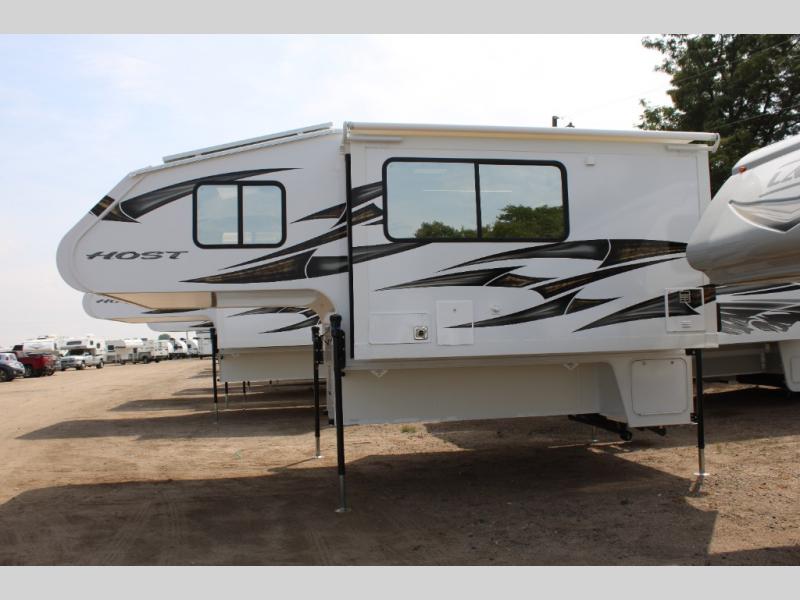 With any Host Industries Host Campers truck camper, there is ease of setting up with electric jacks with a wireless remote, and security when traveling thanks to the heavy duty camper tie down brackets. Each is constructed with two or three slide outs giving you more interior space on an Ultralite 100% aluminum structure with vacuum bonded foam insulated walls, a floor and a ceiling, plus there is a one-piece TPO roof. Some conveniences include an enclosed service center, enclosed and heated holding tanks, large J-rail rain gutters, and access panels for the slide out motors, water tank and holding tanks to mention a few. And the interior is just as impressive from the style, decor choices, the 12 volt LED lighting system, the Grani-coat solid surface countertops, and the many options you can add to customize your Host Camper!